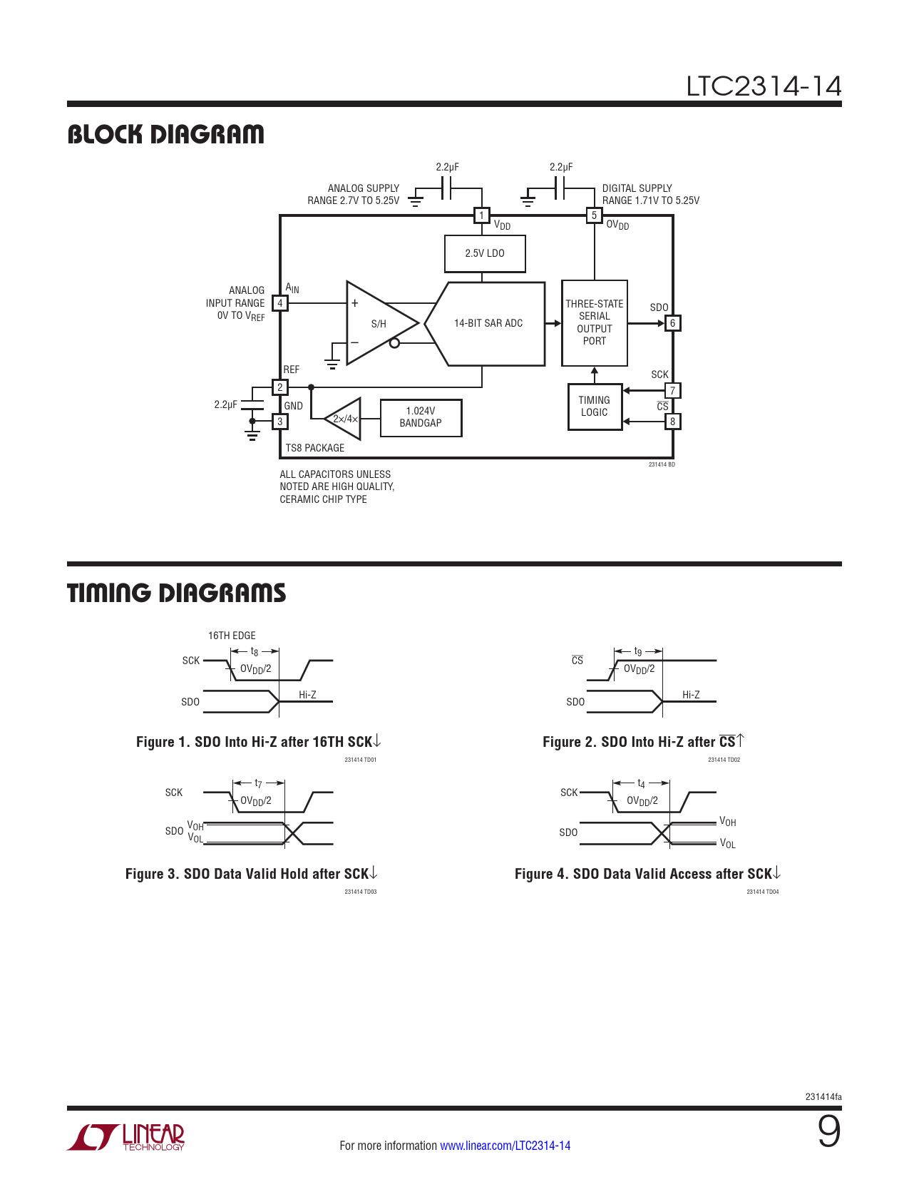 LTC2314-14 BLOCK DIAGRAM 2.2µF 2.2µF ANALOG SUPPLY DIGITAL SUPPLY RANGE 2.7V TO 5.25V RANGE 1.71V TO 5.25V 1 5 VDD OVDD 2.5V LDO A ANALOG IN INPUT RANGE 4 + THREE-STATE SDO 0V TO VREF SERIAL S/H 14-BIT SAR ADC 6 OUTPUT – PORT REF SCK 2 7 TIMING 2.2µF GND 1.024V CS 2×/4× LOGIC 3 BANDGAP 8 TS8 PACKAGE 231414 BD ALL CAPACITORS UNLESS NOTED ARE HIGH QUALITY, CERAMIC CHIP TYPE TIMING DIAGRAMS 16TH EDGE t8 t9 SCK CS OVDD/2 OVDD/2 Hi-Z Hi-Z SDO SDO Figure 1. SDO Into Hi-Z after 16TH SCK ↓ Figure 2. SDO Into Hi-Z after CS ↑ 231414 TD01 231414 TD02 t7 t4 SCK SCK OVDD/2 OVDD/2 V V OH OH SDO V SDO OL VOL Figure 3. SDO Data Valid Hold after SCK ↓ Figure 4. SDO Data Valid Access after SCK ↓ 231414 TD03 231414 TD04 231414fa For more information www.linear.com/LTC2314-14 9