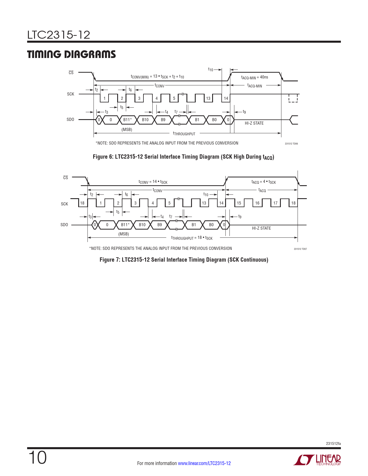 CS tCONV = 14 • tSCK tACQ = 4 • tSCK tCONV tACQ t2 t6 t10 SCK 18 1 2 3 4 5 13 14 15 16 17 18 t5 t3 t4 t7 t9 SDO 0 0 B11* B10 B9 B1 B0 0 HI-Z STATE (MSB) tTHROUGHPUT = 18 • tSCK *NOTE: SDO REPRESENTS THE ANALOG INPUT FROM THE PREVIOUS CONVERSION 231512 TD07