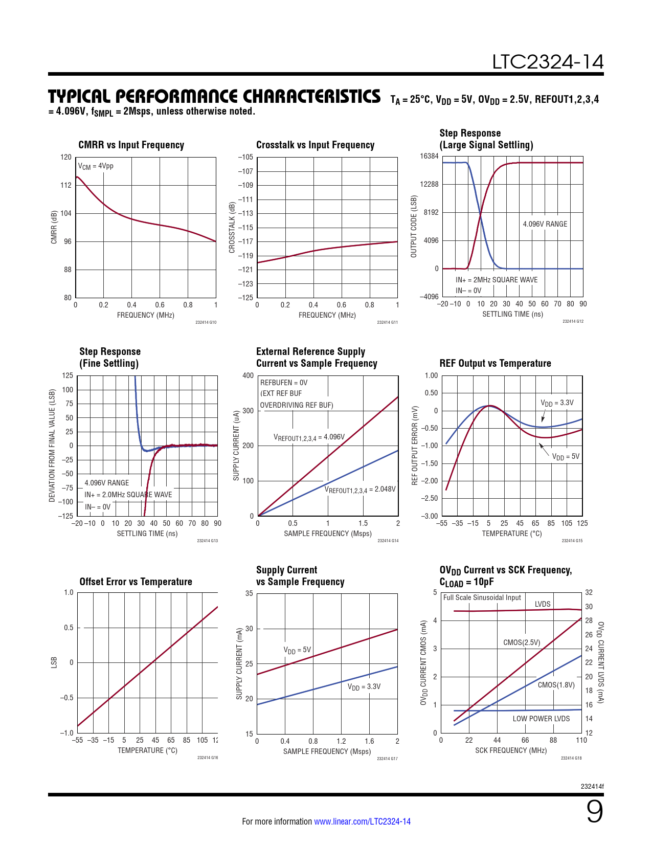 1.0 35 5 32 Full Scale Sinusoidal Input LVDS 30 4 28 OV 0.5 30 DD 26 CURRENT L CMOS(2.5V) VDD = 5V 3 24 0 LSB 25 22 VDS (mA) Y CURRENT (mA) 2 20 VDD = 3.3V CURRENT CMOS (mA) CMOS(1.8V) 18 –0.5 SUPPL 20 DD OV 1 16 LOW POWER LVDS 14 –1.0 15 0 12 –55 –35 –15 5 25 45 65 85 105 125 0 0.4 0.8 1.2 1.6 2 0 22 44 66 88 110 TEMPERATURE (°C) SAMPLE FREQUENCY (Msps) SCK FREQUENCY (MHz) 232414 G16 232414 G17 232414 G18 232414f For more information www.linear.com/LTC2324-14 9 Document Outline Features Applications Description Typical Application Absolute Maximum Ratings Pin Configuration Order Information Electrical Characteristics Converter Characteristics Dynamic Accuracy Internal Reference Characteristics Digital Inputs And Digital Outputs Power Requirements ADC Timing Characteristics Typical Performance Characteristics Pin Functions Functional Block Diagram Timing Diagram Applications Information Package Description Related Parts Features Applications Typical Application Description Absolute Maximum Ratings Order Information Pin Configuration Electrical Characteristics Converter Characteristics Dynamic Accuracy Internal Reference Characteristics Digital Inputs And Digital Outputs Power Requirements ADC Timing Characteristics ADC Timing Characteristics ADC Timing Characteristics Typical Performance Characteristics Pin Functions Pins that are the same for all digital I/O Modes CMOS data output option (CMOS/LVDS = low) LVDS data output option (CMOS/LVDS = high or FLOAT) Functional Block Diagram Timing Diagram Applications Information OVERVIEW CONVERTER OPERATION TRANSFER FUNCTION INPUT DRIVE CIRCUITS ADC REFERENCE DYNAMIC PERFORMANCE POWER CONSIDERATIONS TIMING AND CONTROL DIGITAL INTERFACE BOARD LAYOUT Package Description Typical Application Related Parts