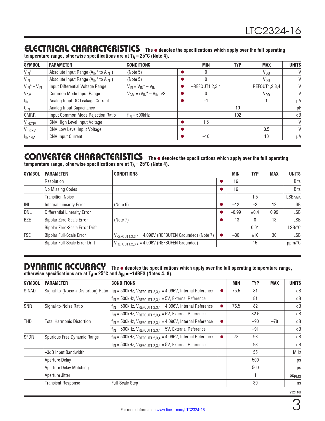 LTC2324-16 ELECTRICAL CHARACTERISTICSThe l denotes the specifications which apply over the full operatingtemperature range, otherwise specifications are at TA = 25°C (Note 4).SYMBOLPARAMETERCONDITIONSMINTYPMAXUNITS V + + – IN Absolute Input Range (AIN to AIN ) (Note 5) l 0 VDD V V – + – IN Absolute Input Range (AIN to AIN ) (Note 5) l 0 VDD V V + – + – IN – VIN Input Differential Voltage Range VIN = VIN – VIN l –REFOUT1,2,3,4 REFOUT1,2,3,4 V V + – CM Common Mode Input Range VCM = (VIN – VIN )/2 l 0 VDD V IIN Analog Input DC Leakage Current l –1 1 μA CIN Analog Input Capacitance 10 pF CMRR Input Common Mode Rejection Ratio fIN = 500kHz 102 dB VIHCNV CNV High Level Input Voltage l 1.5 V VILCNV CNV Low Level Input Voltage l 0.5 V IINCNV CNV Input Current l –10 10 μA CONVERTER CHARACTERISTICSThe l denotes the specifications which apply over the full operatingtemperature range, otherwise specifications are at TA = 25°C (Note 4).SYMBOL PARAMETERCONDITIONSMINTYPMAXUNITS Resolution l 16 Bits No Missing Codes l 16 Bits Transition Noise 1.5 LSBRMS INL Integral Linearity Error (Note 6) l –12 ±2 12 LSB DNL Differential Linearity Error l –0.99 ±0.4 0.99 LSB BZE Bipolar Zero-Scale Error (Note 7) l –13 0 13 LSB Bipolar Zero-Scale Error Drift 0.01 LSB/°C FSE Bipolar Full-Scale Error VREFOUT1,2,3,4 = 4.096V (REFBUFEN Grounded) (Note 7) l –30 ±10 30 LSB Bipolar Full-Scale Error Drift VREFOUT1,2,3,4 = 4.096V (REFBUFEN Grounded) 15 ppm/°C DYNAMIC ACCURACYThe l denotes the specifications which apply over the full operating temperature range,otherwise specifications are at TA = 25°C and AIN = –1dBFS (Notes 4, 8). SYMBOL PARAMETERCONDITIONSMINTYPMAXUNITS SINAD Signal-to-(Noise + Distortion) Ratio fIN = 500kHz, VREFOUT1,2,3,4 = 4.096V, Internal Reference l 75.5 81 dB fIN = 500kHz, VREFOUT1,2,3,4 = 5V, External Reference 81 dB SNR Signal-to-Noise Ratio fIN = 500kHz, VREFOUT1,2,3,4 = 4.096V, Internal Reference l 76.5 82 dB fIN = 500kHz, VREFOUT1,2,3,4 = 5V, External Reference 82.5 dB THD Total Harmonic Distortion fIN = 500kHz, VREFOUT1,2,3,4 = 4.096V, Internal Reference l –90 –78 dB fIN = 500kHz, VREFOUT1,2,3,4 = 5V, External Reference –91 dB SFDR Spurious Free Dynamic Range fIN = 500kHz, VREFOUT1,2,3,4 = 4.096V, Internal Reference l 78 93 dB fIN = 500kHz, VREFOUT1,2,3,4 = 5V, External Reference 93 dB –3dB Input Bandwidth 55 MHz Aperture Delay 500 ps Aperture Delay Matching 500 ps Aperture Jitter 1 psRMS Transient Response Full-Scale Step 30 ns 232416f For more information www.linear.com/LTC2324-16 3 Document Outline Features Applications Description Typical Application Absolute Maximum Ratings Pin Configuration Order Information Electrical Characteristics Converter Characteristics Dynamic Accuracy Internal Reference Characteristics Digital Inputs And Digital Outputs Power Requirements ADC Timing Characteristics Typical Performance Characteristics Pin Functions Functional Block Diagram Timing Diagram Applications Information Package Description Related Parts Features Applications Typical Application Description Absolute Maximum Ratings Order Information Pin Configuration Electrical Characteristics Converter Characteristics Dynamic Accuracy Internal Reference Characteristics Digital Inputs And Digital Outputs Power Requirements ADC Timing Characteristics ADC Timing Characteristics ADC Timing Characteristics Typical Performance Characteristics Pin Functions Functional Block Diagram Timing Diagram Applications Information Package Description Typical Application Related Parts