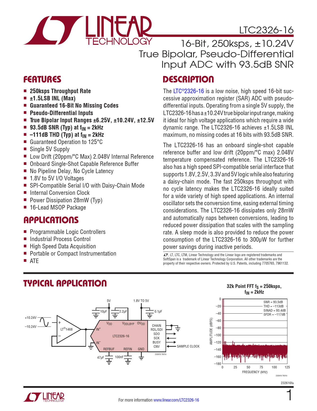 maximum, no missing codes at 16 bits with 93.5dB SNR. n Guaranteed Operation to 125°C The LTC2326-16 has an onboard single-shot capable n Single 5V Supply reference buffer and low drift (20ppm/°C max) 2.048V n Low Drift (20ppm/°C Max) 2.048V Internal Reference temperature compensated reference. The LTC2326-16 n Onboard Single-Shot Capable Reference Buffer also has a high speed SPI-compatible serial interface that n No Pipeline Delay, No Cycle Latency supports 1.8V, 2.5V, 3.3V and 5V logic while also featuring n 1.8V to 5V I/O Voltages a daisy-chain mode. The fast 250ksps throughput with n SPI-Compatible Serial I/O with Daisy-Chain Mode no cycle latency makes the LTC2326-16 ideally suited n Internal Conversion Clock for a wide variety of high speed applications. An internal n Power Dissipation 28mW (Typ) oscillator sets the conversion time, easing external timing n 16-Lead MSOP Package considerations. The LTC2326-16 dissipates only 28mW and automatically naps between conversions, leading to