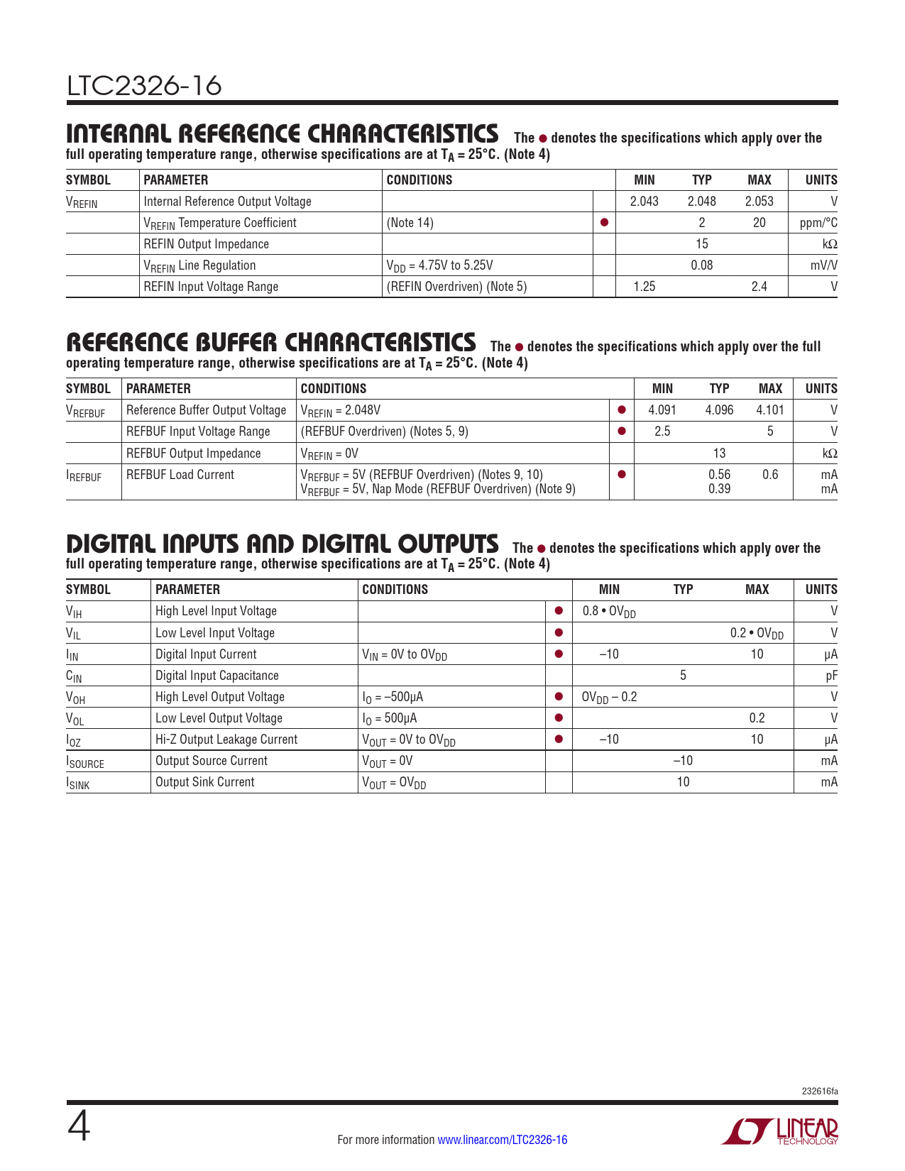 LTC2326-16 i nTernal reFerence characTerisTics The l denotes the specifications which apply over thefull operating temperature range, otherwise specifications are at TA = 25°C. (Note 4) SYMBOLPARAMETERCONDITIONSMINTYPMAXUNITS VREFIN Internal Reference Output Voltage 2.043 2.048 2.053 V VREFIN Temperature Coefficient (Note 14) l 2 20 ppm/°C REFIN Output Impedance 15 kΩ VREFIN Line Regulation VDD = 4.75V to 5.25V 0.08 mV/V REFIN Input Voltage Range (REFIN Overdriven) (Note 5) 1.25 2.4 V reFerence buFFer characTerisTics The l denotes the specifications which apply over the fulloperating temperature range, otherwise specifications are at TA = 25°C. (Note 4) SYMBOL PARAMETERCONDITIONSMINTYPMAXUNITS VREFBUF Reference Buffer Output Voltage VREFIN = 2.048V l 4.091 4.096 4.101 V REFBUF Input Voltage Range (REFBUF Overdriven) (Notes 5, 9) l 2.5 5 V REFBUF Output Impedance VREFIN = 0V 13 kΩ IREFBUF REFBUF Load Current VREFBUF = 5V (REFBUF Overdriven) (Notes 9, 10) l 0.56 0.6 mA VREFBUF = 5V, Nap Mode (REFBUF Overdriven) (Note 9) 0.39 mA DigiTal inpuTs anD DigiTal ouTpuTs The l denotes the specifications which apply over thefull operating temperature range, otherwise specifications are at TA = 25°C. (Note 4) SYMBOLPARAMETERCONDITIONSMINTYPMAXUNITS VIH High Level Input Voltage l 0.8 • OVDD V VIL Low Level Input Voltage l 0.2 • OVDD V IIN Digital Input Current VIN = 0V to OVDD l –10 10 μA CIN Digital Input Capacitance 5 pF VOH High Level Output Voltage IO = –500µA l OVDD – 0.2 V VOL Low Level Output Voltage IO = 500µA l 0.2 V IOZ Hi-Z Output Leakage Current VOUT = 0V to OVDD l –10 10 µA ISOURCE Output Source Current VOUT = 0V –10 mA ISINK Output Sink Current VOUT = OVDD 10 mA 232616fa 4 For more information www.linear.com/LTC2326-16 Document Outline Features Applications Typical Application Description Absolute Maximum Ratings Order Information Pin Configuration Electrical Characteristics Converter Characteristics Dynamic Accuracy Internal Reference Characteristics Reference Buffer Characteristics Digital Inputs and Digital Outputs Power Requirements ADC Timing Characteristics Typical Performance Characteristics Pin Functions Functional Block Diagram Timing Diagram Applications Information Board Layout Package Description Revision History Typical Application Related Parts