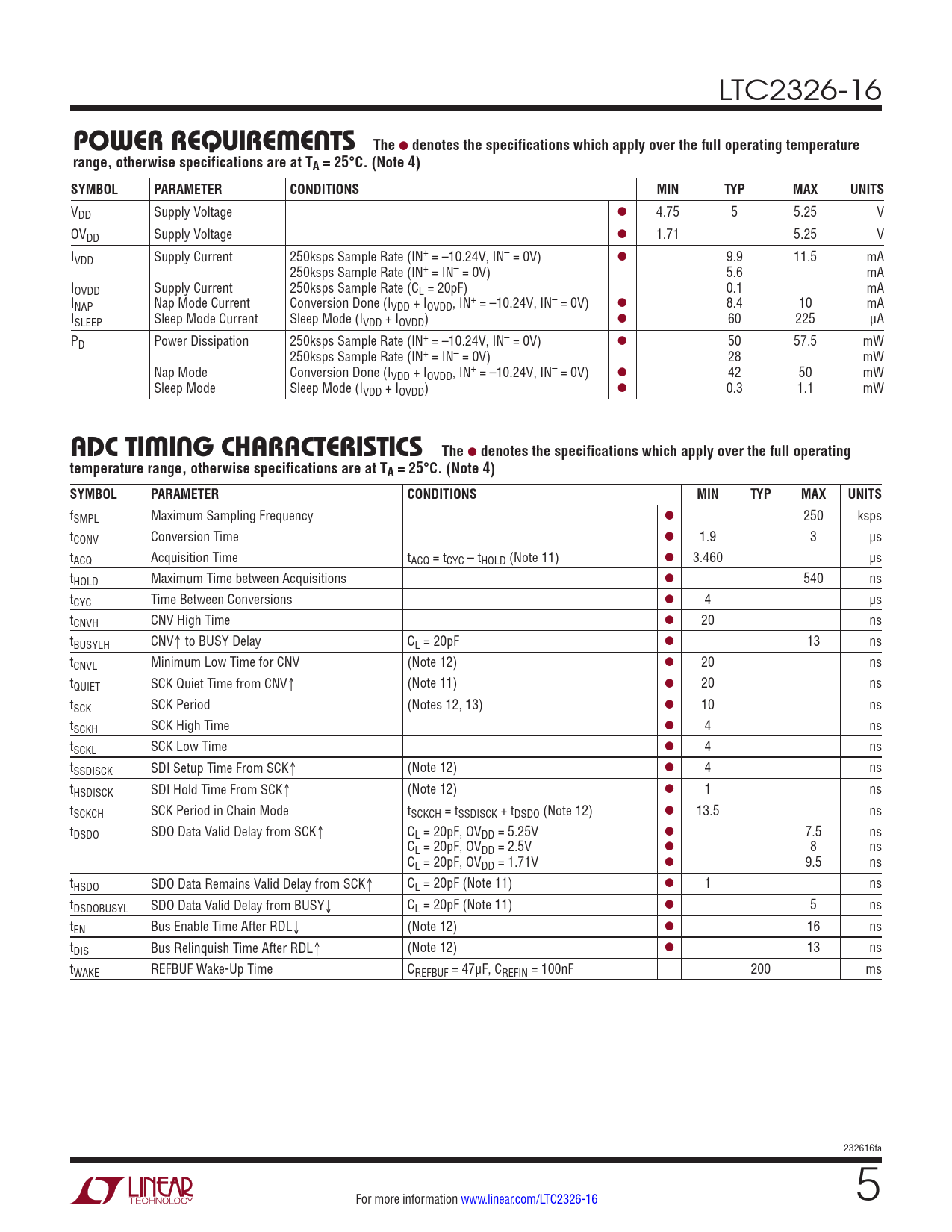 LTC2326-16 p ower requireMenTs The l denotes the specifications which apply over the full operating temperaturerange, otherwise specifications are at TA = 25°C. (Note 4)SYMBOLPARAMETERCONDITIONSMINTYPMAXUNITS VDD Supply Voltage l 4.75 5 5.25 V OVDD Supply Voltage l 1.71 5.25 V IVDD Supply Current 250ksps Sample Rate (IN+ = –10.24V, IN– = 0V) l 9.9 11.5 mA 250ksps Sample Rate (IN+ = IN– = 0V) 5.6 mA IOVDD Supply Current 250ksps Sample Rate (CL = 20pF) 0.1 mA INAP Nap Mode Current Conversion Done (IVDD + IOVDD, IN+ = –10.24V, IN– = 0V) l 8.4 10 mA ISLEEP Sleep Mode Current Sleep Mode (IVDD + IOVDD) l 60 225 μA PD Power Dissipation 250ksps Sample Rate (IN+ = –10.24V, IN– = 0V) l 50 57.5 mW 250ksps Sample Rate (IN+ = IN– = 0V) 28 mW Nap Mode Conversion Done (IVDD + IOVDD, IN+ = –10.24V, IN– = 0V) l 42 50 mW Sleep Mode Sleep Mode (IVDD + IOVDD) l 0.3 1.1 mW aDc TiMing characTerisTics The l denotes the specifications which apply over the full operatingtemperature range, otherwise specifications are at TA = 25°C. (Note 4) SYMBOLPARAMETERCONDITIONSMINTYPMAXUNITS fSMPL Maximum Sampling Frequency l 250 ksps tCONV Conversion Time l 1.9 3 µs tACQ Acquisition Time tACQ = tCYC – tHOLD (Note 11) l 3.460 µs tHOLD Maximum Time between Acquisitions l 540 ns tCYC Time Between Conversions l 4 µs tCNVH CNV High Time l 20 ns tBUSYLH CNV↑ to BUSY Delay CL = 20pF l 13 ns tCNVL Minimum Low Time for CNV (Note 12) l 20 ns tQUIET SCK Quiet Time from CNV↑ (Note 11) l 20 ns tSCK SCK Period (Notes 12, 13) l 10 ns tSCKH SCK High Time l 4 ns tSCKL SCK Low Time l 4 ns tSSDISCK SDI Setup Time From SCK↑ (Note 12) l 4 ns tHSDISCK SDI Hold Time From SCK↑ (Note 12) l 1 ns tSCKCH SCK Period in Chain Mode tSCKCH = tSSDISCK + tDSDO (Note 12) l 13.5 ns tDSDO SDO Data Valid Delay from SCK↑ CL = 20pF, OVDD = 5.25V l 7.5 ns CL = 20pF, OVDD = 2.5V l 8 ns CL = 20pF, OVDD = 1.71V l 9.5 ns tHSDO SDO Data Remains Valid Delay from SCK↑ CL = 20pF (Note 11) l 1 ns tDSDOBUSYL SDO Data Valid Delay from BUSY↓ CL = 20pF (Note 11) l 5 ns tEN Bus Enable Time After RDL↓ (Note 12) l 16 ns tDIS Bus Relinquish Time After RDL↑ (Note 12) l 13 ns tWAKE REFBUF Wake-Up Time CREFBUF = 47μF, CREFIN = 100nF 200 ms 232616fa For more information www.linear.com/LTC2326-16 5 Document Outline Features Applications Typical Application Description Absolute Maximum Ratings Order Information Pin Configuration Electrical Characteristics Converter Characteristics Dynamic Accuracy Internal Reference Characteristics Reference Buffer Characteristics Digital Inputs and Digital Outputs Power Requirements ADC Timing Characteristics Typical Performance Characteristics Pin Functions Functional Block Diagram Timing Diagram Applications Information Board Layout Package Description Revision History Typical Application Related Parts