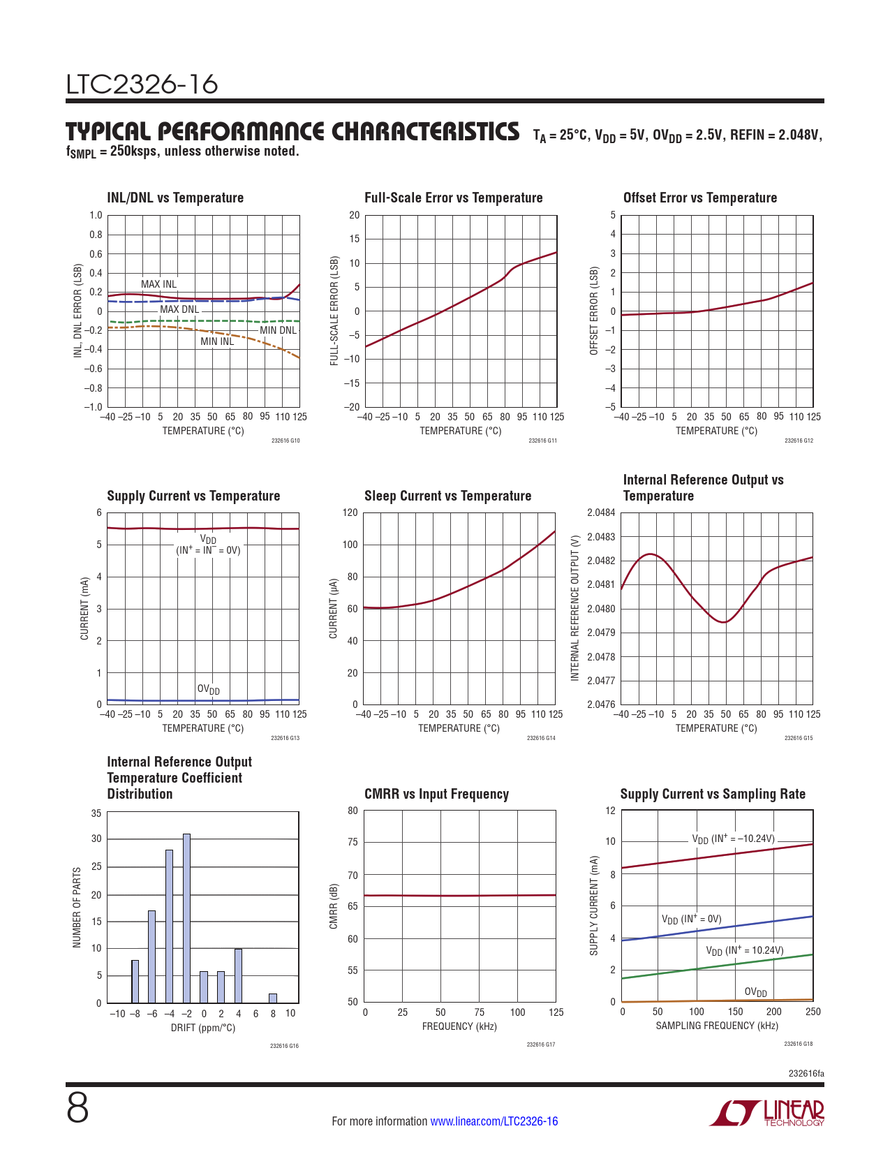 6 120 2.0484 2.0483 5 VDD 100 (IN+ = IN– = 0V) 2.0482 4 80 2.0481 3 60 2.0480 CURRENT (mA) CURRENT (µA) 2.0479 2 40 2.0478 1 20 INTERNAL REFERENCE OUTPUT (V) 2.0477 OVDD 0 0 2.0476 –40 –25 –10 5 20 35 50 65 80 95 110 125 –40 –25 –10 5 20 35 50 65 80 95 110 125 –40 –25 –10 5 20 35 50 65 80 95 110 125 TEMPERATURE (°C) TEMPERATURE (°C) TEMPERATURE (°C) 232616 G13 232616 G14 232616 G15