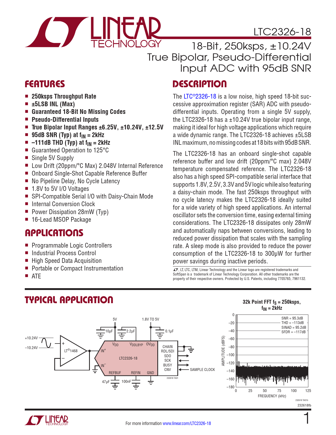 INL maximum, no missing codes at 18 bits with 95dB SNR. n Guaranteed Operation to 125°C The LTC2326-18 has an onboard single-shot capable n Single 5V Supply reference buffer and low drift (20ppm/°C max) 2.048V n Low Drift (20ppm/°C Max) 2.048V Internal Reference temperature compensated reference. The LTC2326-18 n Onboard Single-Shot Capable Reference Buffer also has a high speed SPI-compatible serial interface that n No Pipeline Delay, No Cycle Latency supports 1.8V, 2.5V, 3.3V and 5V logic while also featuring n 1.8V to 5V I/O Voltages a daisy-chain mode. The fast 250ksps throughput with n SPI-Compatible Serial I/O with Daisy-Chain Mode no cycle latency makes the LTC2326-18 ideally suited n Internal Conversion Clock for a wide variety of high speed applications. An internal n Power Dissipation 28mW (Typ) oscillator sets the conversion time, easing external timing n 16-Lead MSOP Package considerations. The LTC2326-18 dissipates only 28mW and automatically naps between conversions, leading to