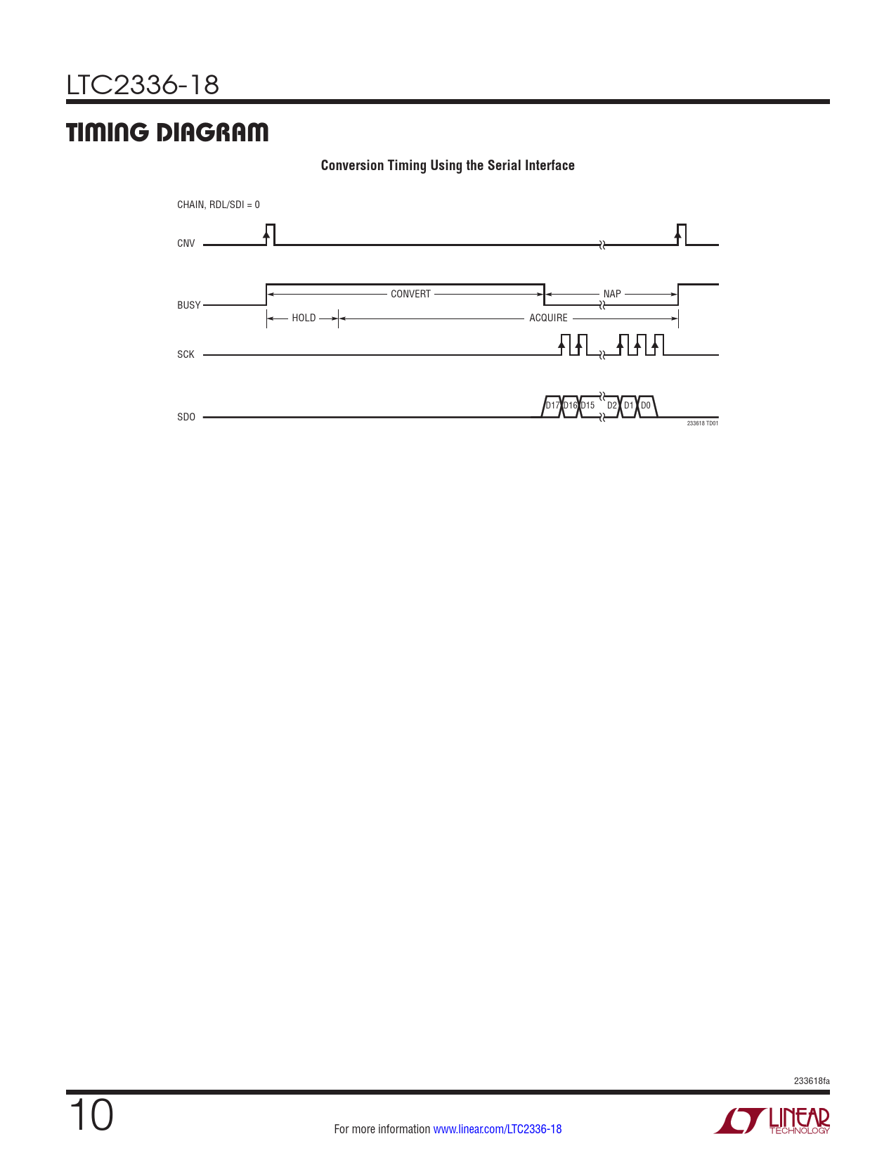 CHAIN, RDL/SDI = 0 CNV CONVERT NAP BUSY HOLD ACQUIRE SCK D17 D16 D15 D2 D1 D0 SDO 233618 TD01 233618fa 10 For more information www.linear.com/LTC2336-18 Document Outline Features Applications Typical Application Description Absolute Maximum Ratings Order Information Pin Configuration Electrical Characteristics Converter Characteristics Dynamic Accuracy Internal Reference Characteristics Reference Buffer Characteristics Digital Inputs and Digital Outputs Power Requirements ADC Timing Characteristics Typical Performance Characteristics Pin Functions Functional Block Diagram Timing Diagram Applications Information Board Layout Package Description Revision History Typical Application Related Parts