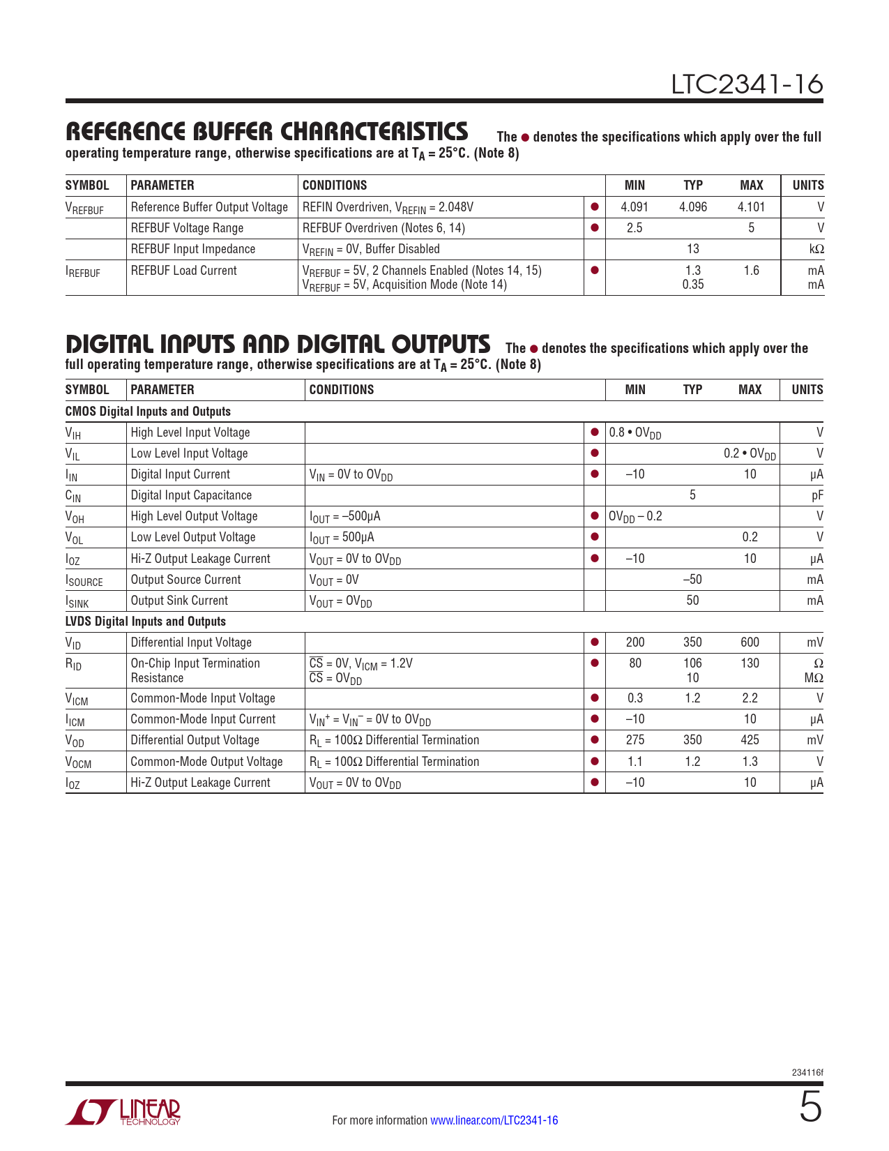 LTC2341-16 REFERENCE BUFFER CHARACTERISTICSThe l denotes the specifications which apply over the fulloperating temperature range, otherwise specifications are at TA = 25°C. (Note 8)SYMBOLPARAMETERCONDITIONSMINTYPMAXUNITS VREFBUF Reference Buffer Output Voltage REFIN Overdriven, VREFIN = 2.048V l 4.091 4.096 4.101 V REFBUF Voltage Range REFBUF Overdriven (Notes 6, 14) l 2.5 5 V REFBUF Input Impedance VREFIN = 0V, Buffer Disabled 13 kΩ IREFBUF REFBUF Load Current VREFBUF = 5V, 2 Channels Enabled (Notes 14, 15) l 1.3 1.6 mA VREFBUF = 5V, Acquisition Mode (Note 14) 0.35 mA DIGITAL INPUTS AND DIGITAL OUTPUTSThe l denotes the specifications which apply over thefull operating temperature range, otherwise specifications are at TA = 25°C. (Note 8) SYMBOLPARAMETERCONDITIONSMINTYPMAXUNITSCMOS Digital Inputs and Outputs VIH High Level Input Voltage l 0.8 • OVDD V VIL Low Level Input Voltage l 0.2 • OVDD V IIN Digital Input Current VIN = 0V to OVDD l –10 10 μA CIN Digital Input Capacitance 5 pF VOH High Level Output Voltage IOUT = –500μA l OVDD – 0.2 V VOL Low Level Output Voltage IOUT = 500μA l 0.2 V IOZ Hi-Z Output Leakage Current VOUT = 0V to OVDD l –10 10 μA ISOURCE Output Source Current VOUT = 0V –50 mA ISINK Output Sink Current VOUT = OVDD 50 mA LVDS Digital Inputs and Outputs VID Differential Input Voltage l 200 350 600 mV RID On-Chip Input Termination CS = 0V, VICM = 1.2V l 80 106 130 Ω Resistance CS = OVDD 10 MΩ VICM Common-Mode Input Voltage l 0.3 1.2 2.2 V I + – ICM Common-Mode Input Current VIN = VIN = 0V to OVDD l –10 10 μA VOD Differential Output Voltage RL = 100Ω Differential Termination l 275 350 425 mV VOCM Common-Mode Output Voltage RL = 100Ω Differential Termination l 1.1 1.2 1.3 V IOZ Hi-Z Output Leakage Current VOUT = 0V to OVDD l –10 10 μA 234116f For more information www.linear.com/LTC2341-16 5 Document Outline Features Applications Typical Application Description Absolute Maximum Ratings Order Information Pin Configuration Electrical Characteristics Converter Characteristics Dynamic Accuracy Internal Reference Characteristics Reference Buffer Characteristics Digital Inputs and Digital Outputs Power Requirements ADC Timing Characteristics Typical Performance Characteristics Pin Functions Configuration Tables Functional Block Diagram Timing Diagram Applications Information Board Layout Package Description Typical Application Related Parts