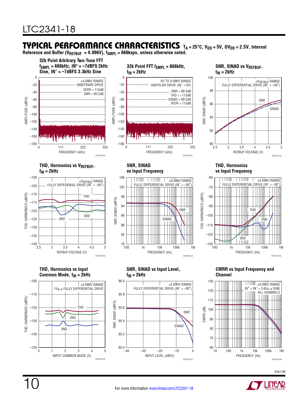 –100 106 –60 ±VREFBUF RANGE ±4.096V RANGE ±4.096V RANGE –105 FULLY DIFFERENIAL DRIVE (IN– = –IN+) FULLY DIFFERENTIAL DRIVE (IN– = –IN+) FULLY DIFFERENTIAL DRIVE (IN– = –IN+) 102 –70 –110 THD 98 –80 –115 94 –90 –120 SNR THD 3RD 90 –100 –125 2ND SINAD 2ND SNR, SINAD (dBFS) 86 –110 THD, HARMONICS (dBFS) –130 THD, HARMONICS (dBFS) –135 82 –120 3RD –140 78 –130 2.5 3 3.5 4 4.5 5 100 1k 10k 100k 1M 100 1k 10k 100k 1M REFBUF VOLTAGE (V) FREQUENCY (Hz) FREQUENCY (Hz) 234118 G13 234418 G14 234118 G15