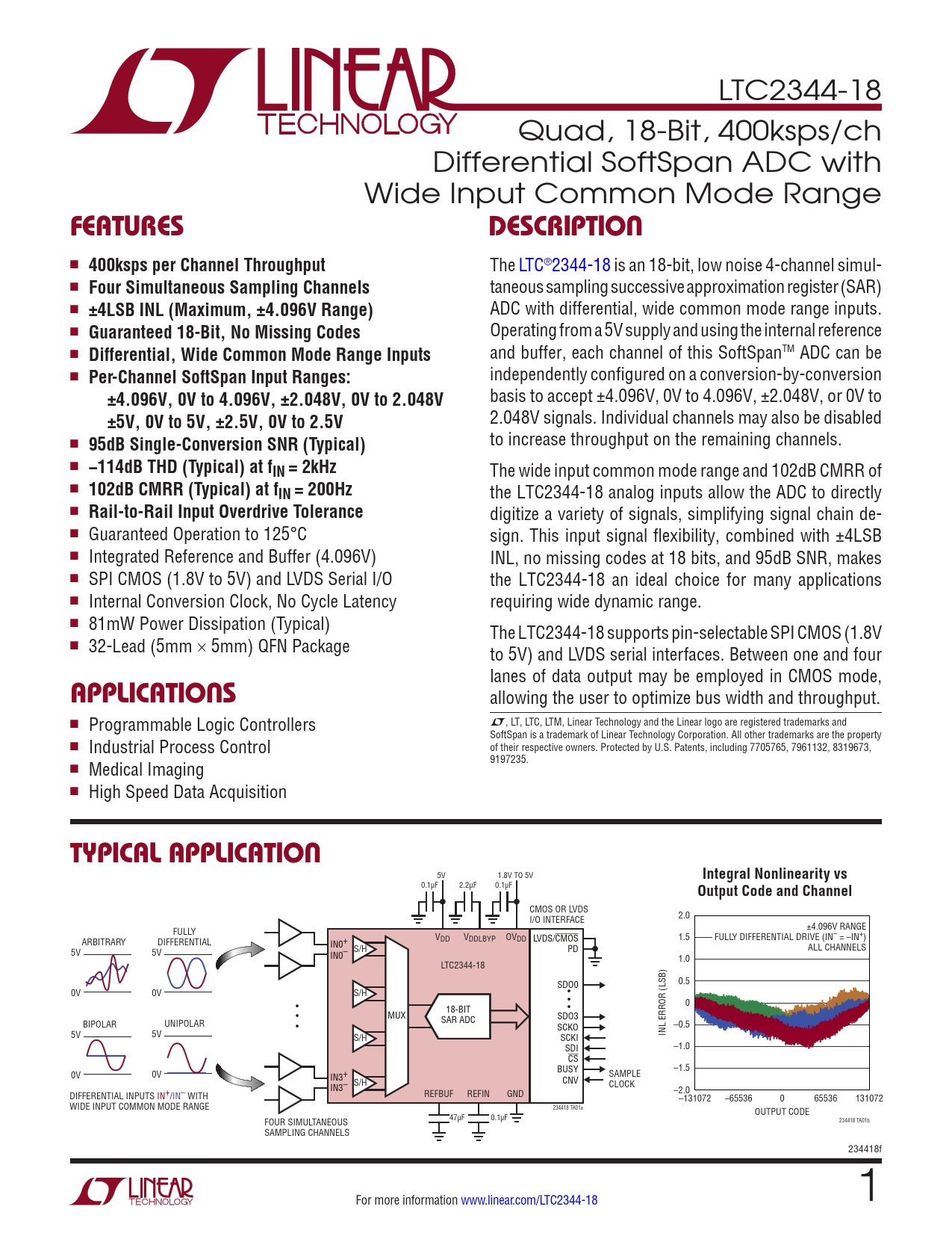 LTC2344-18 Quad, 18-Bit, 400ksps/ch Differential SoftSpan ADC with Wide Input Common Mode Range FEATURESDESCRIPTION n 400ksps per Channel Throughput The LTC®2344-18 is an 18-bit, low noise 4-channel simul- n Four Simultaneous Sampling Channels taneous sampling successive approximation register (SAR) n ±4LSB INL (Maximum, ±4.096V Range) ADC with differential, wide common mode range inputs. n Guaranteed 18-Bit, No Missing Codes Operating from a 5V supply and using the internal reference n Differential, Wide Common Mode Range Inputs and buffer, each channel of this SoftSpanTM ADC can be n Per-Channel SoftSpan Input Ranges: independently configured on a conversion-by-conversion ±4.096V, 0V to 4.096V, ±2.048V, 0V to 2.048V basis to accept ±4.096V, 0V to 4.096V, ±2.048V, or 0V to ±5V, 0V to 5V, ±2.5V, 0V to 2.5V 2.048V signals. Individual channels may also be disabled n to increase throughput on the remaining channels. 95dB Single-Conversion SNR (Typical) n −114dB THD (Typical) at fIN = 2kHz The wide input common mode range and 102dB CMRR of n 102dB CMRR (Typical) at fIN = 200Hz the LTC2344-18 analog inputs allow the ADC to directly n Rail-to-Rail Input Overdrive Tolerance digitize a variety of signals, simplifying signal chain de- n Guaranteed Operation to 125°C sign. This input signal flexibility, combined with ±4LSB n Integrated Reference and Buffer (4.096V) INL, no missing codes at 18 bits, and 95dB SNR, makes n SPI CMOS (1.8V to 5V) and LVDS Serial I/O the LTC2344-18 an ideal choice for many applications n Internal Conversion Clock, No Cycle Latency requiring wide dynamic range. n 81mW Power Dissipation (Typical) The LTC2344-18 supports pin-selectable SPI CMOS (1.8V n 32-Lead (5mm × 5mm) QFN Package to 5V) and LVDS serial interfaces. Between one and four lanes of data output may be employed in CMOS mode, APPLICATIONS allowing the user to optimize bus width and throughput. L n , LT, LTC, LTM, Linear Technology and the Linear logo are registered trademarks and Programmable Logic Controllers SoftSpan is a trademark of Linear Technology Corporation. All other trademarks are the property n of their respective owners. Protected by U.S. Patents, including 7705765, 7961132, 8319673, Industrial Process Control 9197235. n Medical Imaging n High Speed Data Acquisition TYPICAL APPLICATION 5V 1.8V TO 5V Integral Nonlinearity vs 0.1µF 2.2µF 0.1µF Output Code and Channel CMOS OR LVDS 2.0 I/O INTERFACE ±4.096V RANGE FULLY VDD VDDLBYP OVDD LVDS/CMOS 1.5 FULLY DIFFERENTIAL DRIVE (IN– = –IN+) ARBITRARY DIFFERENTIAL IN0+ S/H PD ALL CHANNELS 5V 5V IN0– 1.0 LTC2344-18 0.5 SDO0 • • • 0V 0V S/H • • • 0 18-BIT MUX SDO3 BIPOLAR UNIPOLAR SAR ADC –0.5 SCKO 5V INL ERROR (LSB) 5V S/H SCKI SDI –1.0 CS BUSY –1.5 0V 0V SAMPLE IN3+ S/H CNV CLOCK IN3– –2.0 DIFFERENTIAL INPUTS IN+/IN– WITH REFBUF REFIN GND –131072 –65536 0 65536 131072 WIDE INPUT COMMON MODE RANGE 234418 TA01a OUTPUT CODE 47µF 0.1µF 234418 TA01b FOUR SIMULTANEOUS SAMPLING CHANNELS 234418f For more information www.linear.com/LTC2344-18 1 Document Outline Features Applications Typical Application Description Absolute Maximum Ratings Order Information Pin Configuration Electrical Characteristics Converter Characteristics Dynamic Accuracy Internal Reference Characteristics Reference Buffer Characteristics Digital Inputs and Digital Outputs Power Requirements ADC Timing Characteristics Typical Performance Characteristics Pin Functions Configuration Tables Functional Block Diagram Timing Diagram Applications Information Board Layout Package Description Typical Application Related Parts
