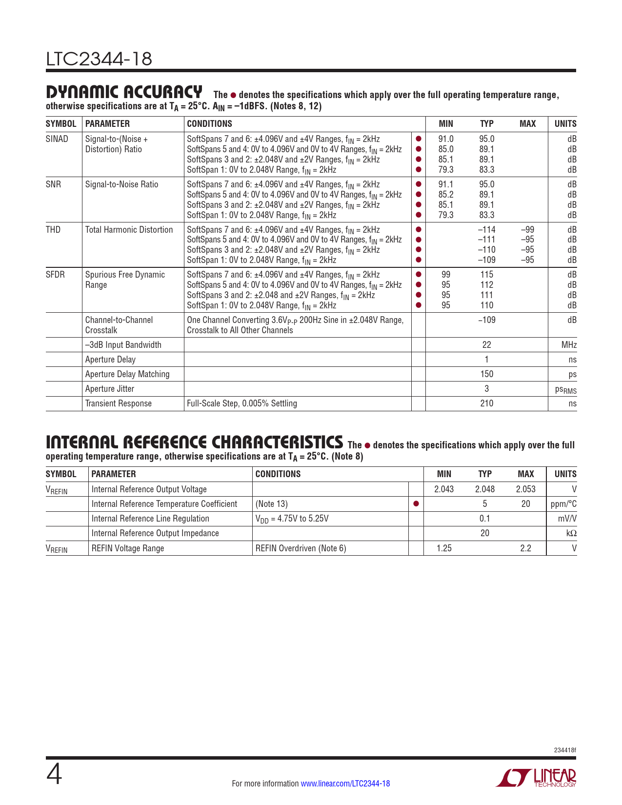 LTC2344-18 DYNAMICACCURACY The l denotes the specifications which apply over the full operating temperature range,otherwise specifications are at TA = 25°C. AIN = –1dBFS. (Notes 8, 12) SYMBOL PARAMETERCONDITIONSMINTYPMAXUNITS SINAD Signal-to-(Noise + SoftSpans 7 and 6: ±4.096V and ±4V Ranges, fIN = 2kHz l 91.0 95.0 dB Distortion) Ratio SoftSpans 5 and 4: 0V to 4.096V and 0V to 4V Ranges, fIN = 2kHz l 85.0 89.1 dB SoftSpans 3 and 2: ±2.048V and ±2V Ranges, fIN = 2kHz l 85.1 89.1 dB SoftSpan 1: 0V to 2.048V Range, fIN = 2kHz l 79.3 83.3 dB SNR Signal-to-Noise Ratio SoftSpans 7 and 6: ±4.096V and ±4V Ranges, fIN = 2kHz l 91.1 95.0 dB SoftSpans 5 and 4: 0V to 4.096V and 0V to 4V Ranges, fIN = 2kHz l 85.2 89.1 dB SoftSpans 3 and 2: ±2.048V and ±2V Ranges, fIN = 2kHz l 85.1 89.1 dB SoftSpan 1: 0V to 2.048V Range, fIN = 2kHz l 79.3 83.3 dB THD Total Harmonic Distortion SoftSpans 7 and 6: ±4.096V and ±4V Ranges, fIN = 2kHz l –114 –99 dB SoftSpans 5 and 4: 0V to 4.096V and 0V to 4V Ranges, fIN = 2kHz l –111 –95 dB SoftSpans 3 and 2: ±2.048V and ±2V Ranges, fIN = 2kHz l –110 –95 dB SoftSpan 1: 0V to 2.048V Range, fIN = 2kHz l –109 –95 dB SFDR Spurious Free Dynamic SoftSpans 7 and 6: ±4.096V and ±4V Ranges, fIN = 2kHz l 99 115 dB Range SoftSpans 5 and 4: 0V to 4.096V and 0V to 4V Ranges, fIN = 2kHz l 95 112 dB SoftSpans 3 and 2: ±2.048 and ±2V Ranges, fIN = 2kHz l 95 111 dB SoftSpan 1: 0V to 2.048V Range, fIN = 2kHz l 95 110 dB Channel-to-Channel One Channel Converting 3.6VP-P 200Hz Sine in ±2.048V Range, −109 dB Crosstalk Crosstalk to All Other Channels –3dB Input Bandwidth 22 MHz Aperture Delay 1 ns Aperture Delay Matching 150 ps Aperture Jitter 3 psRMS Transient Response Full-Scale Step, 0.005% Settling 210 ns INTERNAL REFERENCE CHARACTERISTICSThe l denotes the specifications which apply over the fulloperating temperature range, otherwise specifications are at TA = 25°C. (Note 8) SYMBOLPARAMETERCONDITIONSMINTYPMAXUNITS VREFIN Internal Reference Output Voltage 2.043 2.048 2.053 V Internal Reference Temperature Coefficient (Note 13) l 5 20 ppm/°C Internal Reference Line Regulation VDD = 4.75V to 5.25V 0.1 mV/V Internal Reference Output Impedance 20 kΩ VREFIN REFIN Voltage Range REFIN Overdriven (Note 6) 1.25 2.2 V 234418f 4 For more information www.linear.com/LTC2344-18 Document Outline Features Applications Typical Application Description Absolute Maximum Ratings Order Information Pin Configuration Electrical Characteristics Converter Characteristics Dynamic Accuracy Internal Reference Characteristics Reference Buffer Characteristics Digital Inputs and Digital Outputs Power Requirements ADC Timing Characteristics Typical Performance Characteristics Pin Functions Configuration Tables Functional Block Diagram Timing Diagram Applications Information Board Layout Package Description Typical Application Related Parts