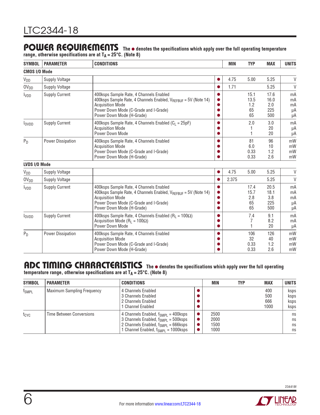 LTC2344-18 POWERREQUIREMENTS The l denotes the specifications which apply over the full operating temperaturerange, otherwise specifications are at TA = 25°C. (Note 8) SYMBOL PARAMETERCONDITIONSMINTYPMAXUNITSCMOS I/O Mode VDD Supply Voltage l 4.75 5.00 5.25 V OVDD Supply Voltage l 1.71 5.25 V IVDD Supply Current 400ksps Sample Rate, 4 Channels Enabled l 15.1 17.6 mA 400ksps Sample Rate, 4 Channels Enabled, VREFBUF = 5V (Note 14) l 13.5 16.0 mA Acquisition Mode l 1.2 2.0 mA Power Down Mode (C-Grade and I-Grade) l 65 225 μA Power Down Mode (H-Grade) l 65 500 µA IOVDD Supply Current 400ksps Sample Rate, 4 Channels Enabled (CL = 25pF) l 2.0 3.0 mA Acquisition Mode l 1 20 μA Power Down Mode l 1 20 μA PD Power Dissipation 400ksps Sample Rate, 4 Channels Enabled l 81 96 mW Acquisition Mode l 6.0 10 mW Power Down Mode (C-Grade and I-Grade) l 0.33 1.2 mW Power Down Mode (H-Grade) l 0.33 2.6 mW LVDS I/O Mode VDD Supply Voltage l 4.75 5.00 5.25 V OVDD Supply Voltage l 2.375 5.25 V IVDD Supply Current 400ksps Sample Rate, 4 Channels Enabled l 17.4 20.5 mA 400ksps Sample Rate, 4 Channels Enabled, VREFBUF = 5V (Note 14) l 15.7 18.1 mA Acquisition Mode l 2.8 3.8 mA Power Down Mode (C-Grade and I-Grade) l 65 225 μA Power Down Mode (H-Grade) l 65 500 µA IOVDD Supply Current 400ksps Sample Rate, 4 Channels Enabled (RL = 100Ω) l 7.4 9.1 mA Acquisition Mode (RL = 100Ω) l 7 8.2 mA Power Down Mode l 1 20 μA PD Power Dissipation 400ksps Sample Rate, 4 Channels Enabled l 106 126 mW Acquisition Mode l 32 40 mW Power Down Mode (C-Grade and I-Grade) l 0.33 1.2 mW Power Down Mode (H-Grade) l 0.33 2.6 mW ADCTIMING CHARACTERISTICS The l denotes the specifications which apply over the full operatingtemperature range, otherwise specifications are at TA = 25°C. (Note 8)SYMBOLPARAMETERCONDITIONSMINTYPMAXUNITS fSMPL Maximum Sampling Frequency 4 Channels Enabled l 400 ksps 3 Channels Enabled l 500 ksps 2 Channels Enabled l 666 ksps 1 Channel Enabled l 1000 ksps tCYC Time Between Conversions 4 Channels Enabled, fSMPL = 400ksps l 2500 ns 3 Channels Enabled, fSMPL = 500ksps l 2000 ns 2 Channels Enabled, fSMPL = 666ksps l 1500 ns 1 Channel Enabled, fSMPL = 1000ksps l 1000 ns 234418f 6 For more information www.linear.com/LTC2344-18 Document Outline Features Applications Typical Application Description Absolute Maximum Ratings Order Information Pin Configuration Electrical Characteristics Converter Characteristics Dynamic Accuracy Internal Reference Characteristics Reference Buffer Characteristics Digital Inputs and Digital Outputs Power Requirements ADC Timing Characteristics Typical Performance Characteristics Pin Functions Configuration Tables Functional Block Diagram Timing Diagram Applications Information Board Layout Package Description Typical Application Related Parts