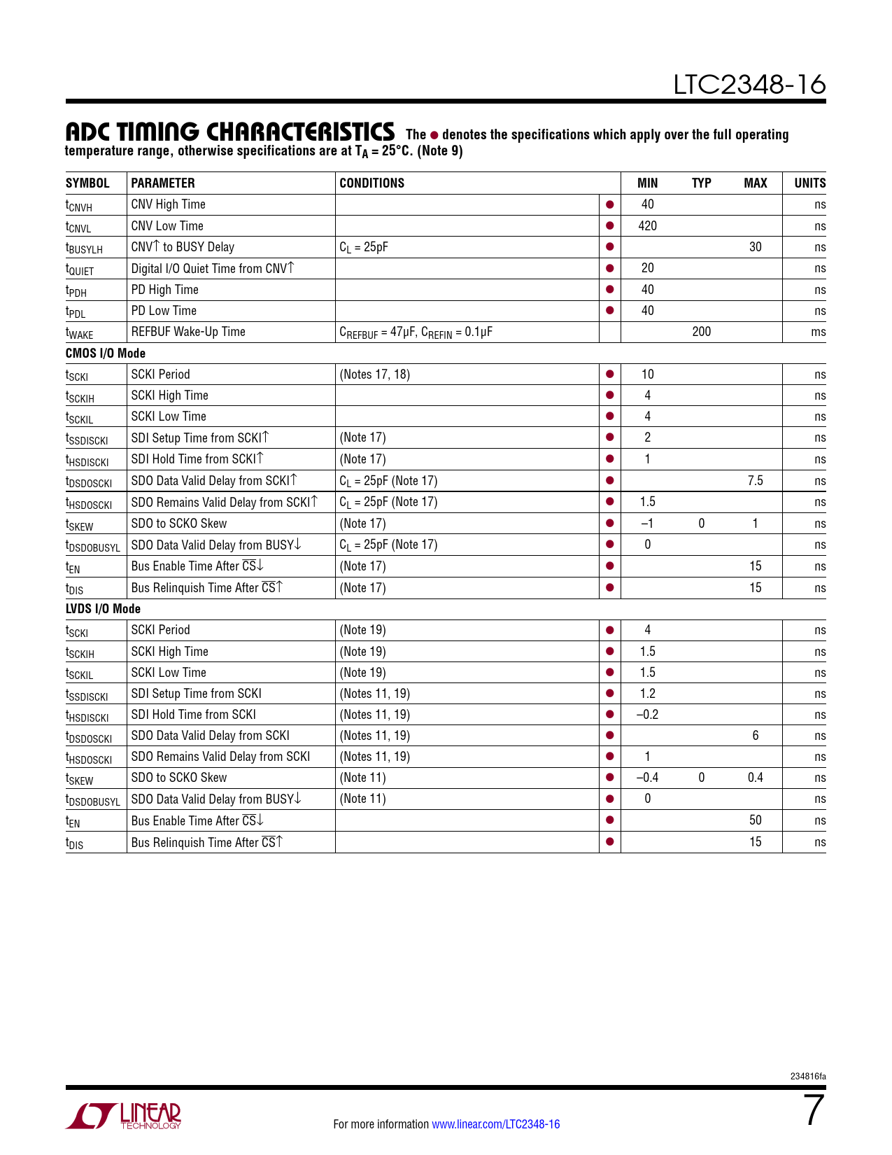 LTC2348-16 aDc TiMing characTerisTics The l denotes the specifications which apply over the full operatingtemperature range, otherwise specifications are at TA = 25°C. (Note 9)SYMBOLPARAMETERCONDITIONSMINTYPMAXUNITS tCNVH CNV High Time l 40 ns tCNVL CNV Low Time l 420 ns tBUSYLH CNV↑ to BUSY Delay CL = 25pF l 30 ns tQUIET Digital I/O Quiet Time from CNV↑ l 20 ns tPDH PD High Time l 40 ns tPDL PD Low Time l 40 ns tWAKE REFBUF Wake-Up Time CREFBUF = 47μF, CREFIN = 0.1μF 200 ms CMOS I/O Mode tSCKI SCKI Period (Notes 17, 18) l 10 ns tSCKIH SCKI High Time l 4 ns tSCKIL SCKI Low Time l 4 ns tSSDISCKI SDI Setup Time from SCKI↑ (Note 17) l 2 ns tHSDISCKI SDI Hold Time from SCKI↑ (Note 17) l 1 ns tDSDOSCKI SDO Data Valid Delay from SCKI↑ CL = 25pF (Note 17) l 7.5 ns tHSDOSCKI SDO Remains Valid Delay from SCKI↑ CL = 25pF (Note 17) l 1.5 ns tSKEW SDO to SCKO Skew (Note 17) l –1 0 1 ns tDSDOBUSYL SDO Data Valid Delay from BUSY↓ CL = 25pF (Note 17) l 0 ns tEN Bus Enable Time After CS↓ (Note 17) l 15 ns tDIS Bus Relinquish Time After CS↑ (Note 17) l 15 ns LVDS I/O Mode tSCKI SCKI Period (Note 19) l 4 ns tSCKIH SCKI High Time (Note 19) l 1.5 ns tSCKIL SCKI Low Time (Note 19) l 1.5 ns tSSDISCKI SDI Setup Time from SCKI (Notes 11, 19) l 1.2 ns tHSDISCKI SDI Hold Time from SCKI (Notes 11, 19) l –0.2 ns tDSDOSCKI SDO Data Valid Delay from SCKI (Notes 11, 19) l 6 ns tHSDOSCKI SDO Remains Valid Delay from SCKI (Notes 11, 19) l 1 ns tSKEW SDO to SCKO Skew (Note 11) l –0.4 0 0.4 ns tDSDOBUSYL SDO Data Valid Delay from BUSY↓ (Note 11) l 0 ns tEN Bus Enable Time After CS↓ l 50 ns tDIS Bus Relinquish Time After CS↑ l 15 ns 234816fa For more information www.linear.com/LTC2348-16 7 Document Outline Features Description Applications Typical Application Absolute Maximum Ratings Pin Configuration Order Information Electrical Characteristics Converter Characteristics Dynamic Accuracy Internal Reference Characteristics Reference Buffer Characteristics Digital Inputs and Digital Outputs Power Requirements ADC Timing Characteristics Typical Performance Characteristics Pin Functions Configuration Tables Functional Block Diagram Timing Diagram Applications Information Board Layout Package Description Revision History Typical Application Related Parts