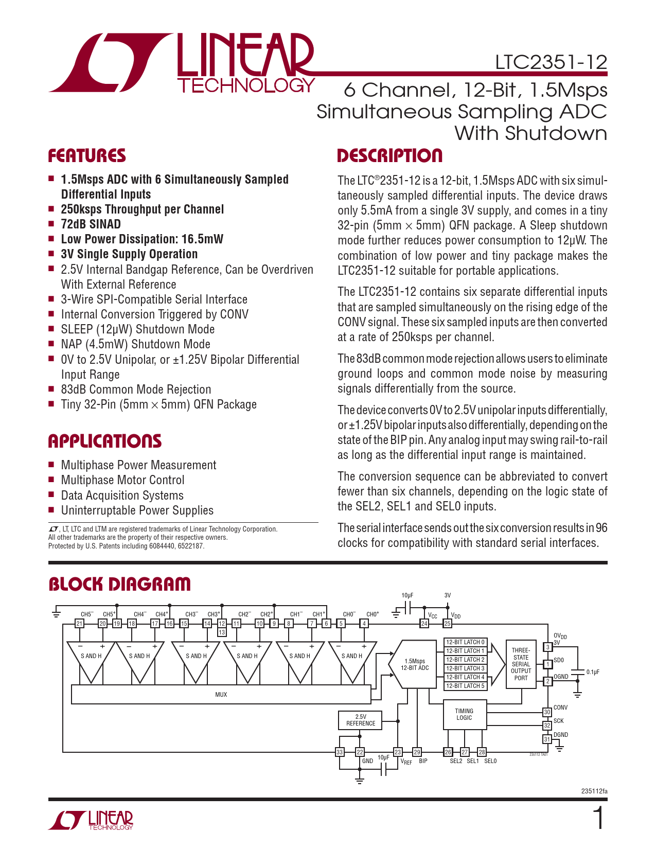 10μF 3V CH4– CH4+ CH5– CH5+ CH2– CH2+ CH3– CH3+ CH0– CH0+ CH1– CH1+ VCC VDD 21 20 19 18 17 16 15 14 12 11 10 9 8 7 6 5 4 24 25 13 OVDD + + + + + + 12-BIT LATCH 0 – 3V – – – – – 3 12-BIT LATCH 1 THREE- S AND H S AND H S AND H S AND H S AND H S AND H STATE 1.5Msps 12-BIT LATCH 2 SD0 SERIAL 1 12-BIT ADC 12-BIT LATCH 3 OUTPUT 0.1μF 12-BIT LATCH 4 OGND PORT 2 12-BIT LATCH 5 MUX CONV TIMING 30 2.5V LOGIC REFERENCE SCK 32 DGND 31 33 22 23 29 26 27 28 10μF 235112 TA01 GND VREF BIP SEL2 SEL1 SEL0 235112fa 1