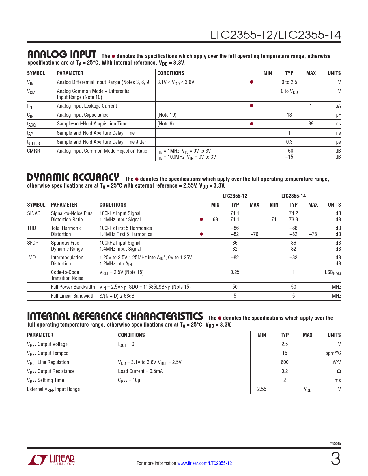 denotes the specifications which apply over the full operating temperature range, otherwise specifications are at TA = 25°C with external reference = 2.55V. VDD = 3.3V. LTC2355-12 LTC2355-14 SYMBOL PARAMETER CONDITIONS MIN TYP MAX MIN TYP MAX UNITS