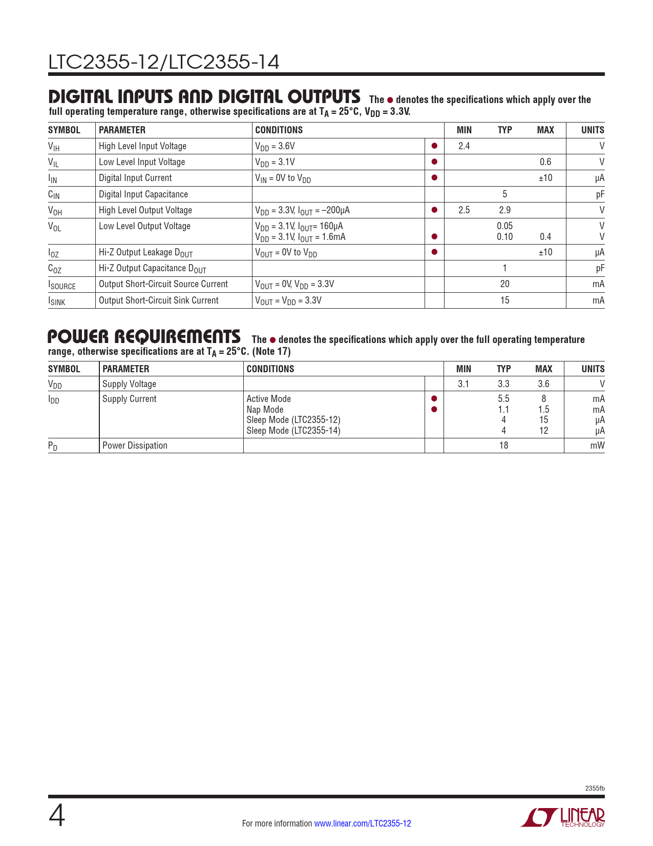 LTC2355-12/LTC2355-14 DIGITAL INPUTS AND DIGITAL OUTPUTSThe l denotes the specifications which apply over thefull operating temperature range, otherwise specifications are at TA = 25°C, VDD = 3.3V.SYMBOLPARAMETERCONDITIONSMINTYPMAXUNITS VIH High Level Input Voltage VDD = 3.6V l 2.4 V VIL Low Level Input Voltage VDD = 3.1V l 0.6 V IIN Digital Input Current VIN = 0V to VDD l ±10 µA CIN Digital Input Capacitance 5 pF VOH High Level Output Voltage VDD = 3.3V, IOUT = –200µA l 2.5 2.9 V VOL Low Level Output Voltage VDD = 3.1V, IOUT= 160µA 0.05 V VDD = 3.1V, IOUT = 1.6mA l 0.10 0.4 V IOZ Hi-Z Output Leakage DOUT VOUT = 0V to VDD l ±10 µA COZ Hi-Z Output Capacitance DOUT 1 pF ISOURCE Output Short-Circuit Source Current VOUT = 0V, VDD = 3.3V 20 mA ISINK Output Short-Circuit Sink Current VOUT = VDD = 3.3V 15 mA POWER REQUIREMENTSThe l denotes the specifications which apply over the full operating temperaturerange, otherwise specifications are at TA = 25°C. (Note 17) SYMBOLPARAMETERCONDITIONSMINTYPMAXUNITS VDD Supply Voltage 3.1 3.3 3.6 V IDD Supply Current Active Mode l 5.5 8 mA Nap Mode l 1.1 1.5 mA Sleep Mode (LTC2355-12) 4 15 µA Sleep Mode (LTC2355-14) 4 12 µA PD Power Dissipation 18 mW 2355fb 4 For more information www.linear.com/LTC2355-12 Document Outline Features Description Applications Block Diagram Absolute Maximum Ratings Pin Configuration Order Information Converter Characteristics Analog Input Dynamic Accuracy Internal Reference Characteristics Digital Inputs and Digital Outputs Power Requirements Timing Characteristics Typical Performance Characteristics Pin Functions Block Diagram Timing Diagram Applications Information Package Description Revision History Typical Application Related Parts