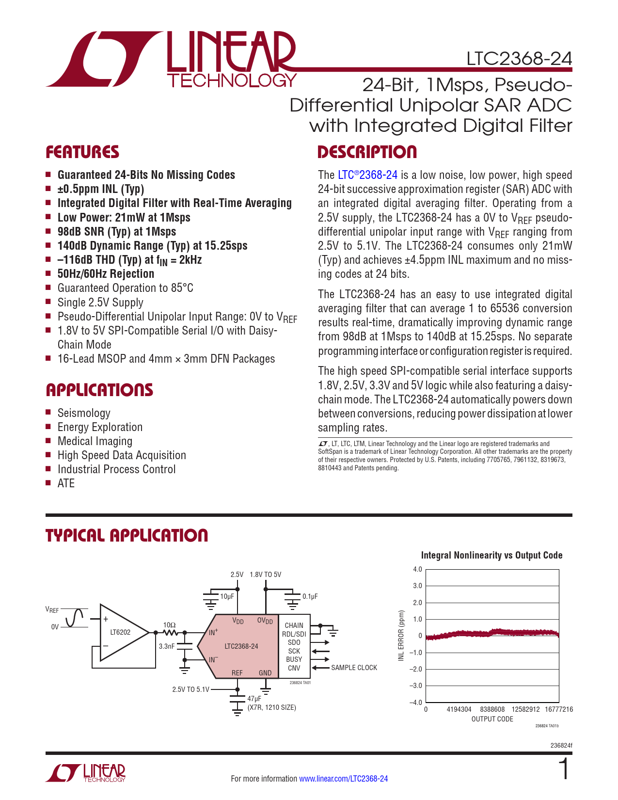 LTC2368-24 24-Bit, 1Msps, Pseudo- Differential Unipolar SAR ADC with Integrated Digital Filter FEATURESDESCRIPTION n Guaranteed 24-Bits No Missing Codes The LTC®2368-24 is a low noise, low power, high speed n ±0.5ppm INL (Typ) 24-bit successive approximation register (SAR) ADC with n Integrated Digital Filter with Real-Time Averaging an integrated digital averaging filter. Operating from a n Low Power: 21mW at 1Msps 2.5V supply, the LTC2368-24 has a 0V to VREF pseudo- n 98dB SNR (Typ) at 1Msps differential unipolar input range with VREF ranging from n 140dB Dynamic Range (Typ) at 15.25sps 2.5V to 5.1V. The LTC2368-24 consumes only 21mW n –116dB THD (Typ) at fIN = 2kHz (Typ) and achieves ±4.5ppm INL maximum and no miss- n 50Hz/60Hz Rejection ing codes at 24 bits. n Guaranteed Operation to 85°C The LTC2368-24 has an easy to use integrated digital n Single 2.5V Supply averaging filter that can average 1 to 65536 conversion n Pseudo-Differential Unipolar Input Range: 0V to VREF results real-time, dramatically improving dynamic range n 1.8V to 5V SPI-Compatible Serial I/O with Daisy- from 98dB at 1Msps to 140dB at 15.25sps. No separate Chain Mode programming interface or configuration register is required. n 16-Lead MSOP and 4mm × 3mm DFN Packages The high speed SPI-compatible serial interface supports 1.8V, 2.5V, 3.3V and 5V logic while also featuring a daisy- APPLICATIONS chain mode. The LTC2368-24 automatically powers down n Seismology between conversions, reducing power dissipation at lower n Energy Exploration sampling rates. n Medical Imaging L, LT, LTC, LTM, Linear Technology and the Linear logo are registered trademarks and SoftSpan is a trademark of Linear Technology Corporation. All other trademarks are the property n High Speed Data Acquisition of their respective owners. Protected by U.S. Patents, including 7705765, 7961132, 8319673, n Industrial Process Control 8810443 and Patents pending. n ATE TYPICAL APPLICATIONIntegral Nonlinearity vs Output Code 4.0 2.5V 1.8V TO 5V 3.0 10µF 0.1µF 2.0 VREF + V 1.0 10Ω DD OVDD 0V CHAIN LT6202 IN+ RDL/SDI 0 – 3.3nF SDO LTC2368-24 SCK –1.0 IN– BUSY INL ERROR (ppm) CNV SAMPLE CLOCK –2.0 REF GND 236824 TA01 –3.0 2.5V TO 5.1V 47µF –4.0 (X7R, 1210 SIZE) 0 4194304 8388608 12582912 16777216 OUTPUT CODE 236824 TA01b 236824f For more information www.linear.com/LTC2368-24 1 Document Outline Features Applications Description Typical Application Absolute Maximum Ratings Pin Configuration Order Information Electrical Characteristics Converter Characteristics Dynamic Accuracy Reference Input Digital Inputs and Digital Outputs Power Requirements ADC Timing Characteristics Typical Performance Characteristics Pin Functions Functional Block Diagram Timing Diagram Applications Information Package Description Typical Application Related Parts