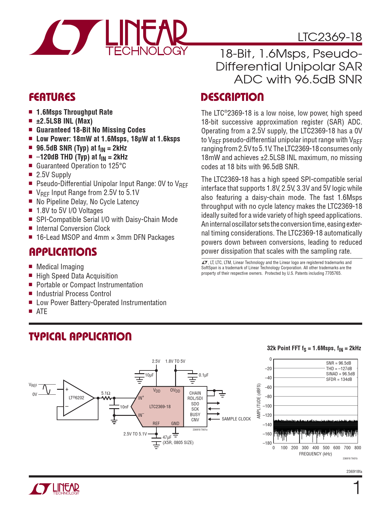LTC2369-18 18-Bit, 1.6Msps, Pseudo- Differential Unipolar SAR ADC with 96.5dB SNR FEATURESDESCRIPTION n 1.6Msps Throughput Rate The LTC®2369-18 is a low noise, low power, high speed n ±2.5LSB INL (Max) 18-bit successive approximation register (SAR) ADC. n Guaranteed 18-Bit No Missing Codes Operating from a 2.5V supply, the LTC2369-18 has a 0V n Low Power: 18mW at 1.6Msps, 18μW at 1.6ksps to VREF pseudo-differential unipolar input range with VREF n 96.5dB SNR (Typ) at fIN = 2kHz ranging from 2.5V to 5.1V. The LTC2369-18 consumes only n – 120dB THD (Typ) at fIN = 2kHz 18mW and achieves ±2.5LSB INL maximum, no missing n Guaranteed Operation to 125°C codes at 18 bits with 96.5dB SNR. n 2.5V Supply The LTC2369-18 has a high speed SPI-compatible serial n Pseudo-Differential Unipolar Input Range: 0V to VREF interface that supports 1.8V, 2.5V, 3.3V and 5V logic while n VREF Input Range from 2.5V to 5.1V also featuring a daisy-chain mode. The fast 1.6Msps n No Pipeline Delay, No Cycle Latency throughput with no cycle latency makes the LTC2369-18 n 1.8V to 5V I/O Voltages ideally suited for a wide variety of high speed applications. n SPI-Compatible Serial I/O with Daisy-Chain Mode An internal oscillator sets the conversion time, easing exter- n Internal Conversion Clock nal timing considerations. The LTC2369-18 automatically n 16-Lead MSOP and 4mm × 3mm DFN Packages powers down between conversions, leading to reduced power dissipation that scales with the sampling rate. APPLICATIONS L, LT, LTC, LTM, Linear Technology and the Linear logo are registered trademarks and n Medical Imaging SoftSpan is a trademark of Linear Technology Corporation. All other trademarks are the n High Speed Data Acquisition property of their respective owners. Protected by U.S. Patents including 7705765. n Portable or Compact Instrumentation n Industrial Process Control n Low Power Battery-Operated Instrumentation n ATE TYPICAL APPLICATION32k Point FFT fS = 1.6Msps, fIN = 2kHz 2.5V 1.8V TO 5V 0 SNR = 96.5dB –20 THD = –127dB 10μF 0.1μF SINAD = 96.5dB –40 SFDR = 134dB VREF + –60 V 5.1Ω DD OVDD 0V CHAIN LT®6202 IN+ RDL/SDI –80 – SDO 10nF LTC2369-18 –100 SCK IN– BUSY –120 SAMPLE CLOCK AMPLITUDE (dBFS) CNV REF GND –140 236918 TA01a 2.5V TO 5.1V –160 47μF (X5R, 0805 SIZE) –180 0 100 200 300 400 500 600 700 800 FREQUENCY (kHz) 236918 TA01b 236918fa 1