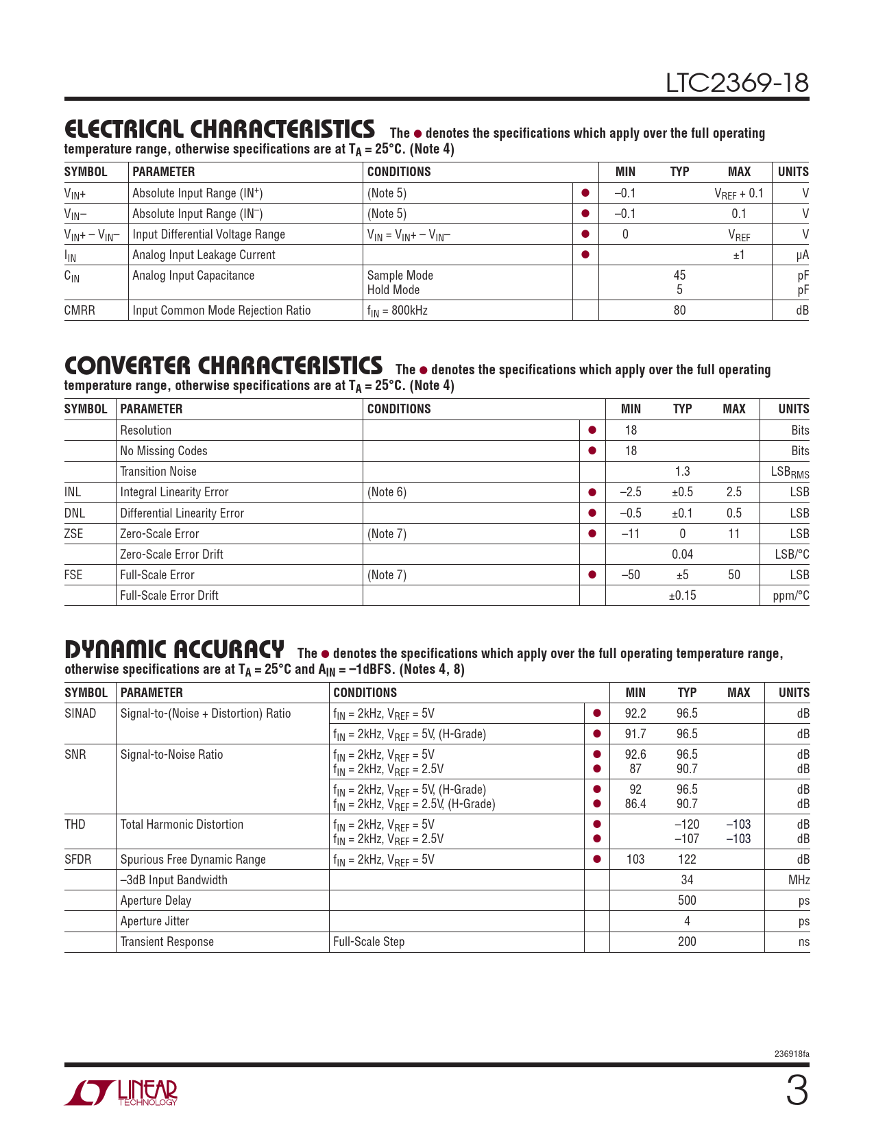 LTC2369-18 ELECTRICAL CHARACTERISTICSThe l denotes the specifications which apply over the full operatingtemperature range, otherwise specifications are at TA = 25°C. (Note 4)SYMBOLPARAMETERCONDITIONSMINTYPMAXUNITS VIN+ Absolute Input Range (IN+) (Note 5) l –0.1 VREF + 0.1 V VIN– Absolute Input Range (IN–) (Note 5) l –0.1 0.1 V VIN+ – VIN– Input Differential Voltage Range VIN = VIN+ – VIN– l 0 VREF V IIN Analog Input Leakage Current l ±1 μA CIN Analog Input Capacitance Sample Mode 45 pF Hold Mode 5 pF CMRR Input Common Mode Rejection Ratio fIN = 800kHz 80 dB CONVERTER CHARACTERISTICSThe l denotes the specifications which apply over the full operatingtemperature range, otherwise specifications are at TA = 25°C. (Note 4)SYMBOLPARAMETERCONDITIONSMINTYPMAXUNITS Resolution l 18 Bits No Missing Codes l 18 Bits Transition Noise 1.3 LSBRMS INL Integral Linearity Error (Note 6) l –2.5 ±0.5 2.5 LSB DNL Differential Linearity Error l –0.5 ±0.1 0.5 LSB ZSE Zero-Scale Error (Note 7) l –11 0 11 LSB Zero-Scale Error Drift 0.04 LSB/°C FSE Full-Scale Error (Note 7) l –50 ±5 50 LSB Full-Scale Error Drift ±0.15 ppm/°C DYNAMIC ACCURACYThe l denotes the specifications which apply over the full operating temperature range,otherwise specifications are at TA = 25°C and AIN = –1dBFS. (Notes 4, 8)SYMBOLPARAMETERCONDITIONSMINTYPMAXUNITS SINAD Signal-to-(Noise + Distortion) Ratio fIN = 2kHz, VREF = 5V l 92.2 96.5 dB fIN = 2kHz, VREF = 5V, (H-Grade) l 91.7 96.5 dB SNR Signal-to-Noise Ratio fIN = 2kHz, VREF = 5V l 92.6 96.5 dB fIN = 2kHz, VREF = 2.5V l 87 90.7 dB fIN = 2kHz, VREF = 5V, (H-Grade) l 92 96.5 dB fIN = 2kHz, VREF = 2.5V, (H-Grade) l 86.4 90.7 dB THD Total Harmonic Distortion fIN = 2kHz, VREF = 5V l –120 –103 dB fIN = 2kHz, VREF = 2.5V l –107 –103 dB SFDR Spurious Free Dynamic Range fIN = 2kHz, VREF = 5V l 103 122 dB –3dB Input Bandwidth 34 MHz Aperture Delay 500 ps Aperture Jitter 4 ps Transient Response Full-Scale Step 200 ns 236918fa 3