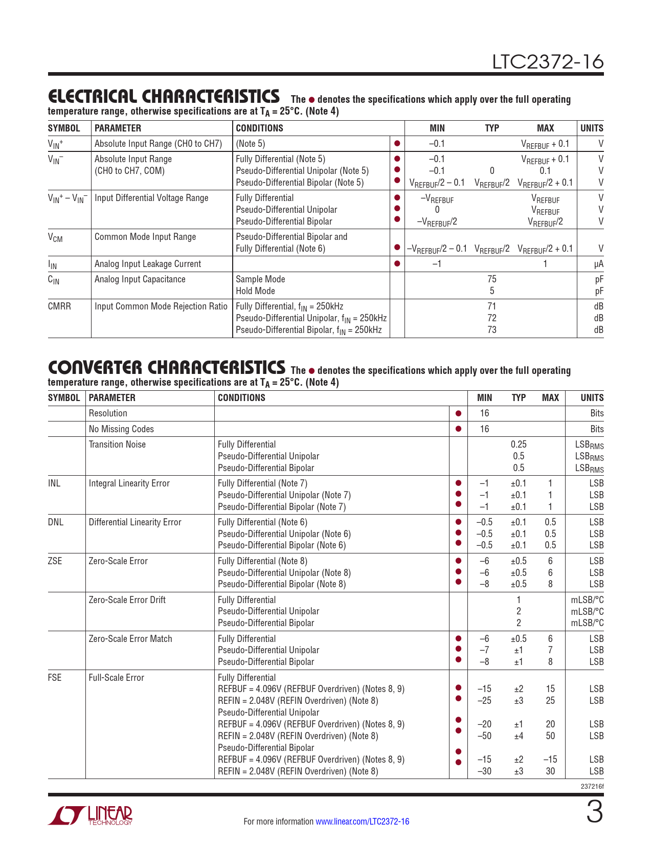 LTC2372-16 e lecTrical characTerisTics The l denotes the specifications which apply over the full operatingtemperature range, otherwise specifications are at TA = 25°C. (Note 4) SYMBOLPARAMETERCONDITIONSMINTYPMAXUNITS V + IN Absolute Input Range (CH0 to CH7) (Note 5) l –0.1 VREFBUF + 0.1 V V – IN Absolute Input Range Fully Differential (Note 5) l –0.1 VREFBUF + 0.1 V (CH0 to CH7, COM) Pseudo-Differential Unipolar (Note 5) l –0.1 0 0.1 V Pseudo-Differential Bipolar (Note 5) l VREFBUF/2 – 0.1 VREFBUF/2 VREFBUF/2 + 0.1 V V + – IN – VIN Input Differential Voltage Range Fully Differential l –VREFBUF VREFBUF V Pseudo-Differential Unipolar l 0 VREFBUF V Pseudo-Differential Bipolar l –VREFBUF/2 VREFBUF/2 V VCM Common Mode Input Range Pseudo-Differential Bipolar and Fully Differential (Note 6) l –VREFBUF/2 – 0.1 VREFBUF/2 VREFBUF/2 + 0.1 V IIN Analog Input Leakage Current l –1 1 µA CIN Analog Input Capacitance Sample Mode 75 pF Hold Mode 5 pF CMRR Input Common Mode Rejection Ratio Fully Differential, fIN = 250kHz 71 dB Pseudo-Differential Unipolar, fIN = 250kHz 72 dB Pseudo-Differential Bipolar, fIN = 250kHz 73 dB c onverTer characTerisTics The l denotes the specifications which apply over the full operatingtemperature range, otherwise specifications are at TA = 25°C. (Note 4) SYMBOL PARAMETERCONDITIONSMINTYPMAXUNITS Resolution l 16 Bits No Missing Codes l 16 Bits Transition Noise Fully Differential 0.25 LSBRMS Pseudo-Differential Unipolar 0.5 LSBRMS Pseudo-Differential Bipolar 0.5 LSBRMS INL Integral Linearity Error Fully Differential (Note 7) l –1 ±0.1 1 LSB Pseudo-Differential Unipolar (Note 7) l –1 ±0.1 1 LSB Pseudo-Differential Bipolar (Note 7) l –1 ±0.1 1 LSB DNL Differential Linearity Error Fully Differential (Note 6) l –0.5 ±0.1 0.5 LSB Pseudo-Differential Unipolar (Note 6) l –0.5 ±0.1 0.5 LSB Pseudo-Differential Bipolar (Note 6) l –0.5 ±0.1 0.5 LSB ZSE Zero-Scale Error Fully Differential (Note 8) l –6 ±0.5 6 LSB Pseudo-Differential Unipolar (Note 8) l –6 ±0.5 6 LSB Pseudo-Differential Bipolar (Note 8) l –8 ±0.5 8 LSB Zero-Scale Error Drift Fully Differential 1 mLSB/°C Pseudo-Differential Unipolar 2 mLSB/°C Pseudo-Differential Bipolar 2 mLSB/°C Zero-Scale Error Match Fully Differential l –6 ±0.5 6 LSB Pseudo-Differential Unipolar l –7 ±1 7 LSB Pseudo-Differential Bipolar l –8 ±1 8 LSB FSE Full-Scale Error Fully Differential REFBUF = 4.096V (REFBUF Overdriven) (Notes 8, 9) l –15 ±2 15 LSB REFIN = 2.048V (REFIN Overdriven) (Note 8) l –25 ±3 25 LSB Pseudo-Differential Unipolar REFBUF = 4.096V (REFBUF Overdriven) (Notes 8, 9) l –20 ±1 20 LSB REFIN = 2.048V (REFIN Overdriven) (Note 8) l –50 ±4 50 LSB Pseudo-Differential Bipolar l REFBUF = 4.096V (REFBUF Overdriven) (Notes 8, 9) –15 ±2 –15 LSB l REFIN = 2.048V (REFIN Overdriven) (Note 8) –30 ±3 30 LSB 237216f For more information www.linear.com/LTC2372-16 3 Document Outline Features Applications Typical Application Description Absolute Maximum Ratings Order Information Pin Configuration Electrical Characteristics Converter Characteristics Dynamic Accuracy Internal Reference Characteristics Reference Buffer Characteristics Digital Inputs and Digital Outputs Power Requirements ADC Timing Characteristics Electrical Characteristics Typical Performance Characteristics Pin Functions Functional Block Diagram Timing Diagram Applications Information Timing Diagrams Board Layout Schematics Package Description Typical Application Related Parts