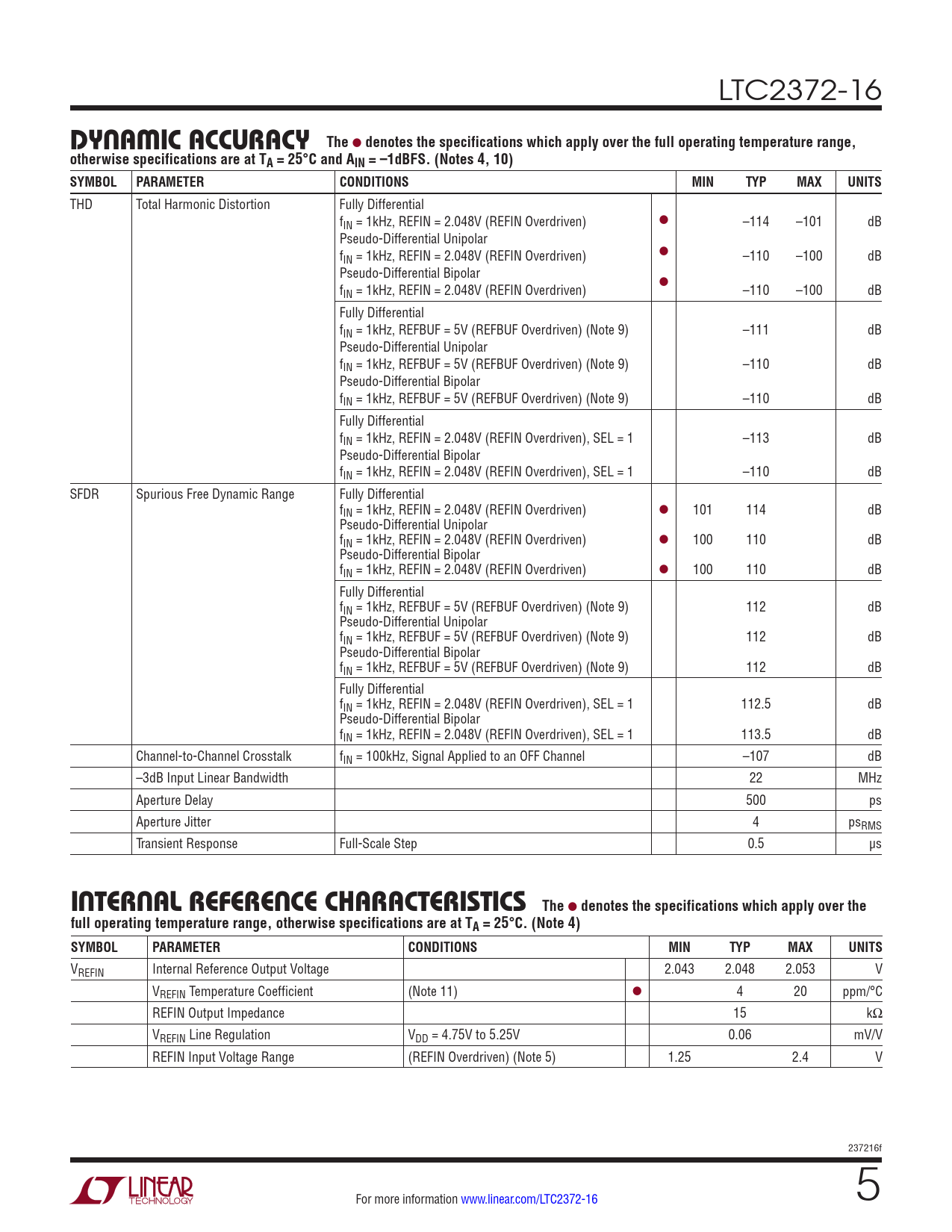 THD Total Harmonic Distortion Fully Differential fIN = 1kHz, REFIN = 2.048V (REFIN Overdriven) l –114 –101 dB Pseudo-Differential Unipolar f l IN = 1kHz, REFIN = 2.048V (REFIN Overdriven) –110 –100 dB Pseudo-Differential Bipolar f l IN = 1kHz, REFIN = 2.048V (REFIN Overdriven) –110 –100 dB Fully Differential fIN = 1kHz, REFBUF = 5V (REFBUF Overdriven) (Note 9) –111 dB Pseudo-Differential Unipolar fIN = 1kHz, REFBUF = 5V (REFBUF Overdriven) (Note 9) –110 dB Pseudo-Differential Bipolar fIN = 1kHz, REFBUF = 5V (REFBUF Overdriven) (Note 9) –110 dB Fully Differential fIN = 1kHz, REFIN = 2.048V (REFIN Overdriven), SEL = 1 –113 dB Pseudo-Differential Bipolar fIN = 1kHz, REFIN = 2.048V (REFIN Overdriven), SEL = 1 –110 dB SFDR Spurious Free Dynamic Range Fully Differential fIN = 1kHz, REFIN = 2.048V (REFIN Overdriven) l 101 114 dB Pseudo-Differential Unipolar fIN = 1kHz, REFIN = 2.048V (REFIN Overdriven) l 100 110 dB Pseudo-Differential Bipolar fIN = 1kHz, REFIN = 2.048V (REFIN Overdriven) l 100 110 dB Fully Differential fIN = 1kHz, REFBUF = 5V (REFBUF Overdriven) (Note 9) 112 dB Pseudo-Differential Unipolar fIN = 1kHz, REFBUF = 5V (REFBUF Overdriven) (Note 9) 112 dB Pseudo-Differential Bipolar fIN = 1kHz, REFBUF = 5V (REFBUF Overdriven) (Note 9) 112 dB Fully Differential fIN = 1kHz, REFIN = 2.048V (REFIN Overdriven), SEL = 1 112.5 dB Pseudo-Differential Bipolar fIN = 1kHz, REFIN = 2.048V (REFIN Overdriven), SEL = 1 113.5 dB Channel-to-Channel Crosstalk fIN = 100kHz, Signal Applied to an OFF Channel –107 dB –3dB Input Linear Bandwidth 22 MHz Aperture Delay 500 ps Aperture Jitter 4 psRMS Transient Response Full-Scale Step 0.5 µs