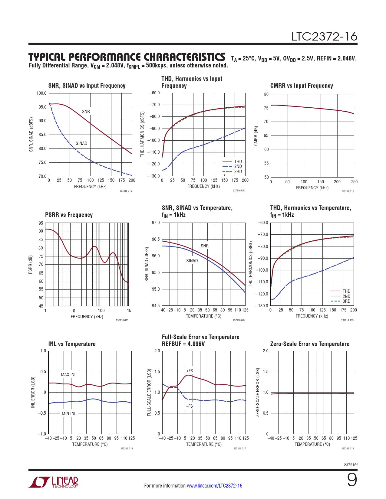 100.0 –60.0 80 95.0 –70.0 75 SNR –80.0 90.0 70 –90.0 85.0 65 –100.0 SINAD CMRR (dB) 80.0 SNR, SINAD (dBFS) 60 –110.0 THD, HARMONICS (dBFS) 75.0 THD –120.0 55 2ND 3RD 70.0 –130.0 50 0 25 50 75 100 125 150 175 200 0 25 50 75 100 125 150 175 200 0 50 100 150 200 250 FREQUENCY (kHz) FREQUENCY (kHz) FREQUENCY (kHz) 237216 G10 237216 G11 237218 G12