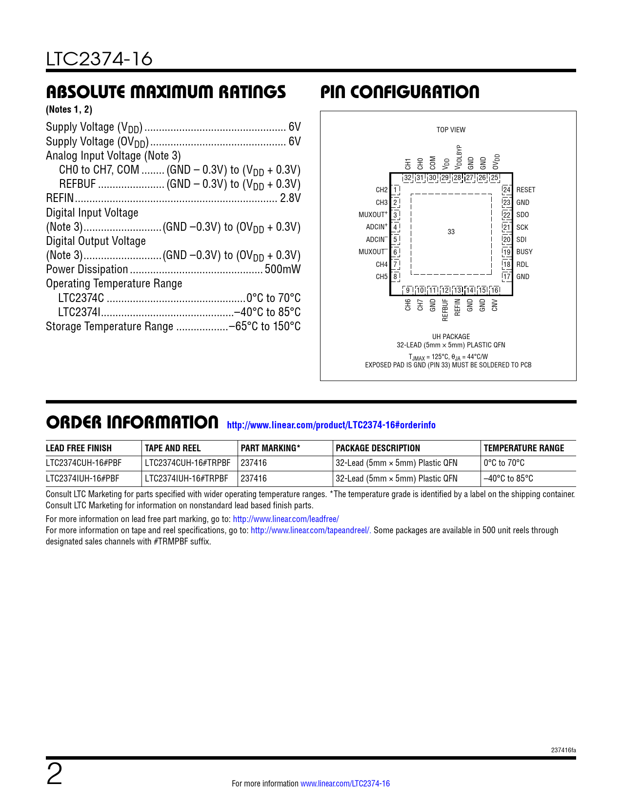 orDer inForMaTion http://www.linear.com/product/LTC2374-16#orderinfo LEAD FREE FINISH TAPE AND REEL PART MARKING* PACKAGE DESCRIPTION TEMPERATURE RANGE