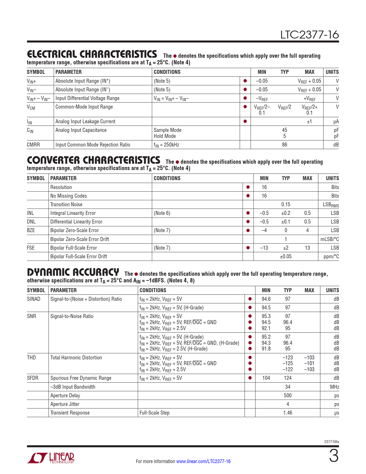 SINAD Signal-to-(Noise + Distortion) Ratio fIN = 2kHz, VREF = 5V l 94.6 97 dB fIN = 2kHz, VREF = 5V, (H-Grade) l 94.5 97 dB SNR Signal-to-Noise Ratio fIN = 2kHz, VREF = 5V l 95.3 97 dB fIN = 2kHz, VREF = 5V, REF/DGC = GND l 94.5 96.4 dB fIN = 2kHz, VREF = 2.5V l 92.1 95 dB fIN = 2kHz, VREF = 5V, (H-Grade) l 95.2 97 dB fIN = 2kHz, VREF = 5V, REF/DGC = GND, (H-Grade) l 94.3 96.4 dB fIN = 2kHz, VREF = 2.5V, (H-Grade) l 91.8 95 dB THD Total Harmonic Distortion fIN = 2kHz, VREF = 5V l –123 –103 dB fIN = 2kHz, VREF = 5V, REF/DGC = GND l –125 –101 dB fIN = 2kHz, VREF = 2.5V l –122 –103 dB SFDR Spurious Free Dynamic Range fIN = 2kHz, VREF = 5V l 104 124 dB –3dB Input Bandwidth 34 MHz Aperture Delay 500 ps Aperture Jitter 4 ps Transient Response Full-Scale Step 1.46 µs 237716fa For more information www.linear.com/LTC2377-16 3 Document Outline Features Applications Description Typical Application Absolute Maximum Ratings Pin Configuration Order Information Electrical Characteristics Converter Characteristics Dynamic Accuracy Reference Input Digital Inputs and Digital Outputs Power Requirements ADC Timing Characteristics Typical Performance Characteristics Pin Functions Functional Block Diagram Timing Diagram Applications Information Board Layout Package Description Revision History Typical Application Related Parts