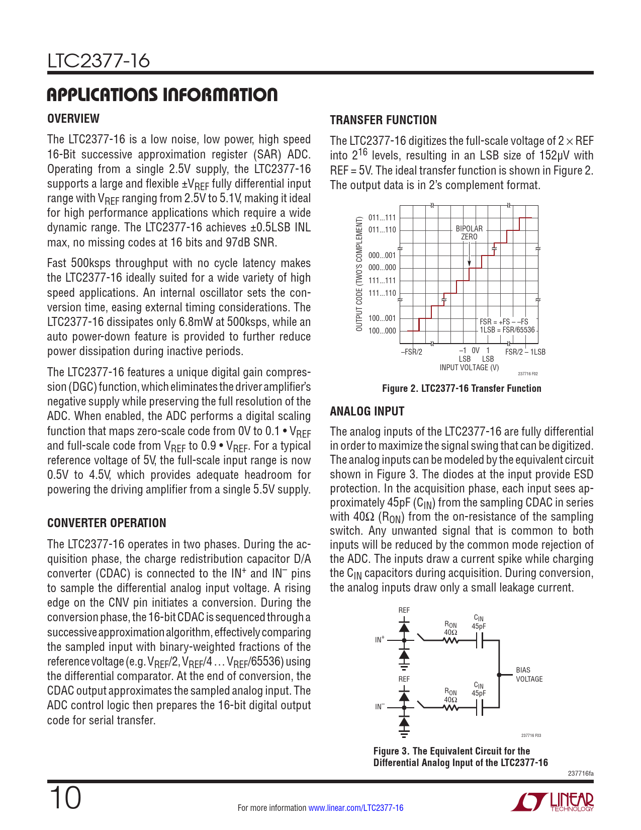 LTC2377-16 APPLICATIONS INFORMATIONOVERVIEWTRANSFER FUNCTION The LTC2377-16 is a low noise, low power, high speed The LTC2377-16 digitizes the full-scale voltage of 2 × REF 16-Bit successive approximation register (SAR) ADC. into 216 levels, resulting in an LSB size of 152µV with Operating from a single 2.5V supply, the LTC2377-16 REF = 5V. The ideal transfer function is shown in Figure 2. supports a large and flexible ±VREF fully differential input The output data is in 2’s complement format. range with VREF ranging from 2.5V to 5.1V, making it ideal for high performance applications which require a wide 011...111 dynamic range. The LTC2377-16 achieves ±0.5LSB INL 011...110 BIPOLAR max, no missing codes at 16 bits and 97dB SNR. ZERO Fast 500ksps throughput with no cycle latency makes 000...001 000...000 the LTC2377-16 ideally suited for a wide variety of high 111...111 speed applications. An internal oscillator sets the con- 111...110 version time, easing external timing considerations. The LTC2377-16 dissipates only 6.8mW at 500ksps, while an 100...001 FSR = +FS – –FS auto power-down feature is provided to further reduce OUTPUT CODE (TWO’S COMPLEMENT) 100...000 1LSB = FSR/65536 power dissipation during inactive periods. –FSR/2 –1 0V 1 FSR/2 – 1LSB LSB LSB The LTC2377-16 features a unique digital gain compres- INPUT VOLTAGE (V) 237716 F02 sion (DGC) function, which eliminates the driver amplifier’s Figure 2. LTC2377-16 Transfer Function negative supply while preserving the full resolution of the ADC. When enabled, the ADC performs a digital scaling ANALOG INPUT function that maps zero-scale code from 0V to 0.1 • VREF The analog inputs of the LTC2377-16 are fully differential and full-scale code from VREF to 0.9 • VREF. For a typical in order to maximize the signal swing that can be digitized. reference voltage of 5V, the full-scale input range is now The analog inputs can be modeled by the equivalent circuit 0.5V to 4.5V, which provides adequate headroom for shown in Figure 3. The diodes at the input provide ESD powering the driving amplifier from a single 5.5V supply. protection. In the acquisition phase, each input sees ap- proximately 45pF (CIN) from the sampling CDAC in series CONVERTER OPERATION with 40Ω (RON) from the on-resistance of the sampling switch. Any unwanted signal that is common to both The LTC2377-16 operates in two phases. During the ac- inputs will be reduced by the common mode rejection of quisition phase, the charge redistribution capacitor D/A the ADC. The inputs draw a current spike while charging converter (CDAC) is connected to the IN+ and IN– pins the CIN capacitors during acquisition. During conversion, to sample the differential analog input voltage. A rising the analog inputs draw only a small leakage current. edge on the CNV pin initiates a conversion. During the conversion phase, the 16-bit CDAC is sequenced through a REF C R IN successive approximation algorithm, effectively comparing ON 45pF 40Ω the sampled input with binary-weighted fractions of the IN+ reference voltage (e.g. VREF/2, VREF/4 … VREF/65536) using the differential comparator. At the end of conversion, the BIAS REF VOLTAGE CDAC output approximates the sampled analog input. The C R IN ON 45pF ADC control logic then prepares the 16-bit digital output 40Ω IN– code for serial transfer. 237716 F03 Figure 3. The Equivalent Circuit for theDifferential Analog Input of the LTC2377-16 237716fa 10 For more information www.linear.com/LTC2377-16 Document Outline Features Applications Description Typical Application Absolute Maximum Ratings Pin Configuration Order Information Electrical Characteristics Converter Characteristics Dynamic Accuracy Reference Input Digital Inputs and Digital Outputs Power Requirements ADC Timing Characteristics Typical Performance Characteristics Pin Functions Functional Block Diagram Timing Diagram Applications Information Board Layout Package Description Revision History Typical Application Related Parts
