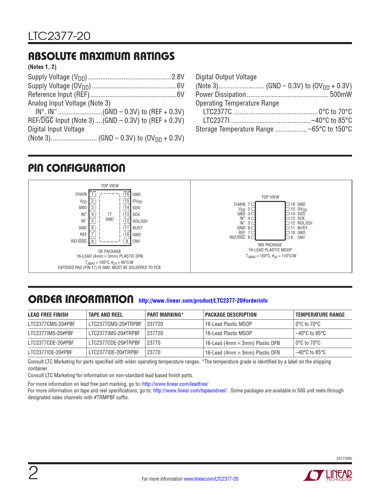 LTC2377-20 ABSOLUTE MAXIMUM RATINGS (Notes 1, 2) Supply Voltage (VDD) ...2.8V Digital Output Voltage Supply Voltage (OVDD) ..6V (Note 3) .. (GND – 0.3V) to (OVDD + 0.3V) Reference Input (REF) ...6V Power Dissipation .. 500mW Analog Input Voltage (Note 3) Operating Temperature Range IN+, IN– ...(GND – 0.3V) to (REF + 0.3V) LTC2377C .. 0°C to 70°C REF/DGC Input (Note 3) ..(GND – 0.3V) to (REF + 0.3V) LTC2377I ...–40°C to 85°C Digital Input Voltage Storage Temperature Range .. –65°C to 150°C (Note 3) .. (GND – 0.3V) to (OVDD + 0.3V) PIN CONFIGURATION TOP VIEW CHAIN 1 16 GND TOP VIEW VDD 2 15 OVDD CHAIN 1 16 GND GND 3 14 SDO VDD 2 15 OVDD IN+ 4 17 13 SCK GND 3 14 SDO GND IN– 5 12 IN+ 4 13 SCK RDL/SDI IN– 5 12 RDL/SDI GND 6 11 BUSY GND 6 11 BUSY REF 7 10 GND REF 7 10 GND REF/DGC 8 9 CNV REF/DGC 8 9 CNV MS PACKAGE DE PACKAGE 16-LEAD PLASTIC MSOP 16-LEAD (4mm × 3mm) PLASTIC DFN TJMAX = 150°C, θJA = 110°C/W TJMAX = 150°C, θJA = 40°C/W EXPOSED PAD (PIN 17) IS GND, MUST BE SOLDERED TO PCB ORDER INFORMATION http://www.linear.com/product/LTC2377-20#orderinfoLEAD FREE FINISHTAPE AND REELPART MARKING*PACKAGE DESCRIPTIONTEMPERATURE RANGE LTC2377CMS-20#PBF LTC2377CMS-20#TRPBF 237720 16-Lead Plastic MSOP 0°C to 70°C LTC2377IMS-20#PBF LTC2377IMS-20#TRPBF 237720 16-Lead Plastic MSOP –40°C to 85°C LTC2377CDE-20#PBF LTC2377CDE-20#TRPBF 23770 16-Lead (4mm × 3mm) Plastic DFN 0°C to 70°C LTC2377IDE-20#PBF LTC2377IDE-20#TRPBF 23770 16-Lead (4mm × 3mm) Plastic DFN –40°C to 85°C Consult LTC Marketing for parts specified with wider operating temperature ranges. *The temperature grade is identified by a label on the shipping container. Consult LTC Marketing for information on non-standard lead based finish parts. For more information on lead free part marking, go to: http://www.linear.com/leadfree/ For more information on tape and reel specifications, go to: http://www.linear.com/tapeandreel/ . Some packages are available in 500 unit reels through designated sales channels with #TRMPBF suffix. 237720fb 2 For more information www.linear.com/LTC2377-20 Document Outline Features Applications Description Typical Application Absolute Maximum Ratings Pin Configuration Order Information Electrical Characteristics converter Characteristics Dynamic Accuracy Reference Input Digital Inputs and Digital Outputs Power Requirements ADC Timing Characteristics Typical Performance Characteristics Pin Functions Functional Block Diagram Timing Diagram Applications Information Board Layout Package Description Revision History Typical Application Related Parts