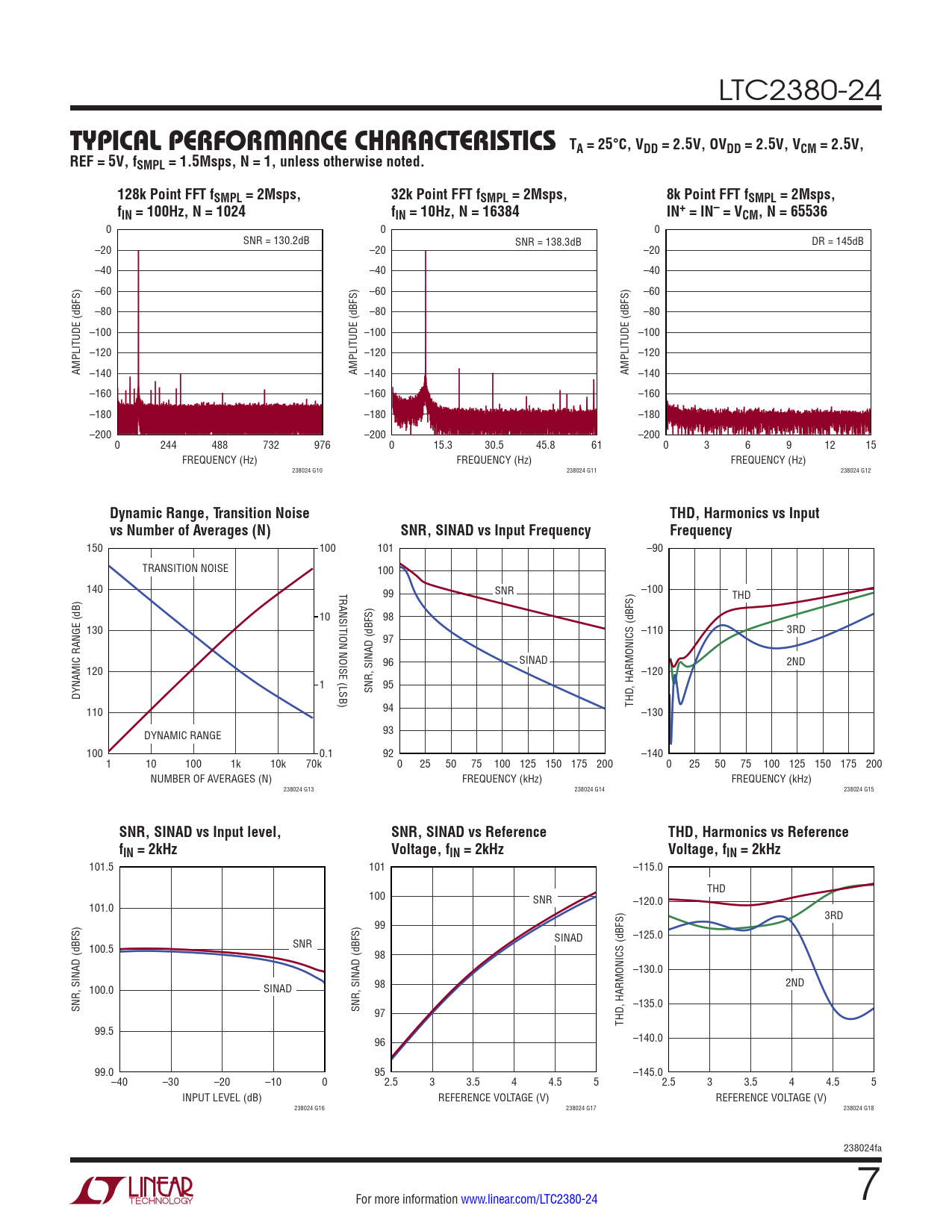 150 100 101 –90 TRANSITION NOISE 100 140 TRANSITION NOISE (LSB) 99 SNR –100 THD 10 98 130 –110 3RD 97 96 SINAD 2ND 120 –120 1 95 DYNAMIC RANGE (dB) SNR, SINAD (dBFS) THD, HARMONICS (dBFS) 110 94 –130 DYNAMIC RANGE 93 100 0.1 92 –140 1 10 100 1k 10k 70k 0 25 50 75 100 125 150 175 200 0 25 50 75 100 125 150 175 200 NUMBER OF AVERAGES (N) FREQUENCY (kHz) FREQUENCY (kHz) 238024 G13 238024 G14 238024 G15