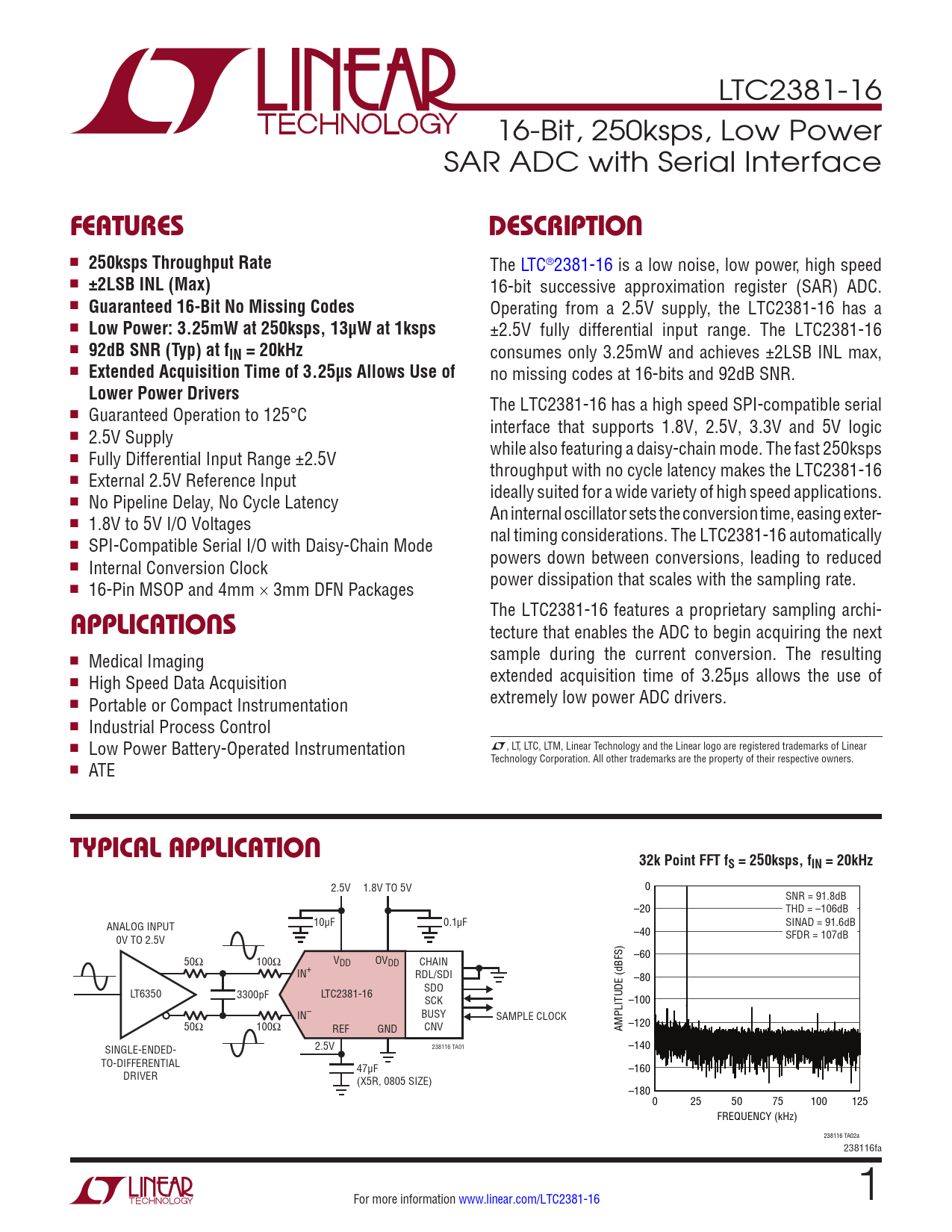 LTC2381-16 16-Bit, 250ksps, Low Power SAR ADC with Serial Interface