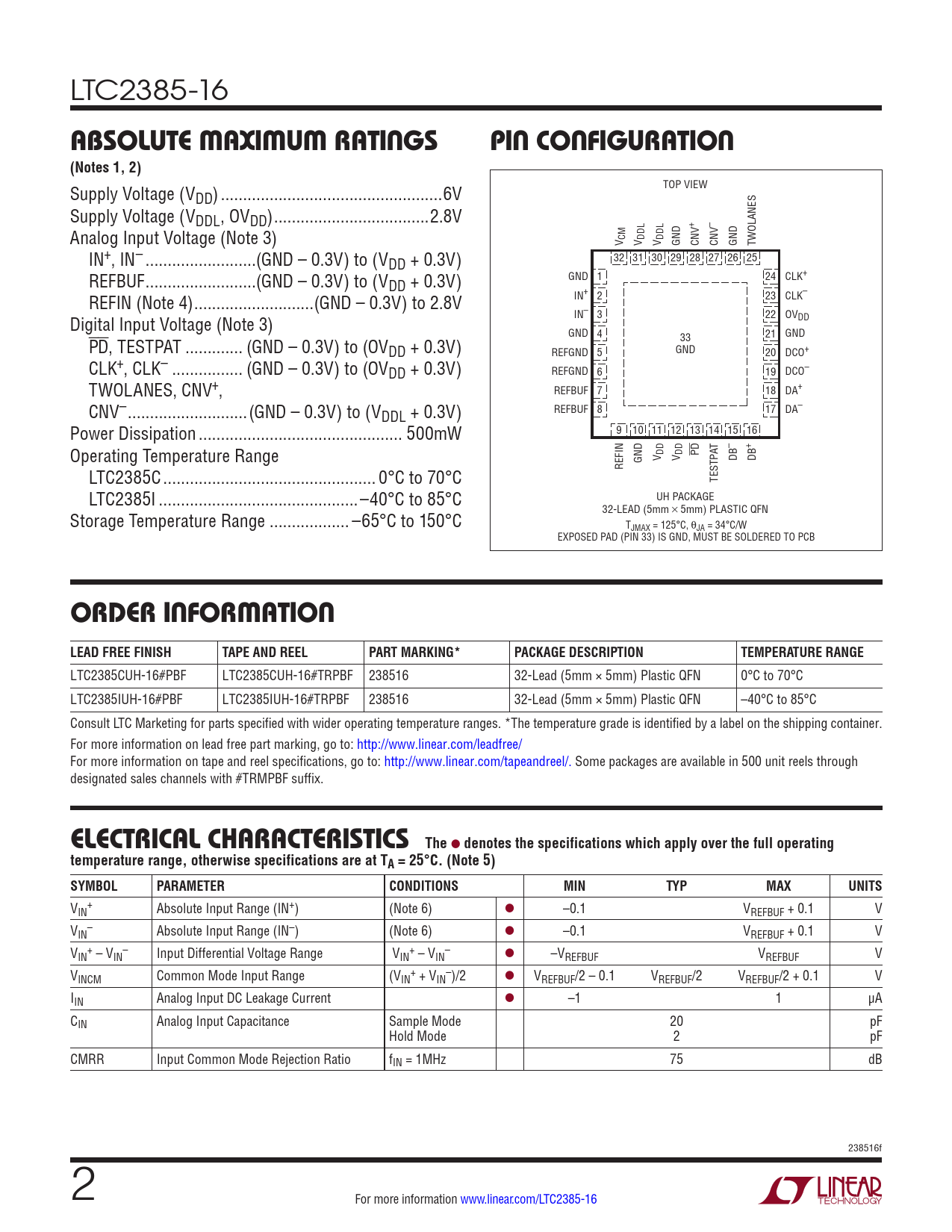 LTC2385-16 ABSOLUTE MAXIMUM RATINGSPIN CONFIGURATION(Notes 1, 2) Supply Voltage (V TOP VIEW DD) ..6V Supply Voltage (VDDL, OVDD) ...2.8V + – Analog Input Voltage (Note 3) V CM V DDL V DDL GND CNV CNV GND TWOLANES IN+, IN– ...(GND – 0.3V) to (VDD + 0.3V) 32 31 30 29 28 27 26 25 REFBUF ...(GND – 0.3V) to (V GND 1 24 CLK+ DD + 0.3V) REFIN (Note 4) ...(GND – 0.3V) to 2.8V IN+ 2 23 CLK– Digital Input Voltage (Note 3) IN– 3 22 OVDD GND 4 21 GND PD, TESTPAT ... (GND – 0.3V) to (OV 33 DD + 0.3V) REFGND 5 GND 20 DCO+ CLK+, CLK– .. (GND – 0.3V) to (OVDD + 0.3V) REFGND 6 19 DCO– TWOLANES, CNV+, REFBUF 7 18 DA+ CNV– ...(GND – 0.3V) to (VDDL + 0.3V) REFBUF 8 17 DA– Power Dissipation .. 500mW 9 10 11 12 13 14 15 16 Operating Temperature Range AT – + DB DB LTC2385C .. 0°C to 70°C REFIN GND V DD V DD PD TESTP LTC2385I ...–40°C to 85°C UH PACKAGE Storage Temperature Range .. –65°C to 150°C 32-LEAD (5mm × 5mm) PLASTIC QFN TJMAX = 125°C, θJA = 34°C/W EXPOSED PAD (PIN 33) IS GND, MUST BE SOLDERED TO PCB ORDER INFORMATION LEAD FREE FINISHTAPE AND REELPART MARKING*PACKAGE DESCRIPTIONTEMPERATURE RANGE LTC2385CUH-16#PBF LTC2385CUH-16#TRPBF 238516 32-Lead (5mm × 5mm) Plastic QFN 0°C to 70°C LTC2385IUH-16#PBF LTC2385IUH-16#TRPBF 238516 32-Lead (5mm × 5mm) Plastic QFN –40°C to 85°C Consult LTC Marketing for parts specified with wider operating temperature ranges. *The temperature grade is identified by a label on the shipping container. For more information on lead free part marking, go to: http://www.linear.com/leadfree/ For more information on tape and reel specifications, go to: http://www.linear.com/tapeandreel/. Some packages are available in 500 unit reels through designated sales channels with #TRMPBF suffix. ELECTRICALCHARACTERISTICS The l denotes the specifications which apply over the full operatingtemperature range, otherwise specifications are at TA = 25°C. (Note 5) SYMBOLPARAMETERCONDITIONSMINTYPMAXUNITS V + IN Absolute Input Range (IN+) (Note 6) l –0.1 VREFBUF + 0.1 V V – IN Absolute Input Range (IN–) (Note 6) l –0.1 VREFBUF + 0.1 V V + – + – IN – VIN Input Differential Voltage Range VIN – VIN l –VREFBUF VREFBUF V V + – INCM Common Mode Input Range (VIN + VIN )/2 l VREFBUF/2 – 0.1 VREFBUF/2 VREFBUF/2 + 0.1 V IIN Analog Input DC Leakage Current l –1 1 μA CIN Analog Input Capacitance Sample Mode 20 pF Hold Mode 2 pF CMRR Input Common Mode Rejection Ratio fIN = 1MHz 75 dB 238516f 2 For more information www.linear.com/LTC2385-16 Document Outline Features Applications Description Typical Application Absolute Maximum Ratings Pin Configuration Order Information Electrical Characteristics Converter Characteristics Dynamic Accuracy Internal Reference Characteristics Reference Buffer Characteristics Digital Inputs and Digital Outputs Power Requirements ADC Timing Characteristics Typical Performance Characteristics Pin Functions Functional Block Diagram Timing Diagram Applications Information Package Description Typical Application Related Parts