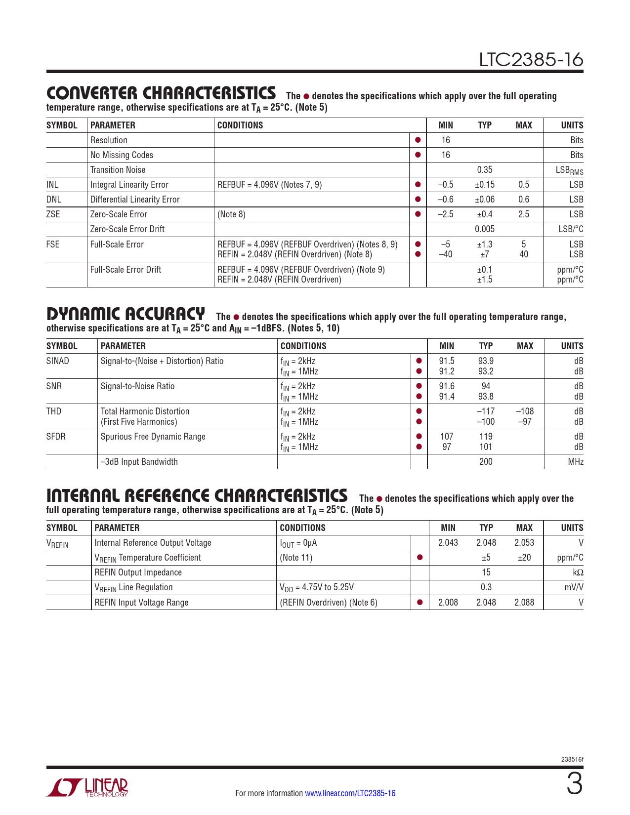 VREFIN Internal Reference Output Voltage IOUT = 0μA 2.043 2.048 2.053 V VREFIN Temperature Coefficient (Note 11) l ±5 ±20 ppm/°C REFIN Output Impedance 15 kΩ VREFIN Line Regulation VDD = 4.75V to 5.25V 0.3 mV/V REFIN Input Voltage Range (REFIN Overdriven) (Note 6) l 2.008 2.048 2.088 V 238516f For more information www.linear.com/LTC2385-16 3 Document Outline Features Applications Description Typical Application Absolute Maximum Ratings Pin Configuration Order Information Electrical Characteristics Converter Characteristics Dynamic Accuracy Internal Reference Characteristics Reference Buffer Characteristics Digital Inputs and Digital Outputs Power Requirements ADC Timing Characteristics Typical Performance Characteristics Pin Functions Functional Block Diagram Timing Diagram Applications Information Package Description Typical Application Related Parts