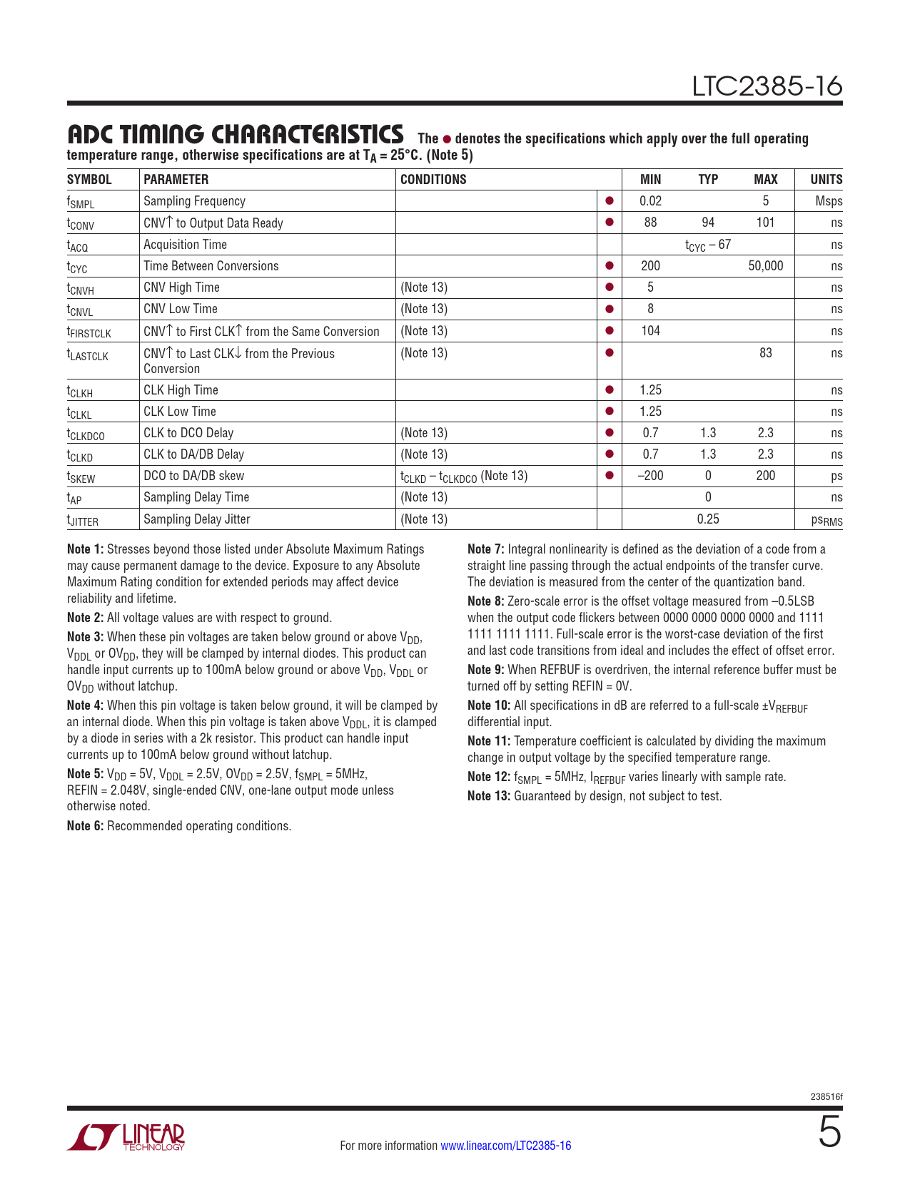 LTC2385-16 ADCTIMING CHARACTERISTICS The l denotes the specifications which apply over the full operatingtemperature range, otherwise specifications are at TA = 25°C. (Note 5) SYMBOLPARAMETERCONDITIONSMINTYPMAXUNITS fSMPL Sampling Frequency l 0.02 5 Msps tCONV CNV↑ to Output Data Ready l 88 94 101 ns tACQ Acquisition Time tCYC – 67 ns tCYC Time Between Conversions l 200 50,000 ns tCNVH CNV High Time (Note 13) l 5 ns tCNVL CNV Low Time (Note 13) l 8 ns tFIRSTCLK CNV↑ to First CLK↑ from the Same Conversion (Note 13) l 104 ns tLASTCLK CNV↑ to Last CLK↓ from the Previous (Note 13) l 83 ns Conversion tCLKH CLK High Time l 1.25 ns tCLKL CLK Low Time l 1.25 ns tCLKDCO CLK to DCO Delay (Note 13) l 0.7 1.3 2.3 ns tCLKD CLK to DA/DB Delay (Note 13) l 0.7 1.3 2.3 ns tSKEW DCO to DA/DB skew tCLKD – tCLKDCO (Note 13) l –200 0 200 ps tAP Sampling Delay Time (Note 13) 0 ns tJITTER Sampling Delay Jitter (Note 13) 0.25 psRMS Note 1: Stresses beyond those listed under Absolute Maximum Ratings Note 7: Integral nonlinearity is defined as the deviation of a code from a may cause permanent damage to the device. Exposure to any Absolute straight line passing through the actual endpoints of the transfer curve. Maximum Rating condition for extended periods may affect device The deviation is measured from the center of the quantization band. reliability and lifetime. Note 8: Zero-scale error is the offset voltage measured from –0.5LSB Note 2: All voltage values are with respect to ground. when the output code flickers between 0000 0000 0000 0000 and 1111 Note 3: When these pin voltages are taken below ground or above V 1111 1111 1111. Full-scale error is the worst-case deviation of the first DD, V and last code transitions from ideal and includes the effect of offset error. DDL or OVDD, they will be clamped by internal diodes. This product can handle input currents up to 100mA below ground or above VDD, VDDL or Note 9: When REFBUF is overdriven, the internal reference buffer must be OVDD without latchup. turned off by setting REFIN = 0V. Note 4: When this pin voltage is taken below ground, it will be clamped by Note 10: All specifications in dB are referred to a full-scale ±VREFBUF an internal diode. When this pin voltage is taken above VDDL, it is clamped differential input. by a diode in series with a 2k resistor. This product can handle input Note 11: Temperature coefficient is calculated by dividing the maximum currents up to 100mA below ground without latchup. change in output voltage by the specified temperature range. Note 5: VDD = 5V, VDDL = 2.5V, OVDD = 2.5V, fSMPL = 5MHz, Note 12: fSMPL = 5MHz, IREFBUF varies linearly with sample rate. REFIN = 2.048V, single-ended CNV, one-lane output mode unless Note 13: Guaranteed by design, not subject to test. otherwise noted. Note 6: Recommended operating conditions. 238516f For more information www.linear.com/LTC2385-16 5 Document Outline Features Applications Description Typical Application Absolute Maximum Ratings Pin Configuration Order Information Electrical Characteristics Converter Characteristics Dynamic Accuracy Internal Reference Characteristics Reference Buffer Characteristics Digital Inputs and Digital Outputs Power Requirements ADC Timing Characteristics Typical Performance Characteristics Pin Functions Functional Block Diagram Timing Diagram Applications Information Package Description Typical Application Related Parts