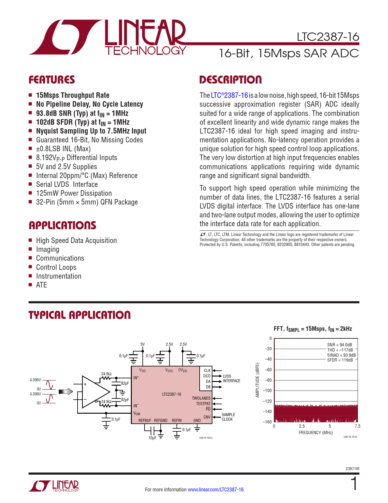 LTC2387-16 16-Bit, 15Msps SAR ADC FEATURESDESCRIPTION n 15Msps Throughput Rate The LTC®2387-16 is a low noise, high speed, 16-bit 15Msps n No Pipeline Delay, No Cycle Latency successive approximation register (SAR) ADC ideally n 93.8dB SNR (Typ) at fIN = 1MHz suited for a wide range of applications. The combination n 102dB SFDR (Typ) at fIN = 1MHz of excellent linearity and wide dynamic range makes the n Nyquist Sampling Up to 7.5MHz Input LTC2387-16 ideal for high speed imaging and instru- n Guaranteed 16-Bit, No Missing Codes mentation applications. No-latency operation provides a n ±0.8LSB INL (Max) unique solution for high speed control loop applications. n 8.192VP-P Differential Inputs The very low distortion at high input frequencies enables n 5V and 2.5V Supplies communications applications requiring wide dynamic n Internal 20ppm/°C (Max) Reference range and significant signal bandwidth. n Serial LVDS Interface To support high speed operation while minimizing the n 125mW Power Dissipation number of data lines, the LTC2387-16 features a serial n 32-Pin (5mm × 5mm) QFN Package LVDS digital interface. The LVDS interface has one-lane and two-lane output modes, allowing the user to optimize the interface data rate for each application. APPLICATIONS L, LT, LTC, LTM, Linear Technology and the Linear logo are registered trademarks of Linear n High Speed Data Acquisition Technology Corporation. All other trademarks are the property of their respective owners. Protected by U.S. Patents, including 7705765, 8232905, 8810443. Other patents are pending. n Imaging n Communications n Control Loops n Instrumentation n ATE TYPICAL APPLICATIONFFT, fSMPL = 15Msps, fIN = 2kHzIN 0 5V 2.5V 2.5V SNR = 94.0dB –20 THD = –117dB 0.1µF 0.1µF 0.1µF SINAD = 93.9dB –40 SFDR = 119dB VDD VDDL OVDD CLK –60 24.9Ω DCO LVDS IN+ 4.096V DA INTERFACE + –80 82pF DB 0V –100 4.096V LTC2387-16 – AMPLITUDE (dBFS) 24.9Ω 82pF TWOLANES 0V –120 IN– TESTPAT PD V –140 CM SAMPLE 0.1µF CNV CLOCK REFBUF REFGND REFIN GND –160 0 2.5 5 7.5 0.1µF FREQUENCY (MHz) 10µF 238716 TA01a 238716 TA1b 238716f For more information www.linear.com/LTC2387-16 1 Document Outline Features Applications Typical Application Description Absolute Maximum Ratings Order Information Electrical Characteristics Pin Configuration Converter Characteristics Dynamic Accuracy Internal Reference Characteristics Reference Buffer Characteristics Digital Inputs and Digital Outputs Power Requirements ADC Timing Characteristics Typical Performance Characteristics Pin Functions Functional Block Diagram Timing Diagram Applications Information Package Description Typical Application Related Parts