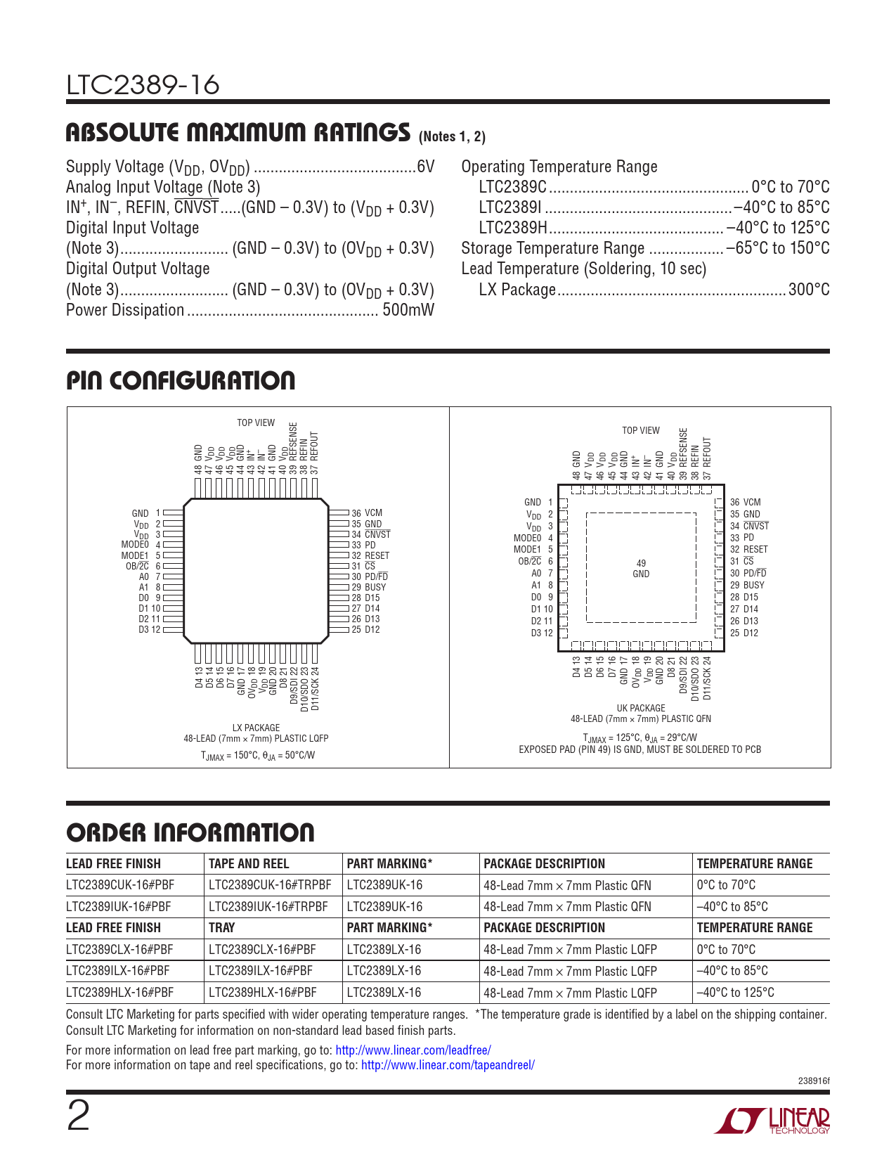 LTC2389CUK-16#PBF LTC2389CUK-16#TRPBF LTC2389UK-16 48-Lead 7mm × 7mm Plastic QFN 0°C to 70°C LTC2389IUK-16#PBF LTC2389IUK-16#TRPBF LTC2389UK-16 48-Lead 7mm × 7mm Plastic QFN –40°C to 85°C