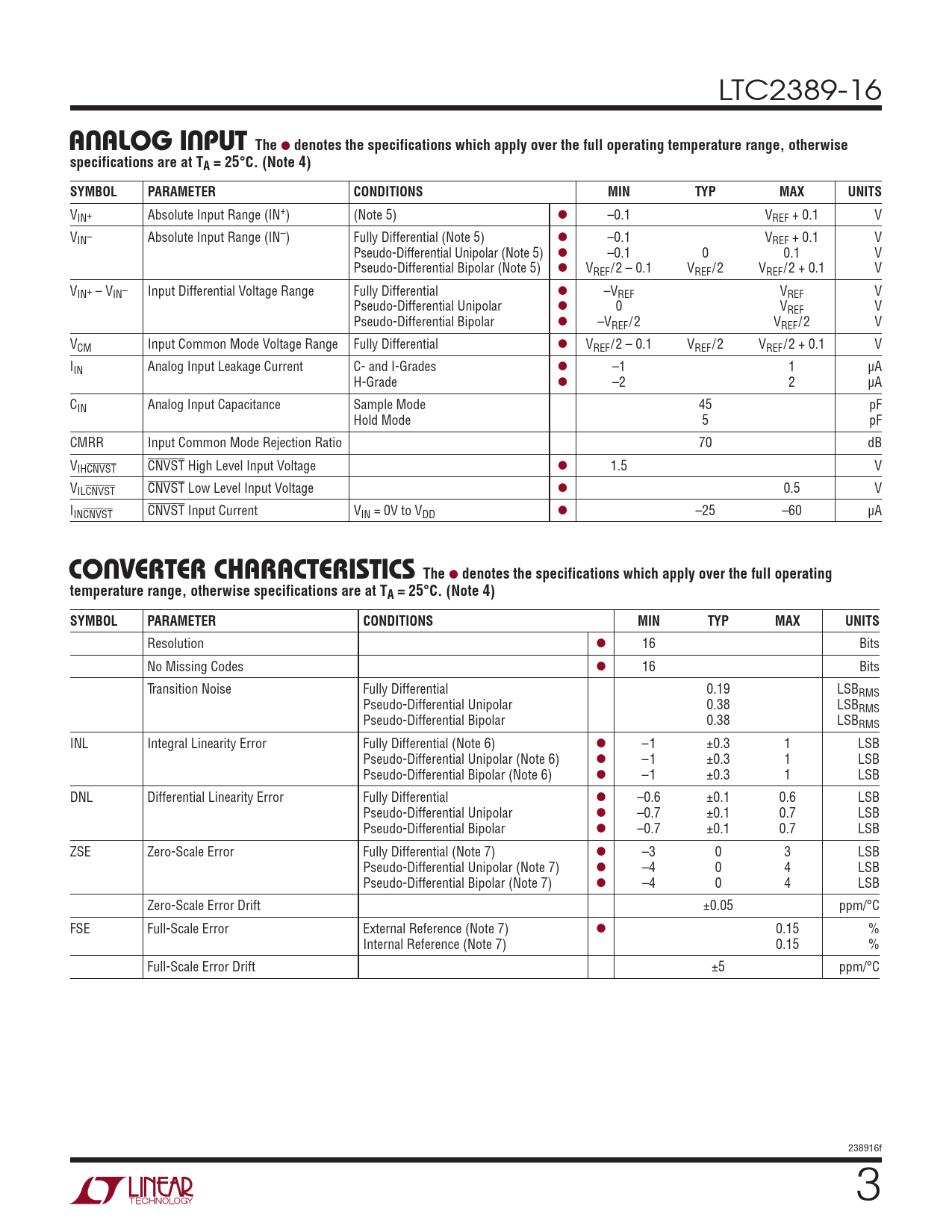 Resolution l 16 Bits No Missing Codes l 16 Bits Transition Noise Fully Differential 0.19 LSBRMS Pseudo-Differential Unipolar 0.38 LSBRMS Pseudo-Differential Bipolar 0.38 LSBRMS INL Integral Linearity Error Fully Differential (Note 6) l –1 ±0.3 1 LSB Pseudo-Differential Unipolar (Note 6) l –1 ±0.3 1 LSB Pseudo-Differential Bipolar (Note 6) l –1 ±0.3 1 LSB DNL Differential Linearity Error Fully Differential l –0.6 ±0.1 0.6 LSB Pseudo-Differential Unipolar l –0.7 ±0.1 0.7 LSB Pseudo-Differential Bipolar l –0.7 ±0.1 0.7 LSB ZSE Zero-Scale Error Fully Differential (Note 7) l –3 0 3 LSB Pseudo-Differential Unipolar (Note 7) l –4 0 4 LSB Pseudo-Differential Bipolar (Note 7) l –4 0 4 LSB Zero-Scale Error Drift ±0.05 ppm/°C FSE Full-Scale Error External Reference (Note 7) l 0.15 % Internal Reference (Note 7) 0.15 % Full-Scale Error Drift ±5 ppm/°C 238916f 3 Document Outline Features Applications Description Typical Application Absolute Maximum Ratings Pin Configuration Order Information Analog Input Converter Characteristics Dynamic Accuracy Reference Characteristics Digital Inputs And Digital Outputs Power Requirements Timing Characteristics Typical Performance Characteristics Pin Functions Functional Block Diagram Timing Diagrams Applications Information Package Description Related Parts Typical Application