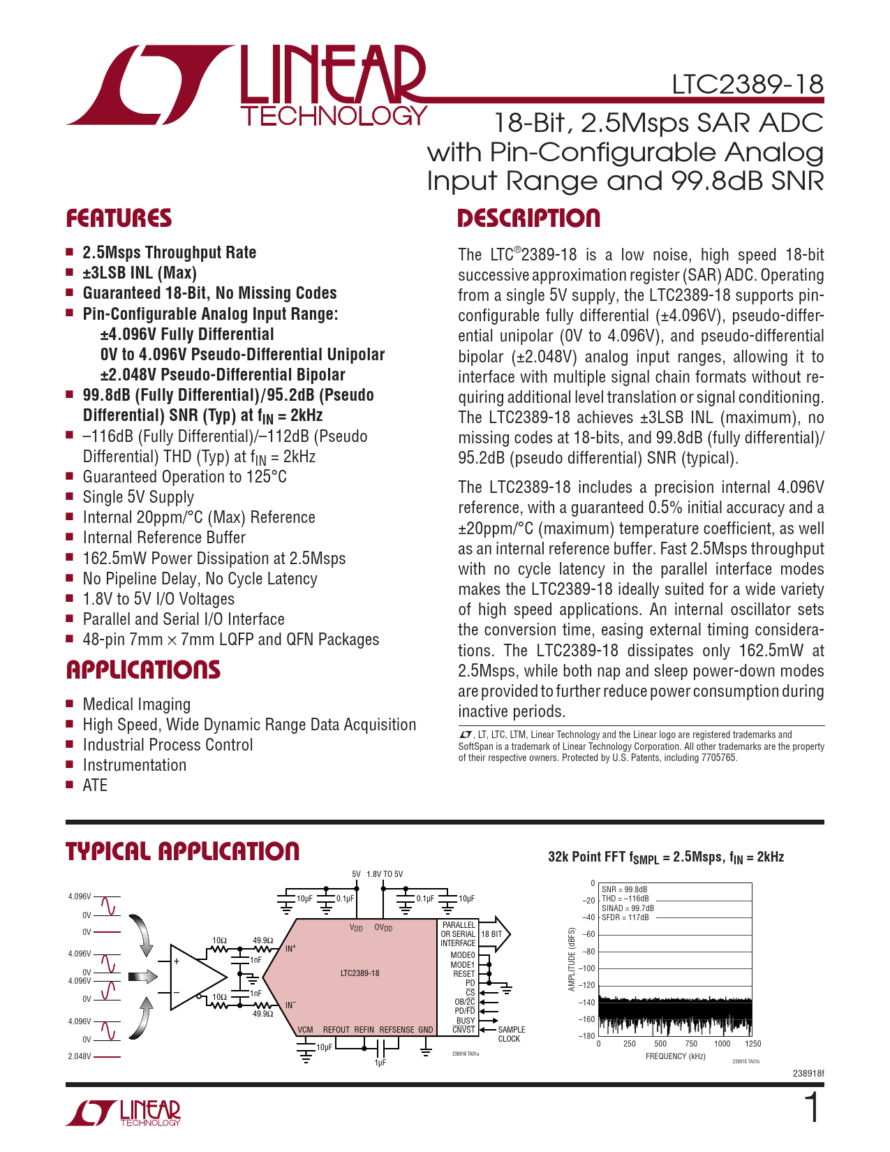 LTC2389-18 18-Bit, 2.5Msps SAR ADC with Pin-Configurable Analog Input Range and 99.8dB SNR FeaTuresDescripTion n 2.5Msps Throughput Rate The LTC®2389-18 is a low noise, high speed 18-bit n ±3LSB INL (Max) successive approximation register (SAR) ADC. Operating n Guaranteed 18-Bit, No Missing Codes from a single 5V supply, the LTC2389-18 supports pin- n Pin-Configurable Analog Input Range: configurable fully differential (±4.096V), pseudo-differ- ±4.096V Fully Differential ential unipolar (0V to 4.096V), and pseudo-differential 0V to 4.096V Pseudo-Differential Unipolar bipolar (±2.048V) analog input ranges, allowing it to ±2.048V Pseudo-Differential Bipolar interface with multiple signal chain formats without re- n 99.8dB (Fully Differential)/ 95.2dB (Pseudo quiring additional level translation or signal conditioning. Differential) SNR (Typ) at fIN = 2kHz The LTC2389-18 achieves ±3LSB INL (maximum), no n –116dB (Fully Differential)/–112dB (Pseudo missing codes at 18-bits, and 99.8dB (fully differential)/ Differential) THD (Typ) at fIN = 2kHz 95.2dB (pseudo differential) SNR (typical). n Guaranteed Operation to 125°C The LTC2389-18 includes a precision internal 4.096V n Single 5V Supply reference, with a guaranteed 0.5% initial accuracy and a n Internal 20ppm/°C (Max) Reference ±20ppm/°C (maximum) temperature coefficient, as well n Internal Reference Buffer as an internal reference buffer. Fast 2.5Msps throughput n 162.5mW Power Dissipation at 2.5Msps with no cycle latency in the parallel interface modes n No Pipeline Delay, No Cycle Latency makes the LTC2389-18 ideally suited for a wide variety n 1.8V to 5V I/O Voltages of high speed applications. An internal oscillator sets n Parallel and Serial I/O Interface the conversion time, easing external timing considera- n 48-pin 7mm × 7mm LQFP and QFN Packages tions. The LTC2389-18 dissipates only 162.5mW at applicaTions 2.5Msps, while both nap and sleep power-down modes are provided to further reduce power consumption during n Medical Imaging inactive periods. n High Speed, Wide Dynamic Range Data Acquisition L, LT, LTC, LTM, Linear Technology and the Linear logo are registered trademarks and n Industrial Process Control SoftSpan is a trademark of Linear Technology Corporation. All other trademarks are the property of their respective owners. Protected by U.S. Patents, including 7705765. n Instrumentation n ATE Typical applicaTion32k Point FFT fSMPL = 2.5Msps, fIN = 2kHz 5V 1.8V TO 5V 0 SNR = 99.8dB 4.096V 10µF 0.1µF 0.1µF 10µF –20 THD = –116dB SINAD = 99.7dB 0V –40 SFDR = 117dB PARALLEL VDD OVDD 0V OR SERIAL 18 BIT –60 10Ω 49.9Ω INTERFACE IN+ 4.096V MODE0 –80 + 1nF MODE1 0V LTC2389-18 –100 RESET 4.096V PD – –120 1nF CS AMPLITUDE (dBFS) 10Ω 0V OB/2C IN– –140 PD/FD 49.9Ω 4.096V BUSY –160 VCM REFOUT REFIN REFSENSE GND CNVST SAMPLE 0V CLOCK –180 10µF 0 250 500 750 1000 1250 238918 TA01a 2.048V FREQUENCY (kHz) 1µF 238918 TA01b 238918f 1 Document Outline Features Applications Description Typical Application Absolute Maximum Ratings Pin Configuration Order Information Analog Input Converter Characteristics Dynamic Accuracy Reference Characteristics Digital Inputs And Digital Outputs Power Requirements Timing Characteristics Typical Performance Characteristics Pin Functions Functional Block Diagram Timing Diagrams Applications Information Package Description Typical Application Related Parts