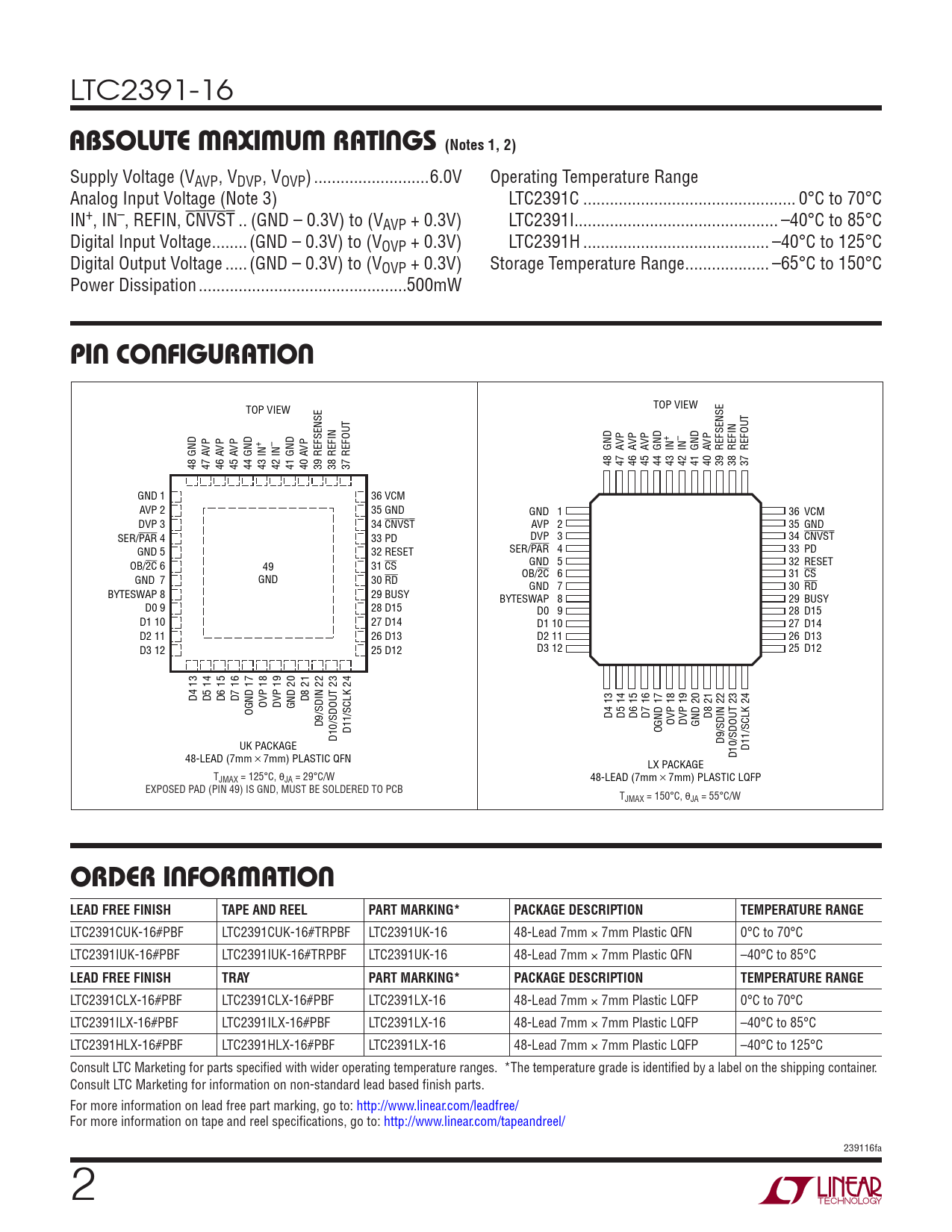 Supply Voltage (VAVP , VDVP , VOVP) ..6.0V Operating Temperature Range Analog Input Voltage (Note 3) LTC2391C .. 0°C to 70°C IN+, IN–, REFIN, CNVST .. (GND – 0.3V) to (VAVP + 0.3V) LTC2391I.. –40°C to 85°C Digital Input Voltage .. (GND – 0.3V) to (VOVP + 0.3V) LTC2391H .. –40°C to 125°C Digital Output Voltage ... (GND – 0.3V) to (VOVP + 0.3V) Storage Temperature Range ... –65°C to 150°C Power Dissipation ...500mW