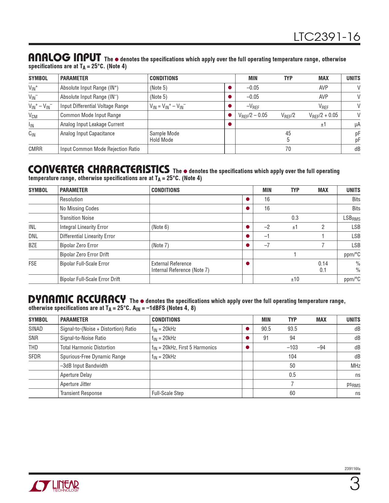 SINAD Signal-to-(Noise + Distortion) Ratio fIN = 20kHz l 90.5 93.5 dB SNR Signal-to-Noise Ratio fIN = 20kHz l 91 94 dB THD Total Harmonic Distortion fIN = 20kHz, First 5 Harmonics l –103 –94 dB SFDR Spurious-Free Dynamic Range fIN = 20kHz 104 dB –3dB Input Bandwidth 50 MHz Aperture Delay 0.5 ns Aperture Jitter 7 psRMS Transient Response Full-Scale Step 60 ns 239116fa 3
