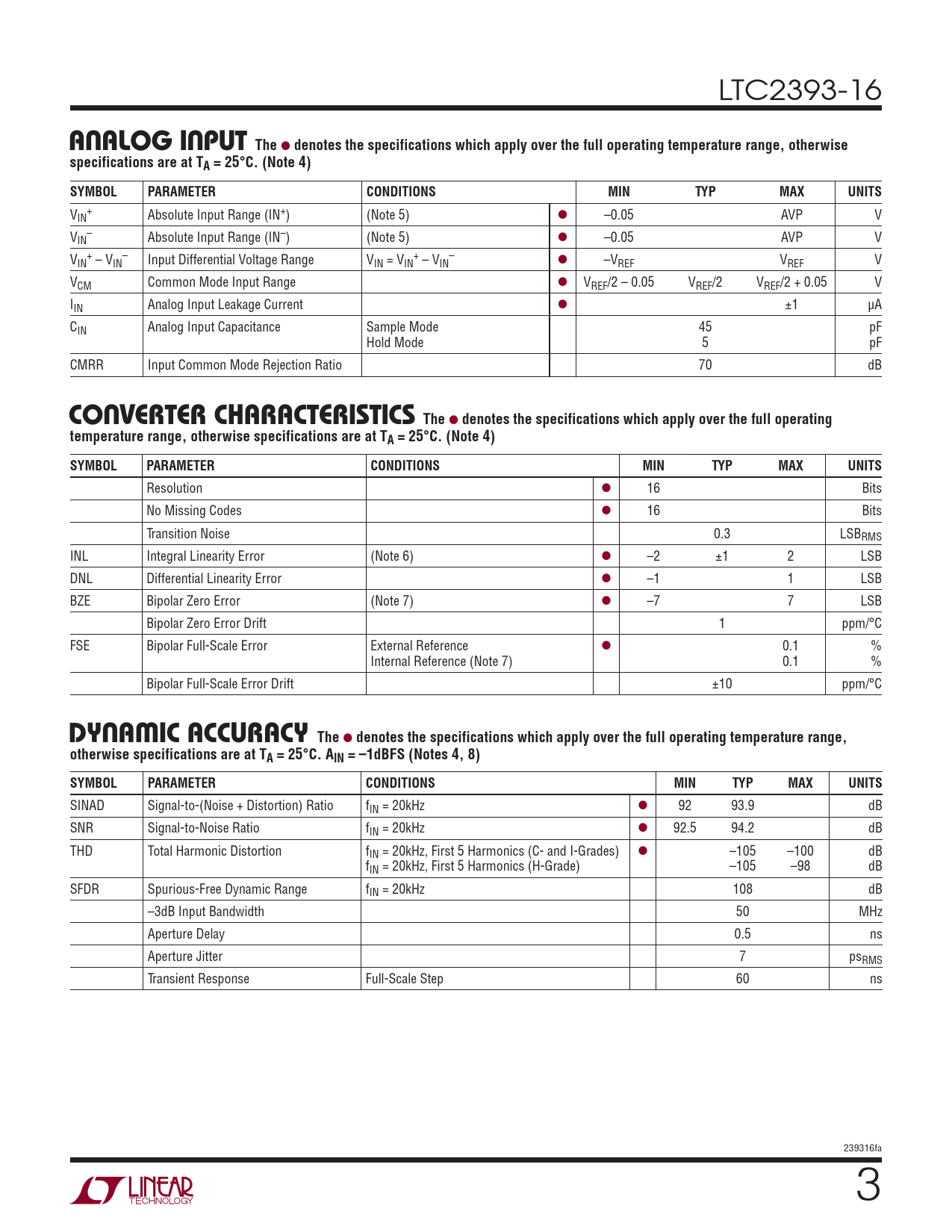 SINAD Signal-to-(Noise + Distortion) Ratio fIN = 20kHz l 92 93.9 dB SNR Signal-to-Noise Ratio fIN = 20kHz l 92.5 94.2 dB THD Total Harmonic Distortion fIN = 20kHz, First 5 Harmonics (C- and I-Grades) l –105 –100 dB fIN = 20kHz, First 5 Harmonics (H-Grade) –105 –98 dB SFDR Spurious-Free Dynamic Range fIN = 20kHz 108 dB –3dB Input Bandwidth 50 MHz Aperture Delay 0.5 ns Aperture Jitter 7 psRMS Transient Response Full-Scale Step 60 ns 239316fa 3