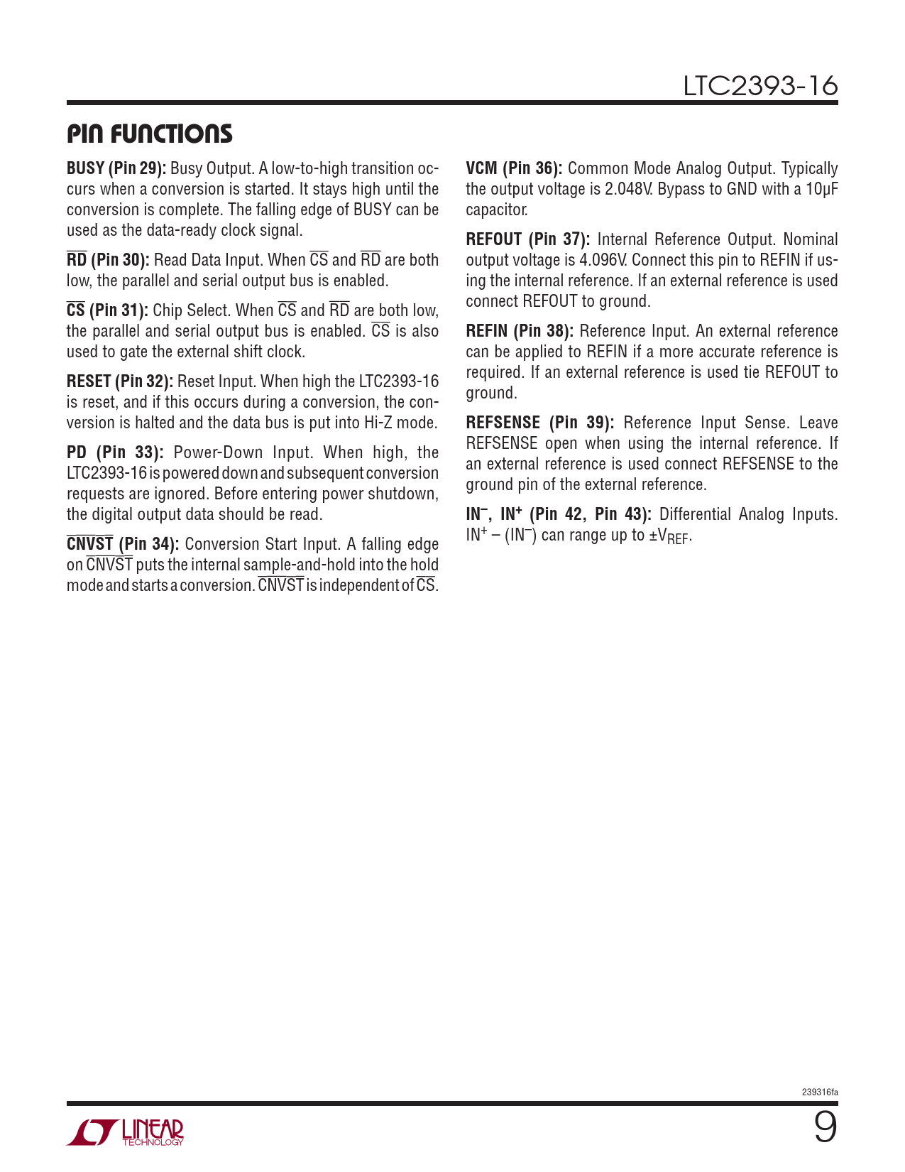 Pages / Page24 / 9 — PIN FUNCTIONS. BUSY (Pin 29):. VCM (Pin 36):. REFOUT (Pin 37):. RD (Pin …