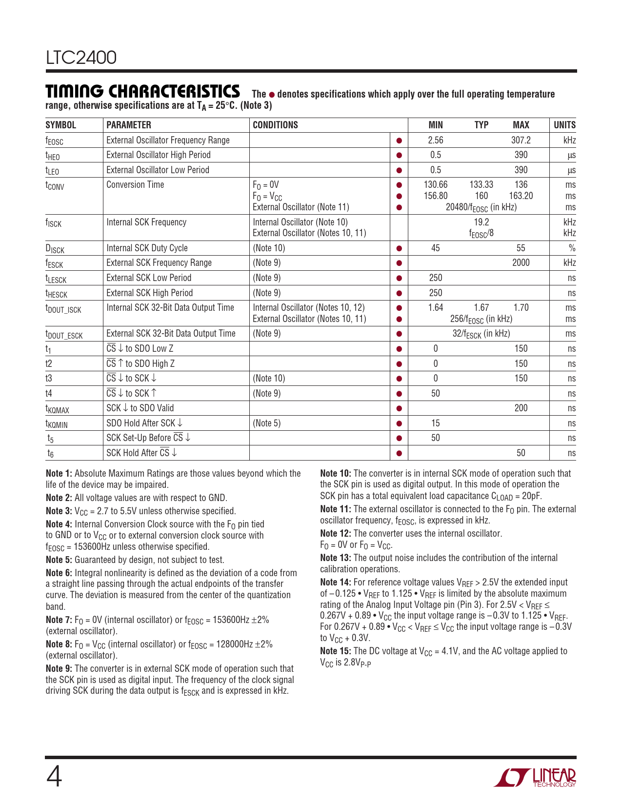 fEOSC External Oscillator Frequency Range ● 2.56 307.2 kHz tHEO External Oscillator High Period ● 0.5 390 µs tLEO External Oscillator Low Period ● 0.5 390 µs tCONV Conversion Time FO = 0V ● 130.66 133.33 136 ms FO = VCC ● 156.80 160 163.20 ms External Oscillator (Note 11) ● 20480/fEOSC (in kHz) ms fISCK Internal SCK Frequency Internal Oscillator (Note 10) 19.2 kHz External Oscillator (Notes 10, 11) fEOSC/8 kHz DISCK Internal SCK Duty Cycle (Note 10) ● 45 55 % fESCK External SCK Frequency Range (Note 9) ● 2000 kHz tLESCK External SCK Low Period (Note 9) ● 250 ns tHESCK External SCK High Period (Note 9) ● 250 ns tDOUT_ISCK Internal SCK 32-Bit Data Output Time Internal Oscillator (Notes 10, 12) ● 1.64 1.67 1.70 ms External Oscillator (Notes 10, 11) ● 256/fEOSC (in kHz) ms tDOUT_ESCK External SCK 32-Bit Data Output Time (Note 9) ● 32/fESCK (in kHz) ms t1 CS ↓ to SDO Low Z ● 0 150 ns t2 CS ↑ to SDO High Z ● 0 150 ns t3 CS ↓ to SCK ↓ (Note 10) ● 0 150 ns t4 CS ↓ to SCK ↑ (Note 9) ● 50 ns tKQMAX SCK ↓ to SDO Valid ● 200 ns tKQMIN SDO Hold After SCK ↓ (Note 5) ● 15 ns t5 SCK Set-Up Before CS ↓ ● 50 ns t6 SCK Hold After CS ↓ ● 50 ns