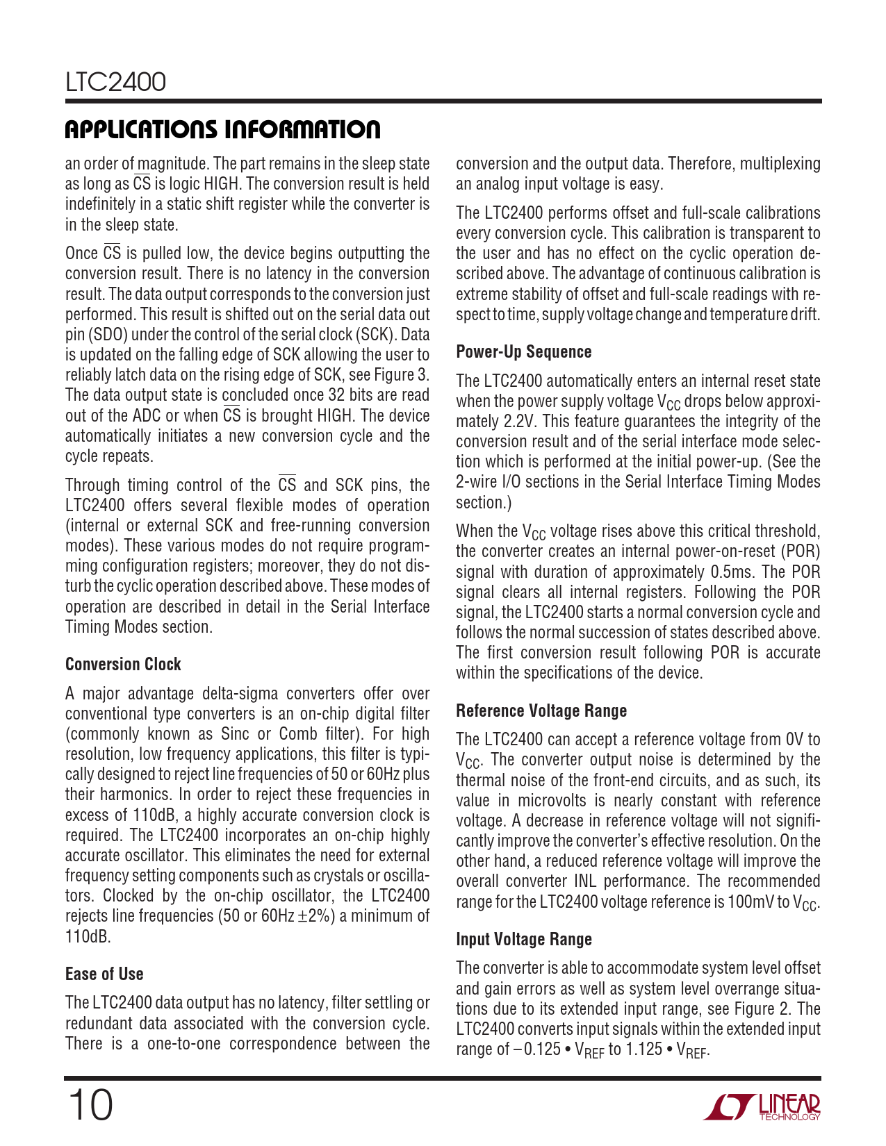 LTC2400 UUWUAPPLICATIONS INFORMATION an order of magnitude. The part remains in the sleep state conversion and the output data. Therefore, multiplexing as long as CS is logic HIGH. The conversion result is held an analog input voltage is easy. indefinitely in a static shift register while the converter is The LTC2400 performs offset and full-scale calibrations in the sleep state. every conversion cycle. This calibration is transparent to Once CS is pulled low, the device begins outputting the the user and has no effect on the cyclic operation de- conversion result. There is no latency in the conversion scribed above. The advantage of continuous calibration is result. The data output corresponds to the conversion just extreme stability of offset and full-scale readings with re- performed. This result is shifted out on the serial data out spect to time, supply voltage change and temperature drift. pin (SDO) under the control of the serial clock (SCK). Data is updated on the falling edge of SCK allowing the user to Power-Up Sequence reliably latch data on the rising edge of SCK, see Figure 3. The LTC2400 automatically enters an internal reset state The data output state is concluded once 32 bits are read when the power supply voltage VCC drops below approxi- out of the ADC or when CS is brought HIGH. The device mately 2.2V. This feature guarantees the integrity of the automatically initiates a new conversion cycle and the conversion result and of the serial interface mode selec- cycle repeats. tion which is performed at the initial power-up. (See the Through timing control of the CS and SCK pins, the 2-wire I/O sections in the Serial Interface Timing Modes LTC2400 offers several flexible modes of operation section.) (internal or external SCK and free-running conversion When the VCC voltage rises above this critical threshold, modes). These various modes do not require program- the converter creates an internal power-on-reset (POR) ming configuration registers; moreover, they do not dis- signal with duration of approximately 0.5ms. The POR turb the cyclic operation described above. These modes of signal clears all internal registers. Following the POR operation are described in detail in the Serial Interface signal, the LTC2400 starts a normal conversion cycle and Timing Modes section. follows the normal succession of states described above. The first conversion result following POR is accurate Conversion Clock within the specifications of the device. A major advantage delta-sigma converters offer over conventional type converters is an on-chip digital filter Reference Voltage Range (commonly known as Sinc or Comb filter). For high The LTC2400 can accept a reference voltage from 0V to resolution, low frequency applications, this filter is typi- VCC. The converter output noise is determined by the cally designed to reject line frequencies of 50 or 60Hz plus thermal noise of the front-end circuits, and as such, its their harmonics. In order to reject these frequencies in value in microvolts is nearly constant with reference excess of 110dB, a highly accurate conversion clock is voltage. A decrease in reference voltage will not signifi- required. The LTC2400 incorporates an on-chip highly cantly improve the converter’s effective resolution. On the accurate oscillator. This eliminates the need for external other hand, a reduced reference voltage will improve the frequency setting components such as crystals or oscilla- overall converter INL performance. The recommended tors. Clocked by the on-chip oscillator, the LTC2400 range for the LTC2400 voltage reference is 100mV to VCC. rejects line frequencies (50 or 60Hz ±2%) a minimum of 110dB. Input Voltage RangeEase of Use The converter is able to accommodate system level offset and gain errors as well as system level overrange situa- The LTC2400 data output has no latency, filter settling or tions due to its extended input range, see Figure 2. The redundant data associated with the conversion cycle. LTC2400 converts input signals within the extended input There is a one-to-one correspondence between the range of – 0.125 • VREF to 1.125 • VREF. 10