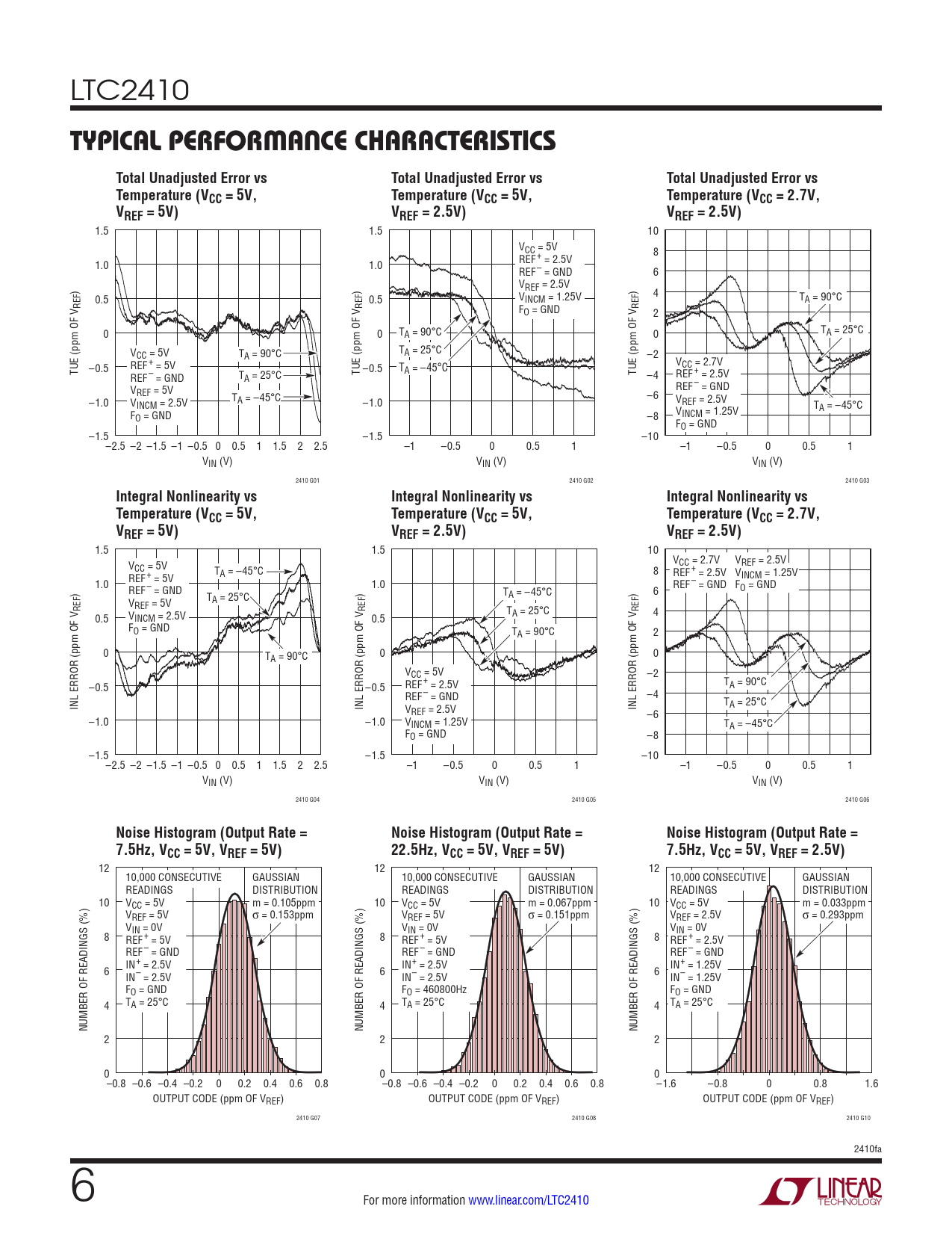 1.5 1.5 10 VCC = 5V 8 1.0 1.0 REF+ = 2.5V REF– = GND 6 ) VREF = 2.5V ) 4 0.5 0.5 VINCM = 1.25V TA = 90°C REF REF F REF O = GND 2 0 0 TA = 90°C 0 TA = 25°C V T CC = 5V TA = 90°C A = 25°C –2 VCC = 2.7V TUE (ppm OF V –0.5 REF+ = 5V –0.5 TA = –45°C REF– = GND T TUE (ppm OF V TUE (ppm OF V A = 25°C –4 REF+ = 2.5V V REF– = GND REF = 5V –6 –1.0 V T V INCM = 2.5V A = –45°C –1.0 REF = 2.5V TA = –45°C F V O = GND –8 INCM = 1.25V FO = GND –1.5 –1.5 –10 –2.5 –2 –1.5 –1 –0.5 0 0.5 1 1.5 2 2.5 –1 –0.5 0 0.5 1 –1 –0.5 0 0.5 1 VIN (V) VIN (V) VIN (V) 2410 G01 2410 G02 2410 G03