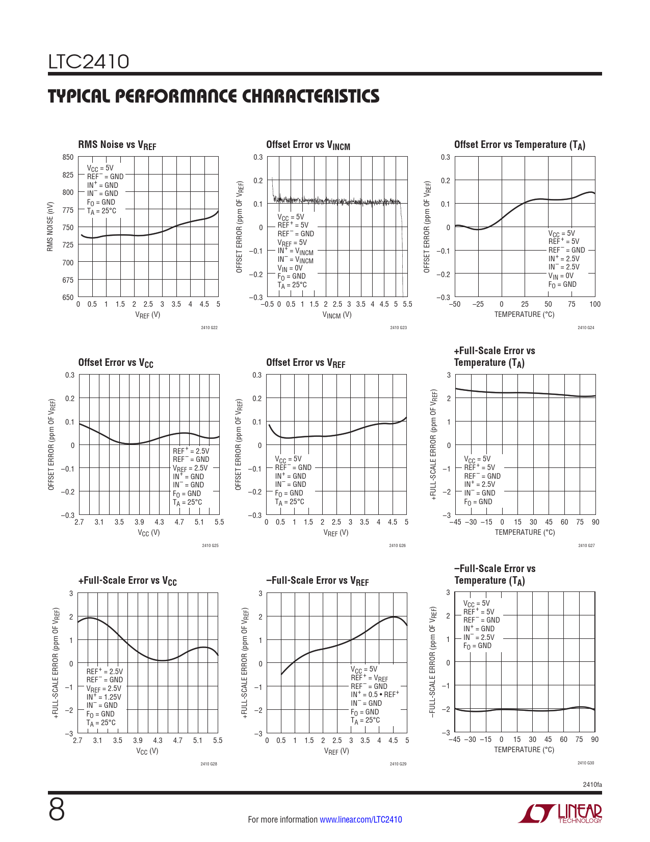 3 3 3 ) VCC = 5V REF+ = 5V REF 2 REF 2 REF 2 REF– = GND IN+ = GND 1 1 1 IN– = 2.5V FO = GND 0 0 0 REF+ = 2.5V VCC = 5V REF– = GND REF+ = VREF –1 V REF– = GND –1 REF = 2.5V –1 IN+ = 1.25V IN+ = 0.5 • REF+ IN– = GND IN– = GND –2 –2 –2 +FULL-SCALE ERROR (ppm OF V F F O = GND +FULL-SCALE ERROR (ppm OF V O = GND –FULL-SCALE ERROR (ppm OF V T T A = 25°C A = 25°C –3 –3 –3 2.7 3.1 3.5 3.9 4.3 4.7 5.1 5.5 0 0.5 1 1.5 2 2.5 3 3.5 4 4.5 5 –45 –30 –15 0 15 30 45 60 75 90 VCC (V) VREF (V) TEMPERATURE (°C) 2410 G28 2410 G29 2410 G30 2410fa 8 For more information www.linear.com/LTC2410 Document Outline Features Applications Typical Application Description Absolute Maximum Ratings Order Information Electrical Characteristics Pin Configuration Electrical Characteristics Converter Characteristics Analog Input and Reference Digital Inputs and Digital Outputs Power Requirements Timing Characteristics Typical Performance Characteristics Pin Functions Functional Block Diagram Test Circuit Applications Information Typical Applications Package Description PCB Layout and Film Revision History PCB Layout and Film Related Parts