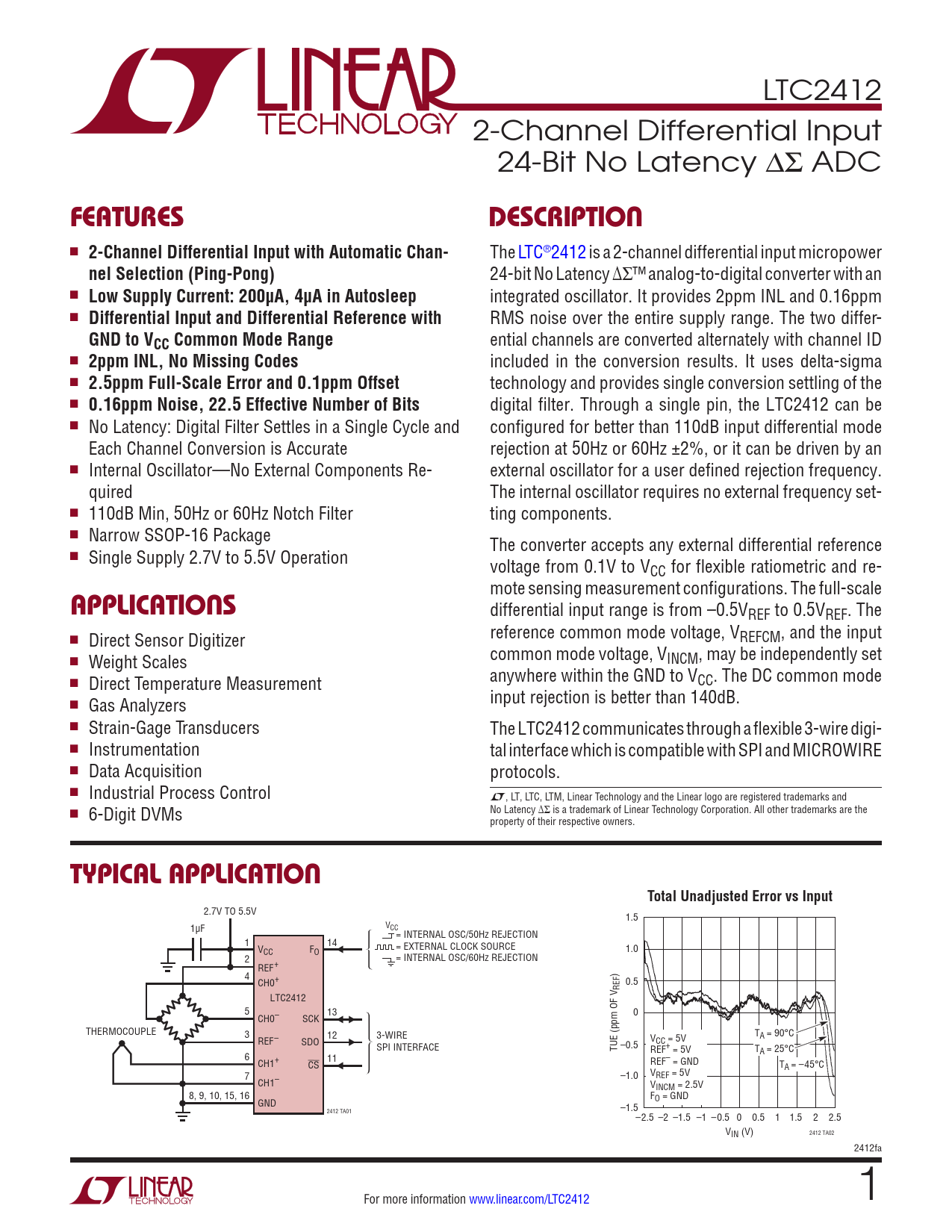 LTC2412 2-Channel Differential Input 24-Bit No Latency ∆Σ ADC FEATURESDESCRIPTION n 2-Channel Differential Input with Automatic Chan- The LTC®2412 is a 2-channel differential input micropower nel Selection (Ping-Pong) 24-bit No Latency ∆Σ™ analog-to-digital converter with an n Low Supply Current: 200µA, 4µA in Autosleep integrated oscillator. It provides 2ppm INL and 0.16ppm n Differential Input and Differential Reference with RMS noise over the entire supply range. The two differ- GND to VCC Common Mode Range ential channels are converted alternately with channel ID n 2ppm INL, No Missing Codes included in the conversion results. It uses delta-sigma n 2.5ppm Full-Scale Error and 0.1ppm Offset technology and provides single conversion settling of the n 0.16ppm Noise, 22.5 Effective Number of Bits digital filter. Through a single pin, the LTC2412 can be n No Latency: Digital Filter Settles in a Single Cycle and configured for better than 110dB input differential mode Each Channel Conversion is Accurate rejection at 50Hz or 60Hz ±2%, or it can be driven by an n Internal Oscillator—No External Components Re- external oscillator for a user defined rejection frequency. quired The internal oscillator requires no external frequency set- n 110dB Min, 50Hz or 60Hz Notch Filter ting components. n Narrow SSOP-16 Package The converter accepts any external differential reference n Single Supply 2.7V to 5.5V Operation voltage from 0.1V to VCC for flexible ratiometric and re- mote sensing measurement configurations. The full-scale APPLICATIONS differential input range is from –0.5VREF to 0.5VREF. The n reference common mode voltage, VREFCM, and the input Direct Sensor Digitizer n common mode voltage, VINCM, may be independently set Weight Scales n anywhere within the GND to VCC. The DC common mode Direct Temperature Measurement n input rejection is better than 140dB. Gas Analyzers n Strain-Gage Transducers The LTC2412 communicates through a flexible 3-wire digi- n Instrumentation tal interface which is compatible with SPI and MICROWIRE n Data Acquisition protocols. n Industrial Process Control L, LT, LTC, LTM, Linear Technology and the Linear logo are registered trademarks and No Latency ∆Σ is a trademark of Linear Technology Corporation. All other trademarks are the n 6-Digit DVMs property of their respective owners. TYPICAL APPLICATIONTotal Unadjusted Error vs Input 2.7V TO 5.5V 1.5 1µF VCC= INTERNAL OSC/50Hz REJECTION 1 14 V = EXTERNAL CLOCK SOURCE CC FO 1.0 2 = INTERNAL OSC/60Hz REJECTION REF+ 4 ) CH0+ 0.5 REF LTC2412 5 13 0 CH0– SCK THERMOCOUPLE 3 12 T REF– 3-WIRE A = 90°C SDO V SPI INTERFACE CC = 5V TUE (ppm OF V –0.5 REF+ = 5V T 6 A = 25°C CH1+ 11 CS REF– = GND TA = –45°C 7 –1.0 VREF = 5V CH1– VINCM = 2.5V 8, 9, 10, 15, 16 F GND O = GND 2412 TA01 –1.5–2.5 –2 –1.5 –1 –0.5 0 0.5 1 1.5 2 2.5 VIN (V) 2412 TA02 2412fa For more information www.linear.com/LTC2412 1 Document Outline Features Applications Typical Application Description Absolute Maximum Ratings Order Information Electrical Characteristics Pin Configuration Converter Characteristics Analog Input and Reference Digital Inputs and Digital Outputs Power Requirements Timing Characteristics Typical Performance Characteristics Pin Functions Functional Block Diagram Test Circuit Applications Information Package Description Revision History Typical Application Related Parts