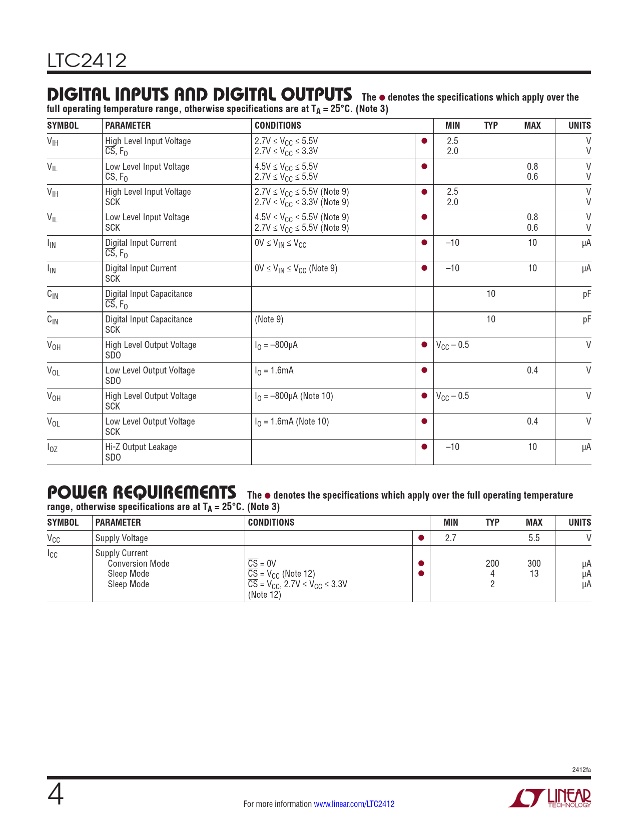 LTC2412 DIGITALINPUTS AND DIGITAL OUTPUTS The l denotes the specifications which apply over thefull operating temperature range, otherwise specifications are at TA = 25°C. (Note 3) SYMBOLPARAMETERCONDITIONSMINTYPMAXUNITS VIH High Level Input Voltage 2.7V ≤ VCC ≤ 5.5V l 2.5 V CS, FO 2.7V ≤ VCC ≤ 3.3V 2.0 V VIL Low Level Input Voltage 4.5V ≤ VCC ≤ 5.5V l 0.8 V CS, FO 2.7V ≤ VCC ≤ 5.5V 0.6 V VIH High Level Input Voltage 2.7V ≤ VCC ≤ 5.5V (Note 9) l 2.5 V SCK 2.7V ≤ VCC ≤ 3.3V (Note 9) 2.0 V VIL Low Level Input Voltage 4.5V ≤ VCC ≤ 5.5V (Note 9) l 0.8 V SCK 2.7V ≤ VCC ≤ 5.5V (Note 9) 0.6 V IIN Digital Input Current 0V ≤ VIN ≤ VCC l –10 10 µA CS, FO IIN Digital Input Current 0V ≤ VIN ≤ VCC (Note 9) l –10 10 µA SCK CIN Digital Input Capacitance 10 pF CS, FO CIN Digital Input Capacitance (Note 9) 10 pF SCK VOH High Level Output Voltage IO = –800µA l VCC – 0.5 V SDO VOL Low Level Output Voltage IO = 1.6mA l 0.4 V SDO VOH High Level Output Voltage IO = –800µA (Note 10) l VCC – 0.5 V SCK VOL Low Level Output Voltage IO = 1.6mA (Note 10) l 0.4 V SCK IOZ Hi-Z Output Leakage l –10 10 µA SDO POWERREQUIREMENTS The l denotes the specifications which apply over the full operating temperaturerange, otherwise specifications are at TA = 25°C. (Note 3) SYMBOLPARAMETERCONDITIONSMINTYPMAXUNITS VCC Supply Voltage l 2.7 5.5 V ICC Supply Current Conversion Mode CS = 0V l 200 300 µA Sleep Mode CS = VCC (Note 12) l 4 13 µA Sleep Mode CS = VCC, 2.7V ≤ VCC ≤ 3.3V 2 µA (Note 12) 2412fa 4 For more information www.linear.com/LTC2412 Document Outline Features Applications Typical Application Description Absolute Maximum Ratings Order Information Electrical Characteristics Pin Configuration Converter Characteristics Analog Input and Reference Digital Inputs and Digital Outputs Power Requirements Timing Characteristics Typical Performance Characteristics Pin Functions Functional Block Diagram Test Circuit Applications Information Package Description Revision History Typical Application Related Parts