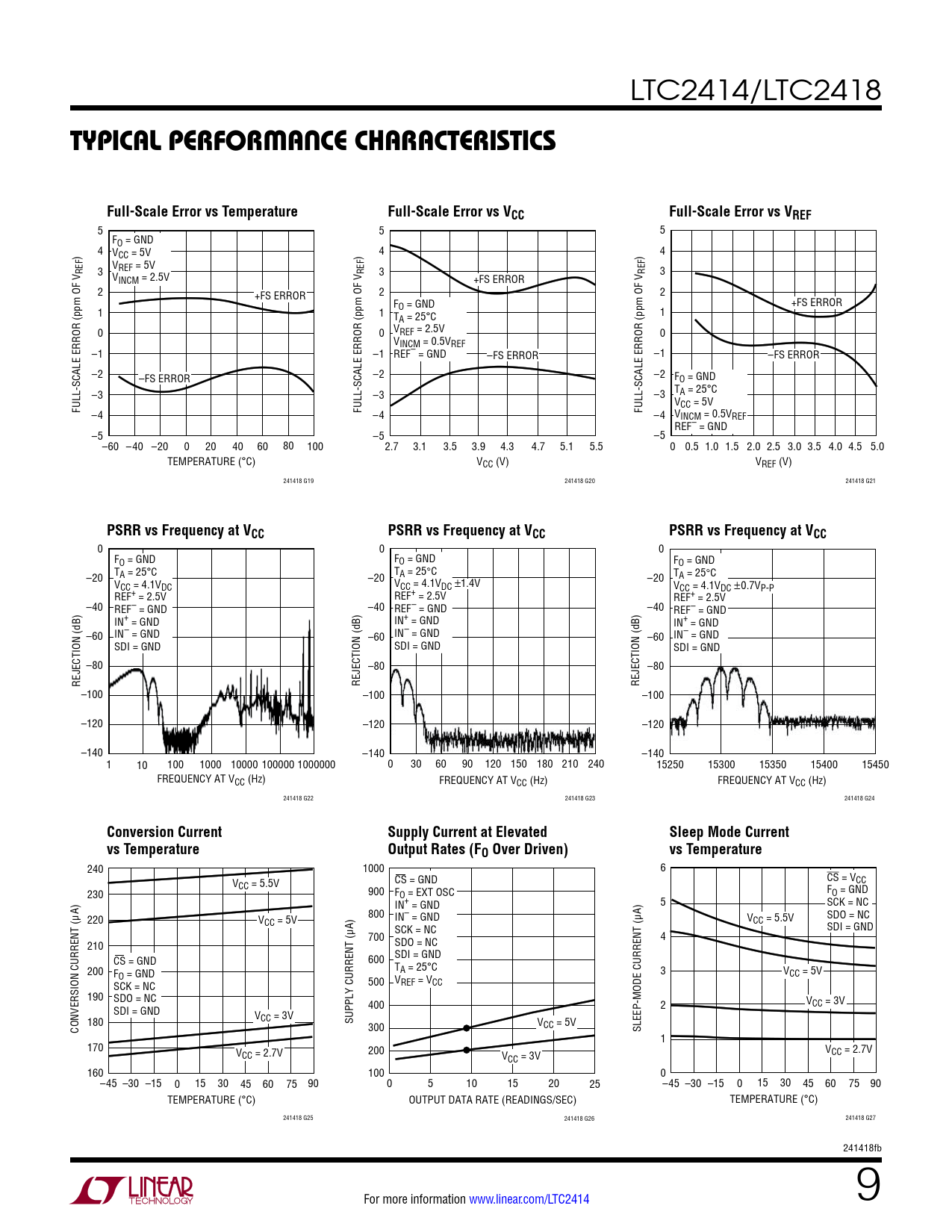 5 5 5 FO = GND ) 4 VCC = 5V ) 4 ) 4 V REF 3 REF = 5V V REF 3 REF 3 INCM = 2.5V +FS ERROR 2 +FS ERROR 2 2 F +FS ERROR 1 1 O = GND T 1 A = 25°C 0 0 VREF = 2.5V 0 VINCM = 0.5VREF –1 –1 REF– = GND –FS ERROR –1 –FS ERROR –2 –FS ERROR –2 –2 FO = GND –3 –3 –3 TA = 25°C V FULL-SCALE ERROR (ppm OF V CC = 5V –4 FULL-SCALE ERROR (ppm OF V –4 FULL-SCALE ERROR (ppm OF V –4 VINCM = 0.5VREF REF– = GND –5 –5 –5 –60 –40 –20 0 20 40 60 80 100 2.7 3.1 3.5 3.9 4.3 4.7 5.1 5.5 0 0.5 1.0 1.5 2.0 2.5 3.0 3.5 4.0 4.5 5.0 TEMPERATURE (°C) VCC (V) VREF (V) 241418 G19 241418 G20 241418 G21