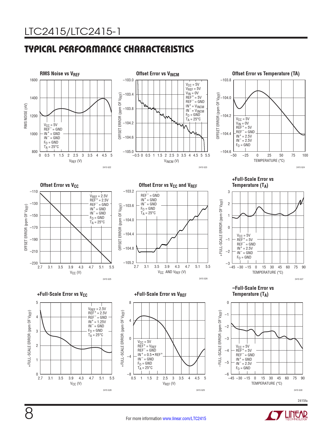 LTC2415/LTC2415-1 TYPICAL PERFORMANCE CHARACTERISTICSRMS Noise vs VREFOffset Error vs VINCMOffset Error vs Temperature (TA) 1600 –103.0 –103.8 VCC = 5V VREF = 5V ) –103.4 VIN = 0V ) 1400 REF REF+ = 5V REF –104.0 REF– = GND IN+ = V –103.8 INCM IN– = VINCM F 1200 O = GND –104.2 TA = 25°C VCC = 5V –104.2 VIN = 0V V RMS NOISE (nV) CC = 5V REF+ = 5V REF– = GND 1000 IN+ = GND –104.4 REF– = GND IN– = GND OFFSET ERROR (ppm OF V –104.6 OFFSET ERROR (ppm OF V IN+ = 2.5V IN– = 2.5V FO = GND FO = GND TA = 25°C 800 –105.0 –104.6 0 0.5 1 1.5 2 2.5 3 3.5 4 4.5 5 –0.5 0 0.5 1 1.5 2 2.5 3 3.5 4 4.5 5 5.5 –50 –25 0 25 50 75 100 VREF (V) VINCM (V) TEMPERATURE (°C) 2415 G22 2415 G23 2415 G24 +Full-Scale Error vsOffset Error vs VCCOffset Error vs VCC and VREFTemperature (TA) –110 –103.2 3 VREF = 2.5V REF– = GND REF+ = 2.5V IN+ = GND ) –130 REF– = GND ) –103.6 IN– = GND REF 2 REF IN+ = GND REF FO = GND T –150 IN– = GND A = 25°C F 1 O = GND T –104.0 A = 25°C –170 0 –104.4 VCC = 5V –190 –1 REF+ = 5V REF– = GND OFFSET ERROR (ppm OF V –104.8 IN+ = 2.5V –210 OFFSET ERROR (ppm OF V –2 +FULL-SCALE ERROR (ppm OF V IN– = GND FO = GND –230 –105.2 –3 2.7 3.1 3.5 3.9 4.3 4.7 5.1 5.5 2.7 3.1 3.5 3.9 4.3 4.7 5.1 5.5 –45 –30 –15 0 15 30 45 60 75 90 VCC (V) VCC AND VREF (V) TEMPERATURE (°C) 2415 G25 2415 G26 2415 G27 –Full-Scale Error vs+Full-Scale Error vs VCC+Full-Scale Error vs VREFTemperature (TA) 5 8 0 ) VREF = 2.5V ) REF+ = 2.5V REF –1 4 REF– = GND REF REF IN+ = 1.25V 4 IN– = GND –2 3 FO = GND TA = 25°C 0 –3 VCC = 5V 2 REF+ = VREF VCC = 5V REF– = GND –4 REF+ = 5V –4 IN+ = 0.5 • REF+ REF– = GND 1 IN– = GND IN+ = GND –5 +FULL-SCALE ERROR (ppm OF V +FULL-SCALE ERROR (ppm OF V FO = GND IN– = 2.5V T –FULL-SCALE ERROR (ppm OF V A = 25°C FO = GND 0 –8 –6 2.7 3.1 3.5 3.9 4.3 4.7 5.1 5.5 0.5 1 1.5 2 2.5 3 3.5 4 4.5 5 –45 –30 –15 0 15 30 45 60 75 90 VCC (V) VREF (V) TEMPERATURE (°C) 2415 G28 2415 G29 2415 G30 2415fa 8 For more information www.linear.com/LTC2415 Document Outline Features Applications Typical Application Description Absolute Maximum Ratings Order Information Electrical Characteristics Pin Configuration Converter Characteristics The l denotes the specifications which apply over the full operating temperature range, otherwise specifications are at TA = 25°C. (Notes 3,4) Analog Input and Reference The l denotes the specifications which apply over the full operating temperature range, otherwise specifications are at TA = 25°C. (Notes 3,4) Electrical Characteristics Digital Inputs and Digital Outputs The l denotes the specifications which apply over the full operating temperature range, otherwise specifications are at TA = 25°C. (Notes 3) Power Requirements The l denotes the specifications which apply over the full operating temperature range, otherwise specifications are at TA = 25°C. (Note 3) Analog Input and Reference The l denotes the specifications which apply over the full operating temperature range, otherwise specifications are at TA = 25°C. (Notes 3,4) Timing Characteristics The l denotes the specifications which apply over the full operating temperature range, otherwise specifications are at TA = 25°C. (Notes 3,4) Typical Performance Characteristics Pin Functions Functional Block Diagram Test Circuits Applications Information Typical Applications PCB Layout and Film Package Description Revision History Typical Application Related Parts